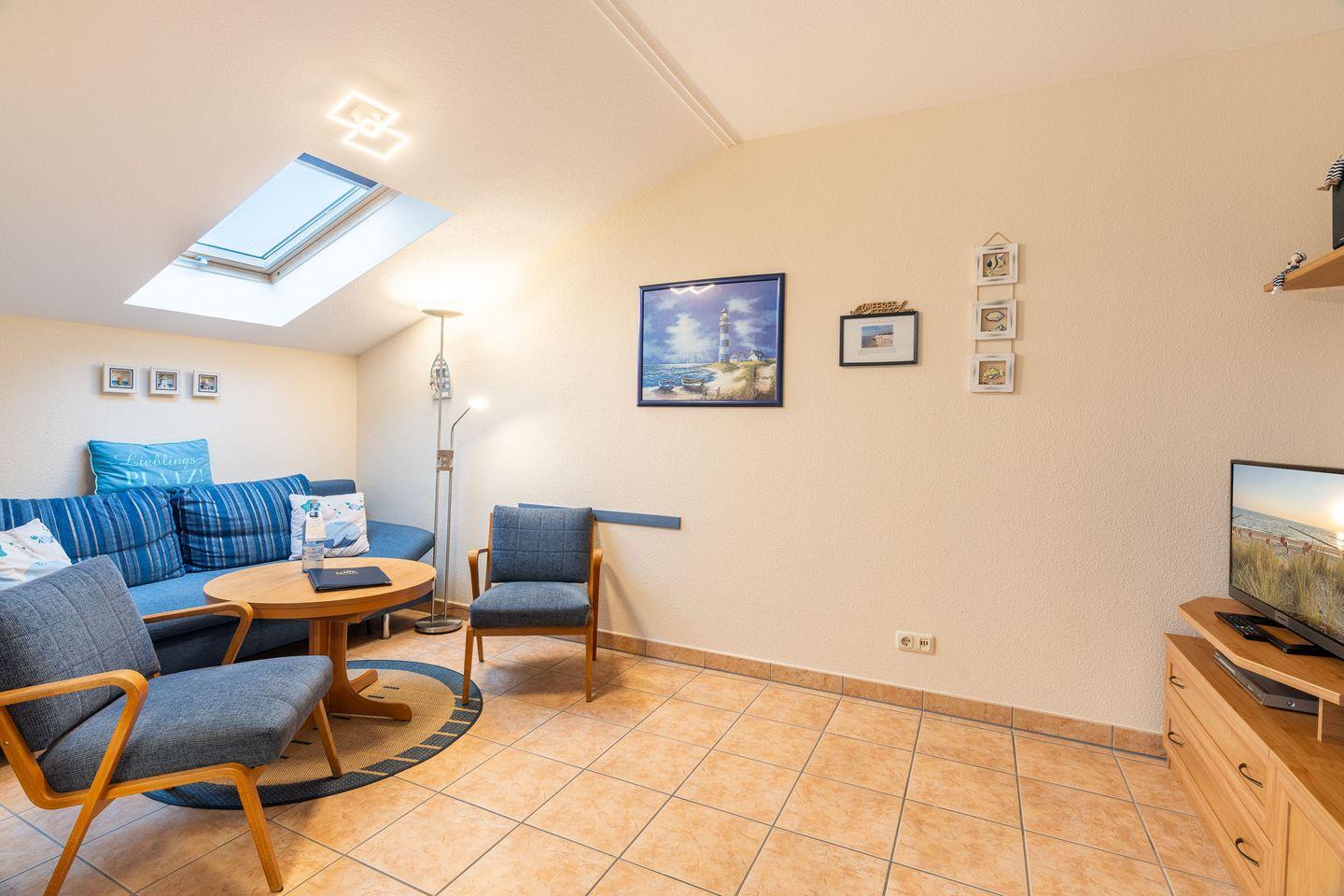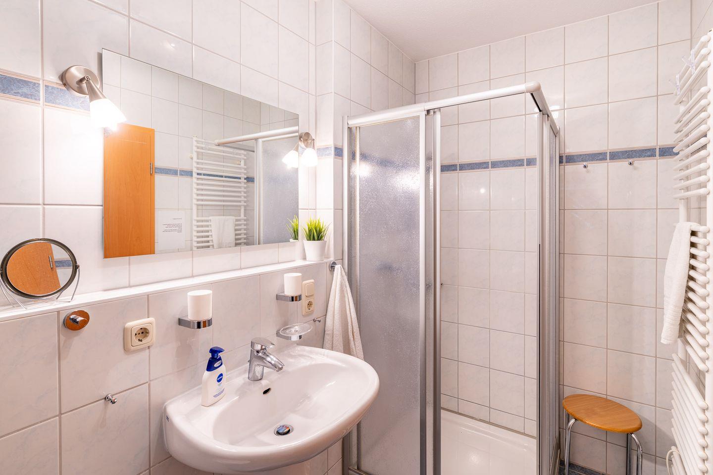 Ein modernes Badezimmer mit Dusche, Fenster und Spiegel rundet das Raumkonzept ab und sorgt für einen angenehmen Start in den Tag. Für längere Aufenthalte stehen Ihnen im Haus gegen Gebühr eine Waschmaschine und ein Trockner zur Verfügung, die den Alltag erleichtern. Ein abschließbarer Fahrradraum ermöglicht es Ihnen, Ihre Fahrräder sicher unterzubringen, während Sie die vielfältigen Angebote der Insel erkunden. Ein reservierter Stellplatz garantiert zudem einen stressfreien Zugang für Ihr Fahrzeug, und ein TV-Gerät im Wohnbereich sorgt für gemütliche Unterhaltung an ruhigen Abenden.