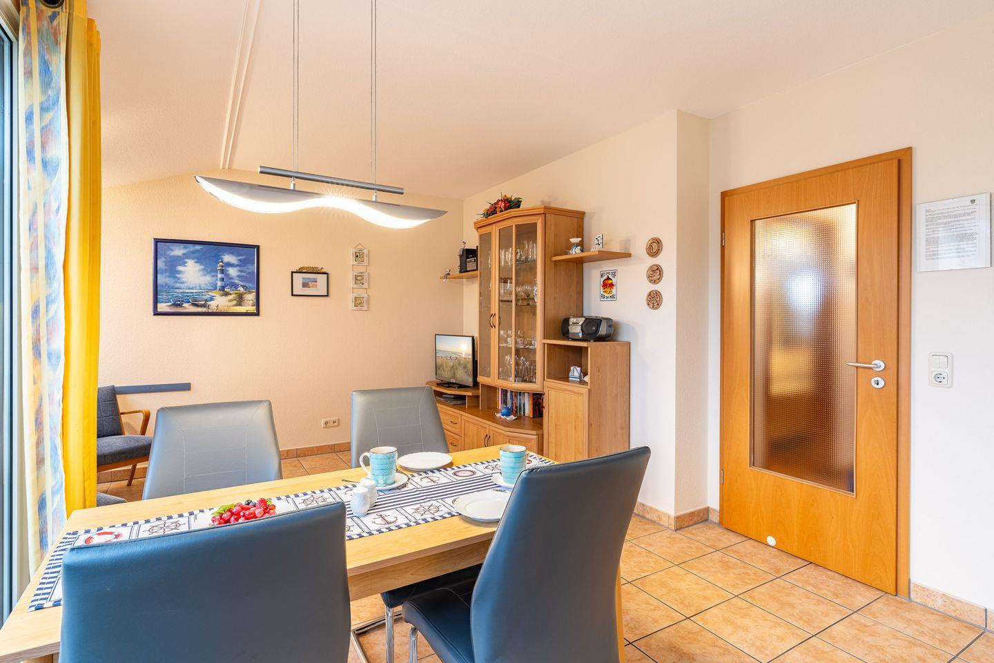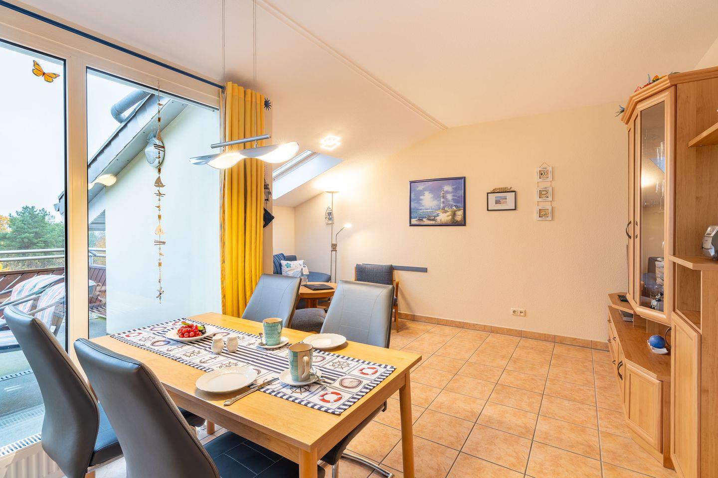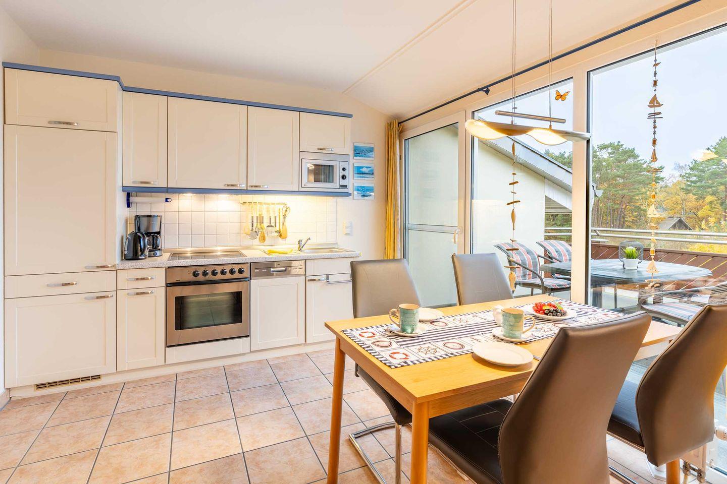 Der offen gestaltete Wohn- und Küchenbereich bildet das Herzstück der Ferienwohnung. Hier können Sie in einer hellen und einladenden Atmosphäre kulinarische Genüsse zubereiten, denn die voll ausgestattete Küche lässt keine Wünsche offen. Mit Geräten wie Backofen, Spülmaschine, Ceranfeld und Mikrowelle ausgestattet, ist das Kochen hier ein Vergnügen. Die offene Gestaltung zur Wohnzone fördert gesellige Stunden, sei es beim gemeinsamen Kochen oder entspannten Beisammensein. Vom Wohnbereich aus gelangen Sie auf den Balkon, der Ihnen einen herrlichen Blick ins Freie bietet und zum Genießen der frischen Meeresbrise einlädt – ideal für ein Frühstück im Freien oder einen lauen Abend bei Sonnenuntergang.