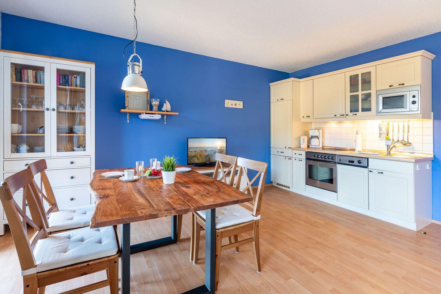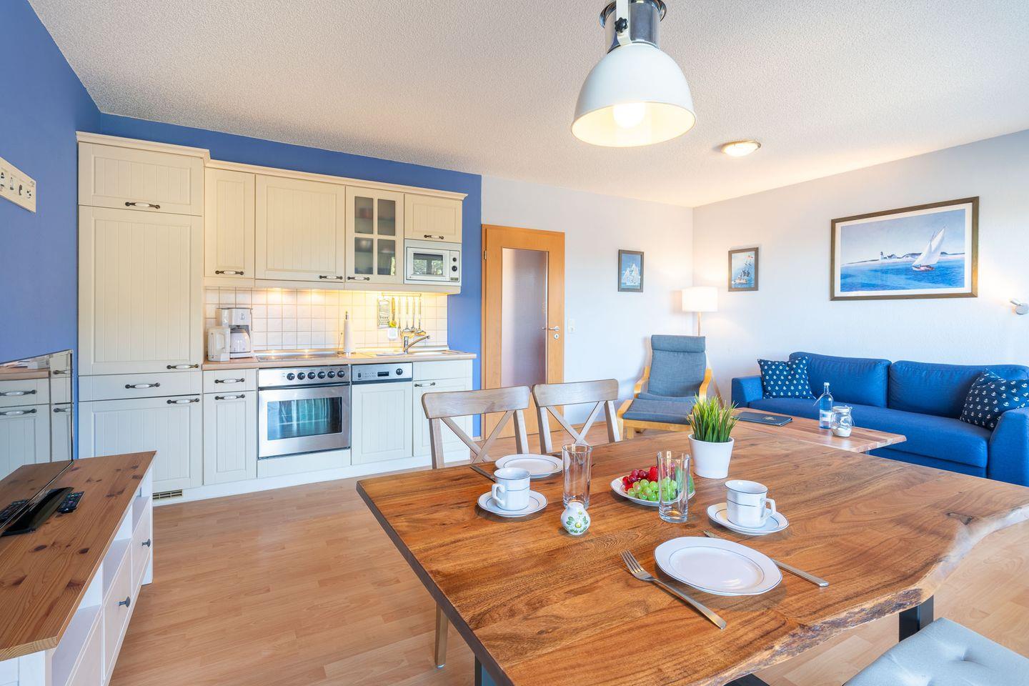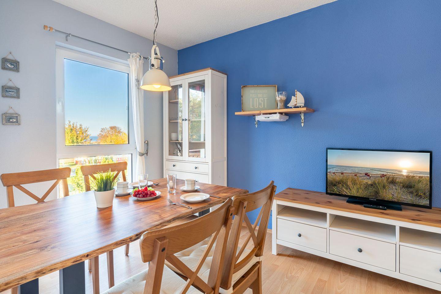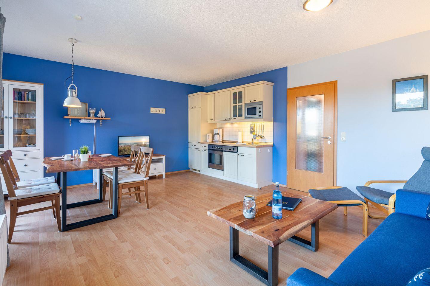 Der offene Wohn- und Küchenbereich besticht durch seine praktische und lichtdurchflutete Gestaltung. Die moderne Küche, ausgestattet mit allen wichtigen Geräten wie Backofen, Spülmaschine und Ceranfeld, ist offen in den Wohnbereich integriert. Dies ermöglicht nicht nur eine unkomplizierte Zubereitung kulinarischer Köstlichkeiten, sondern fördert auch gesellige Stunden mit Familie und Freunden. Vom Wohnbereich aus gelangen Sie auf einen Balkon, der zum Verweilen und Genießen der frischen Ostseeluft einlädt und einen angenehmen Blick in die unmittelbare Umgebung und das Meer bietet.