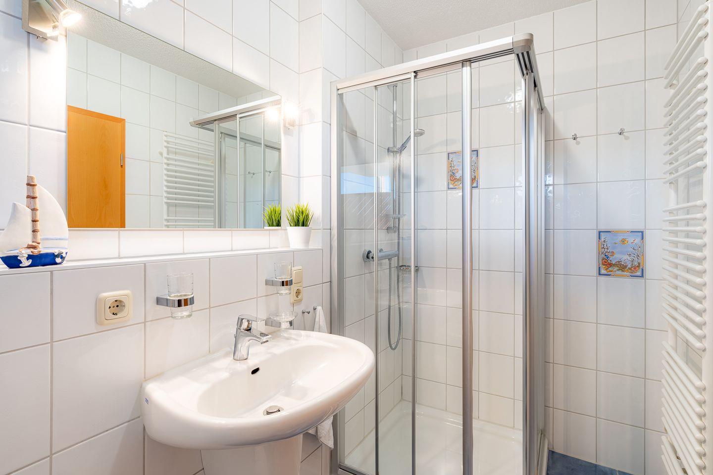 Das moderne Badezimmer ist funktional gestaltet und verfügt über eine Dusche, WC und Spiegel, was einen praktischen Start in den Tag ermöglicht. Gegen eine geringe Gebühr können Sie zudem im Haus eine Waschmaschine und einen Trockner nutzen – ideal für einen längeren Aufenthalt. Ein abschließbarer Fahrradraum rundet das Angebot ab und bietet Ihnen die Möglichkeit, Ihr Fahrrad sicher zu verwahren, während Sie die vielfältigen Aktivitäten auf der Insel erkunden.