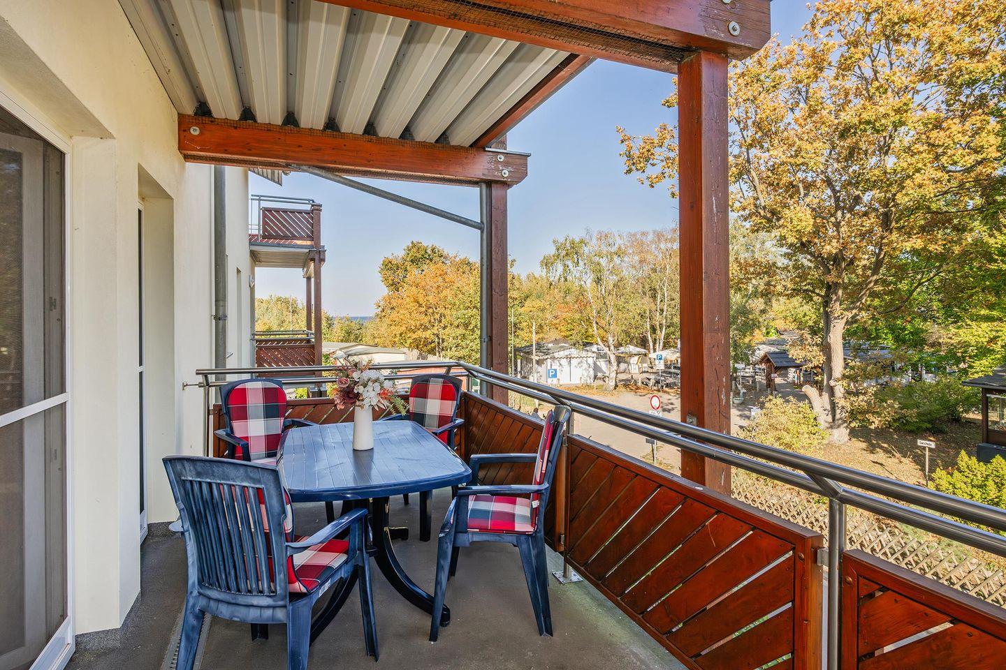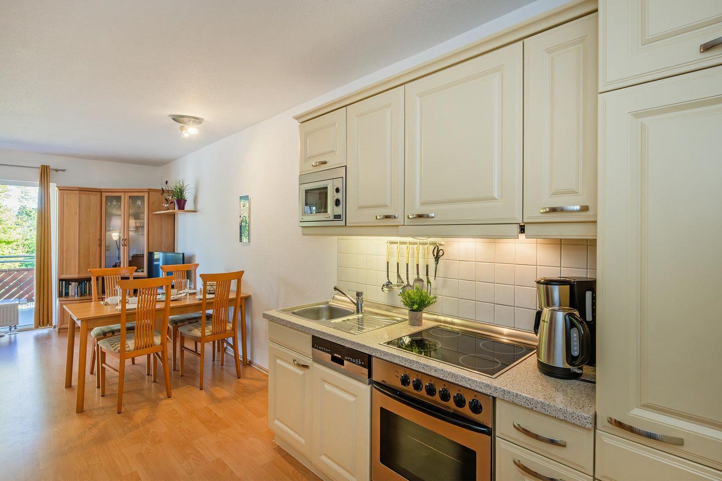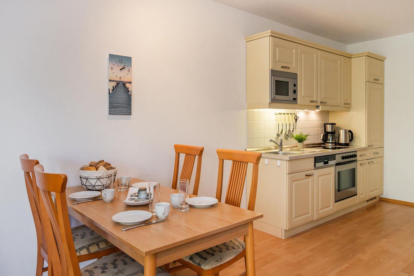 Der offen gestaltete Wohn- und Küchenbereich schafft eine einladende Atmosphäre und lädt zu geselligen Stunden ein. Die moderne Küche ist mit hochwertigen Geräten wie Backofen, Spülmaschine, Ceranfeld und Mikrowelle ausgestattet. Hier können Sie nach Herzenslust kochen und Ihre Mahlzeiten genießen. Vom Wohnbereich aus gelangen Sie direkt auf den Balkon, der Ihnen eine herrliche Möglichkeit bietet, die frische Ostseeluft und entspannte Momente zu genießen.