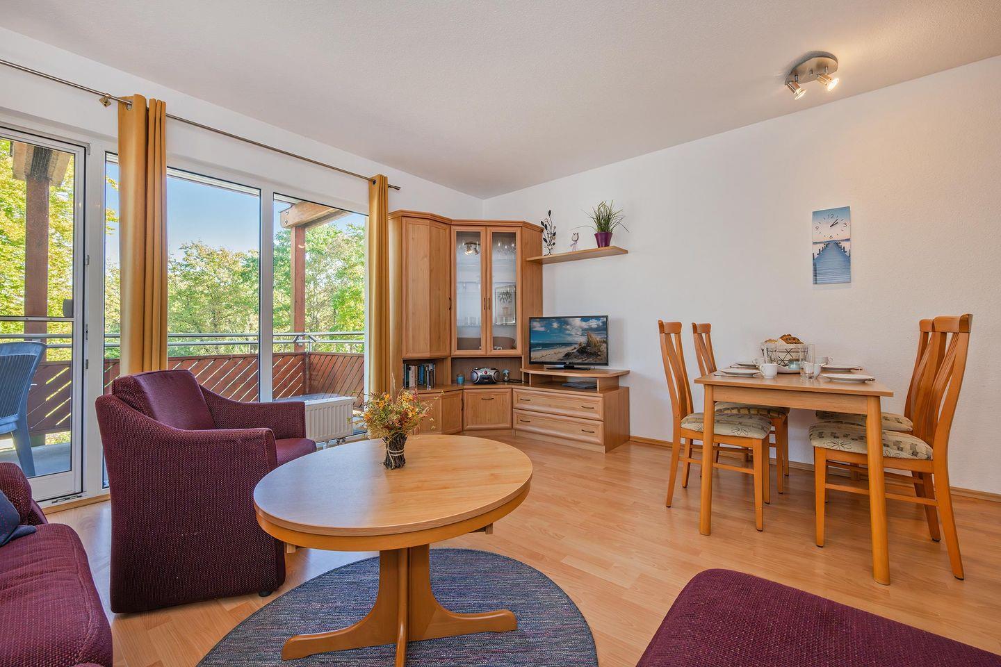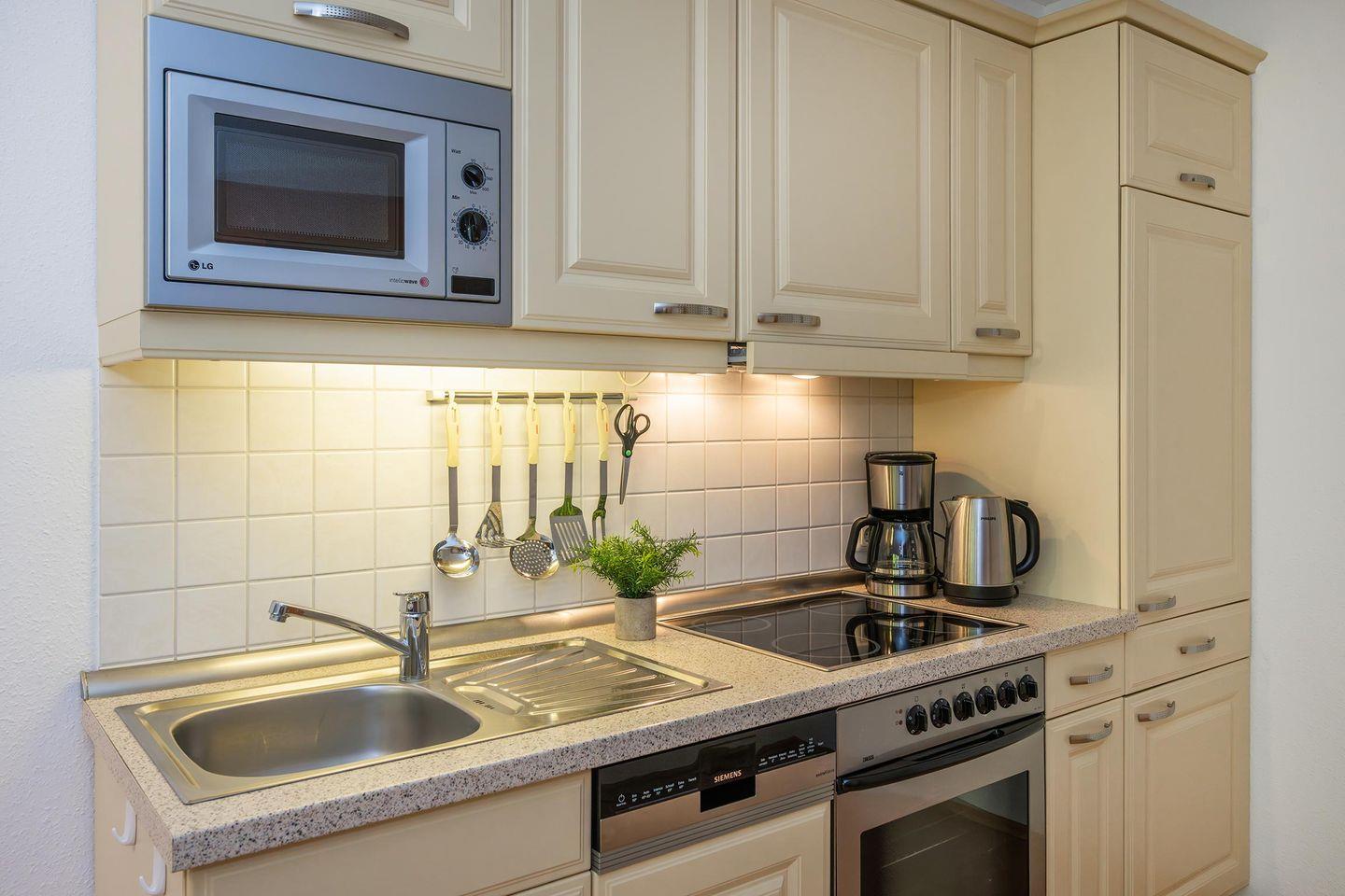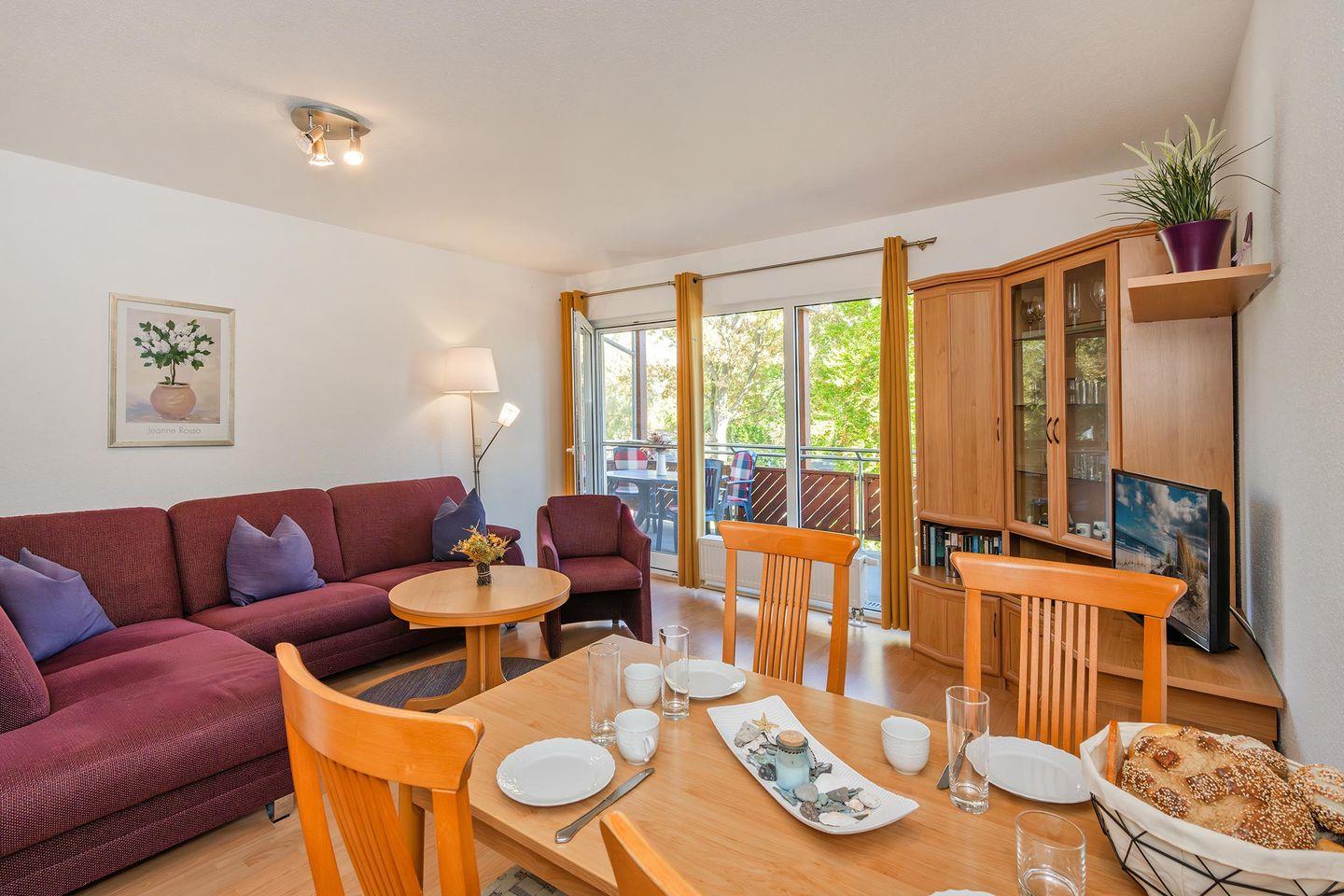 Der offen gestaltete Wohn- und Küchenbereich schafft eine einladende Atmosphäre und lädt zu geselligen Stunden ein. Die moderne Küche ist mit hochwertigen Geräten wie Backofen, Spülmaschine, Ceranfeld und Mikrowelle ausgestattet. Hier können Sie nach Herzenslust kochen und Ihre Mahlzeiten genießen. Vom Wohnbereich aus gelangen Sie direkt auf den Balkon, der Ihnen eine herrliche Möglichkeit bietet, die frische Ostseeluft und entspannte Momente zu genießen.