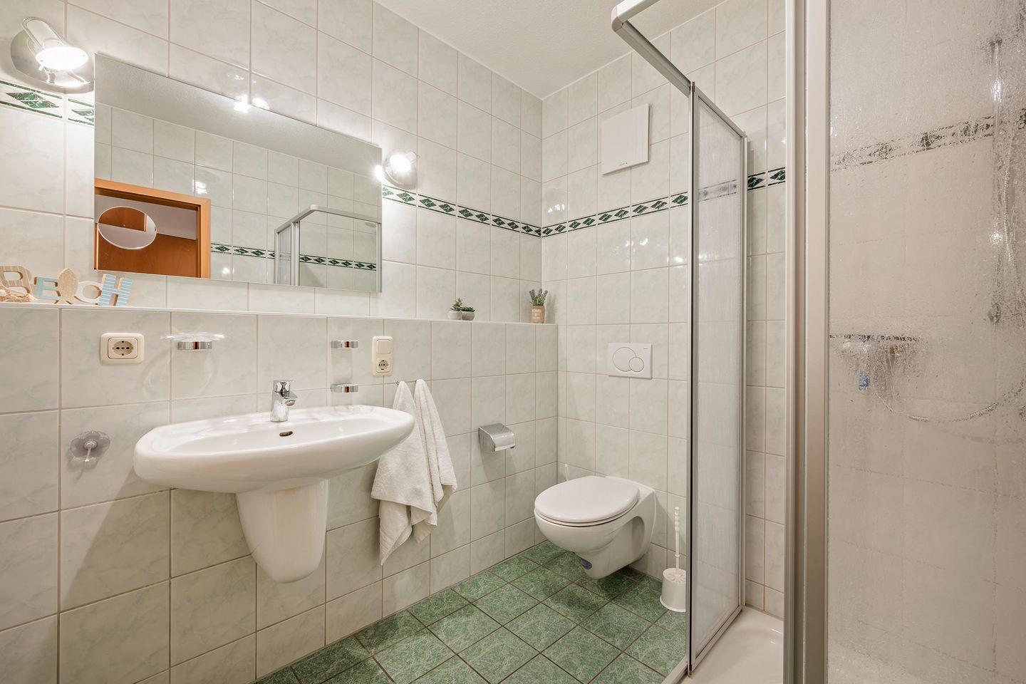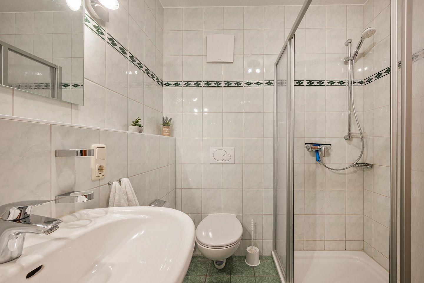 Das Badezimmer ist mit einer Dusche ausgestattet und bietet Ihnen alles, was Sie für einen angenehmen Start in den Tag benötigen. Zusätzlich stehen Ihnen im Haus eine Waschmaschine und ein Trockner gegen Gebühr zur Verfügung, was besonders für längere Aufenthalte praktisch ist.