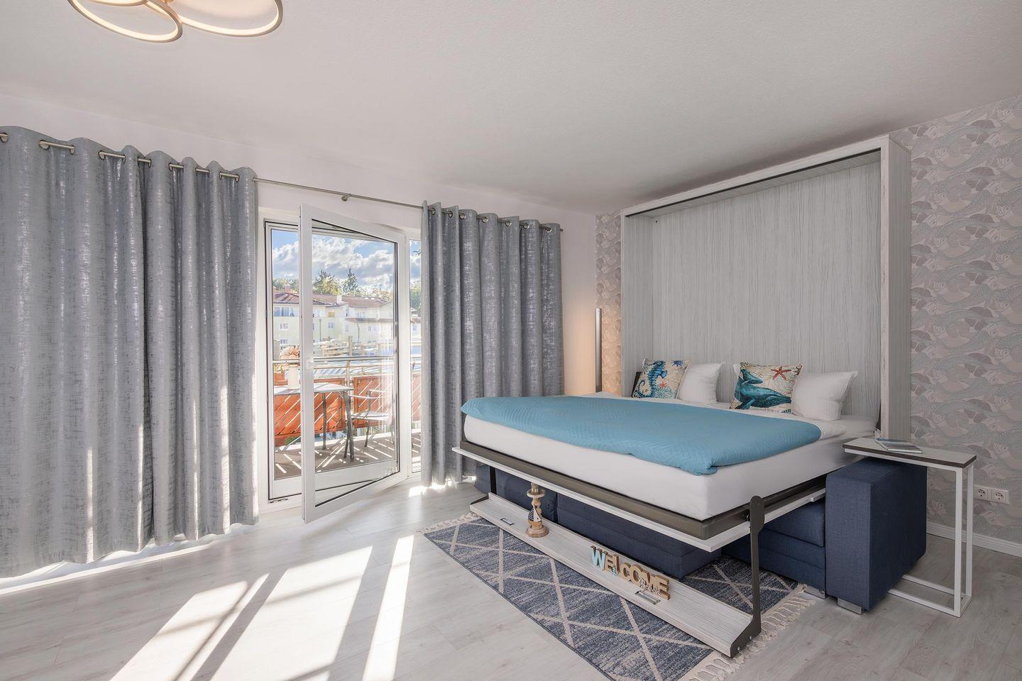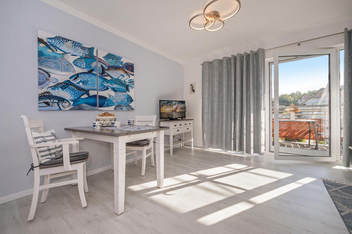 Vom Wohnbereich gelangen Sie direkt auf den Balkon, der Ihnen frische Ostseeluft und entspannte Momente bietet. Genießen Sie hier Ihren Morgenkaffee oder lassen Sie den Tag bei einem Glas Wein ausklingen.