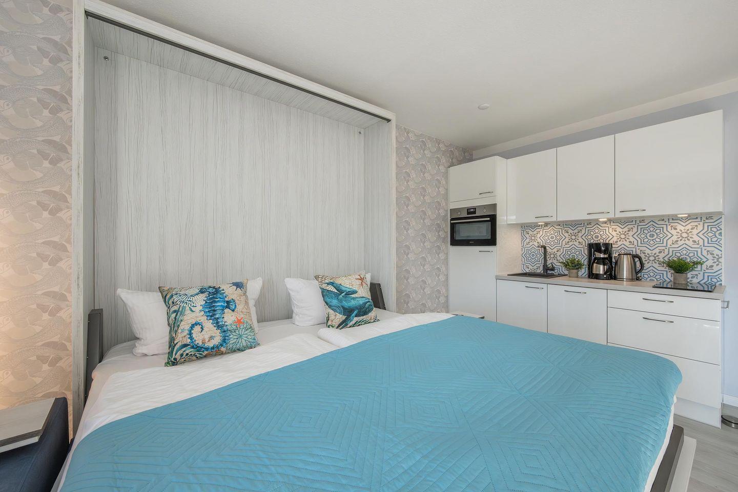 Dieses 40 Quadratmeter große Domizil wurde hell und liebevoll hergerichtet. In einem Raum werden Sie eine gelungene Kombination aus Wohn-, Schlaf- und Küchenbereich vorfinden und sich hier sofort wohlfühlen. Dieses Appartement ist ideal für Alleinreisende oder Paare geeignet. Tagsüber nutzen Sie den Wohnbereich und die Küche. Am Abend legen Sie die Sofakissen beiseite und klappen das raffiniert verbaute Schrankbett aus. Der anliegende Balkon eignet sich hervorragend als Rückzugsort.