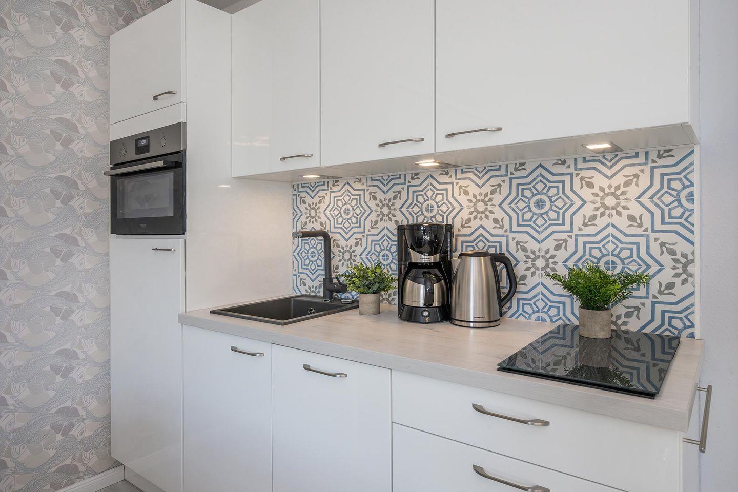 Die offene Küche ist mit allen notwendigen Geräten ausgestattet, darunter ein Backofen, eine Spülmaschine, ein 2-Platten-Ceranfeld und eine Mikrowelle. So können Sie sich bequem selbst versorgen und kulinarische Köstlichkeiten zubereiten. Der angrenzende Essbereich schafft eine angenehme Atmosphäre für gemeinsame Mahlzeiten.