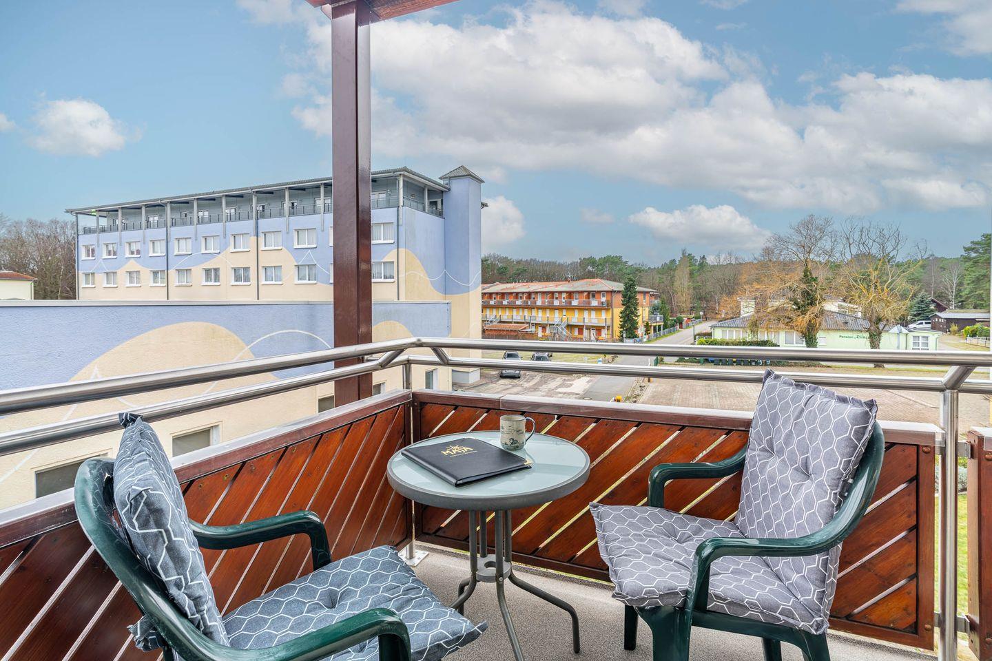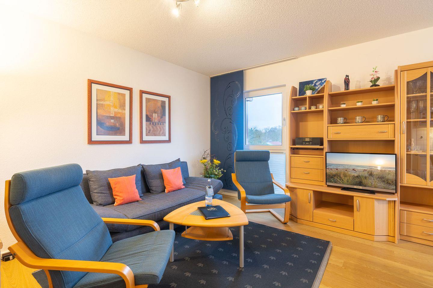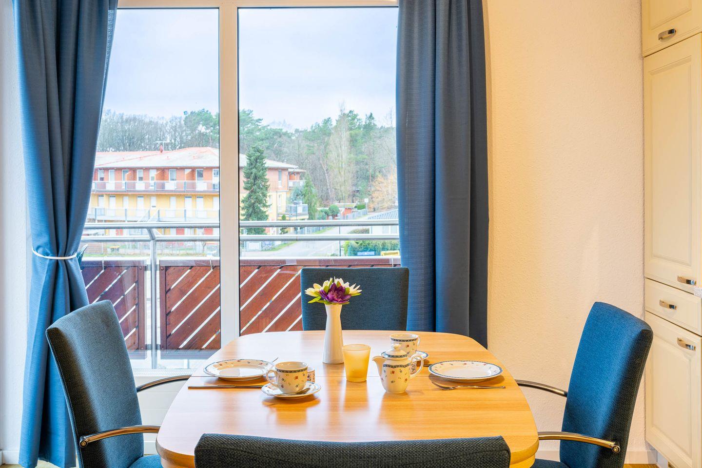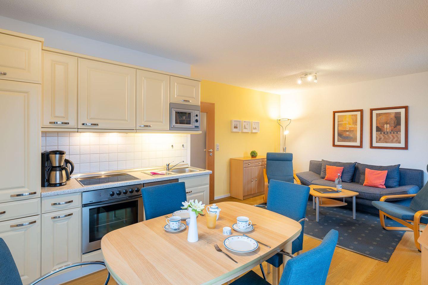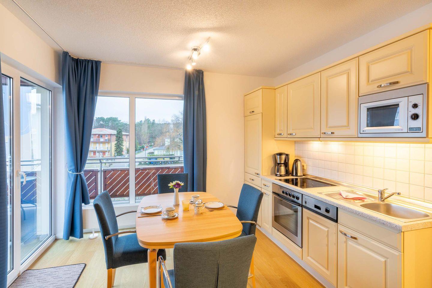 Die Ferienwohnung verfügt über ein komfortables Schlafzimmer mit einem bequemen Doppelbett, das Ihnen erholsame Nächte garantiert. Für zusätzliche Gäste oder Kinder bietet der Wohnbereich ein praktisches Schlafsofa, sodass die Wohnung Platz für bis zu 4 Personen bietet. Der offene Wohn- und Essbereich ist das Herzstück der Ferienwohnung. Die moderne Küche ist vollständig ausgestattet und bietet alles, was man benötigt: Backofen, Ceranfeld, Spülmaschine und Mikrowelle stehen Ihnen zur Verfügung, sodass Sie auch im Urlaub problemlos kochen können. Der gemütliche Wohnbereich lädt zum Entspannen ein – ob bei einem guten Buch oder einem Film auf dem TV-Gerät. Von hier aus gelangen Sie direkt auf den Balkon, wo Sie die frische Ostseeluft genießen und den Tag bei einer Tasse Kaffee oder einem Glas Wein ausklingen lassen können.