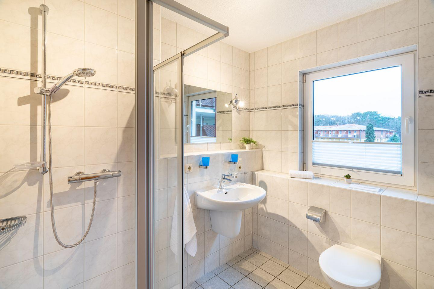 Das moderne Badezimmer ist mit einer Dusche, einem großen Spiegel und einem Fenster ausgestattet, was für angenehme Lichtverhältnisse sorgt. Für längere Aufenthalte stehen im Haus eine Waschmaschine und ein Trockner zur Verfügung (gegen Gebühr). Ein eigener Stellplatz direkt am Haus ermöglicht Ihnen eine unkomplizierte Anreise mit dem Auto. Ihre Fahrräder können sicher im abschließbaren Fahrradraum untergebracht werden.