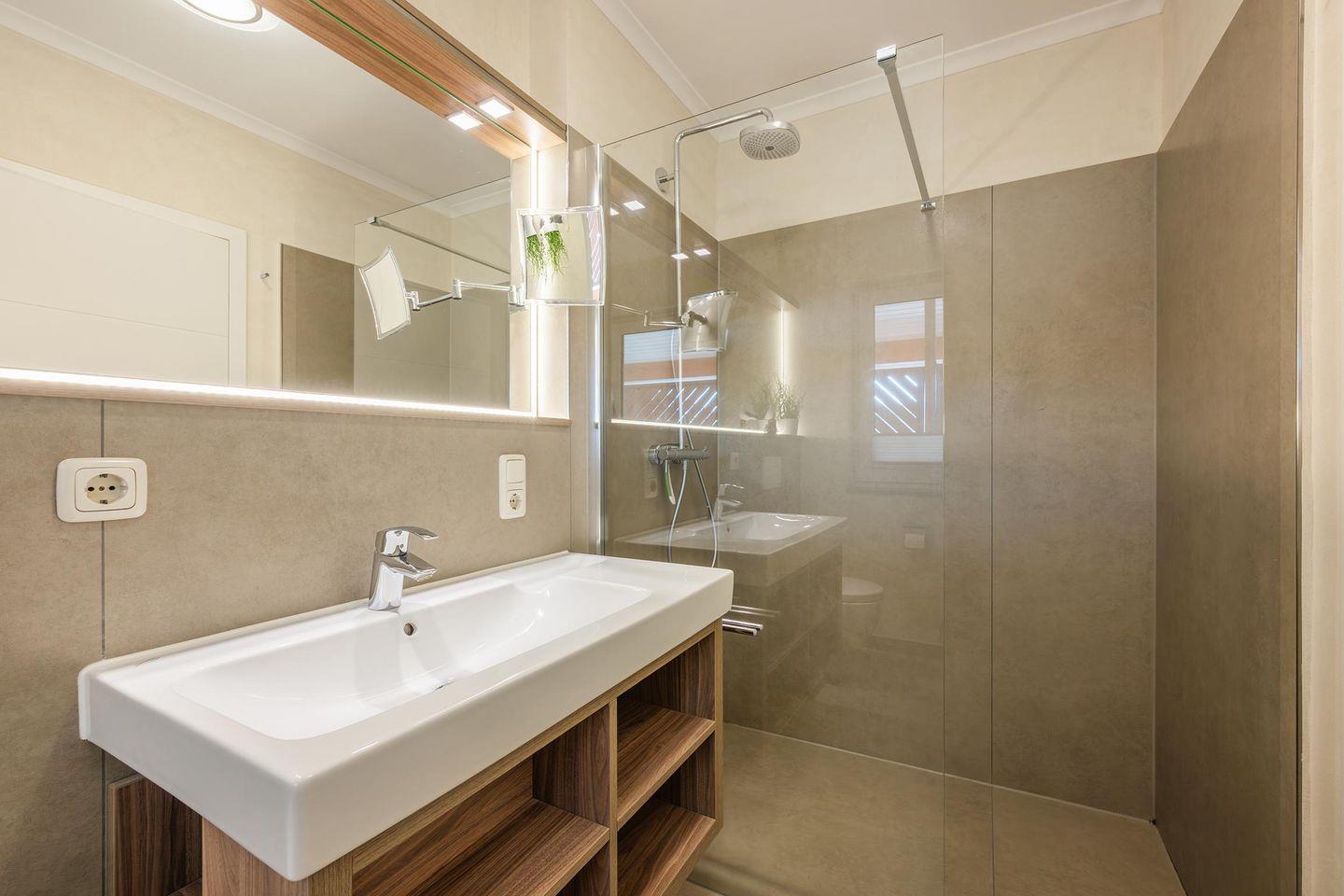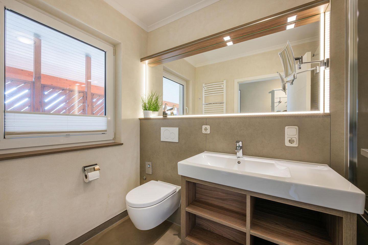 Das stilvolle Badezimmer überzeugt mit einer ebenerdigen Dusche, einem großen Spiegel und einem Fenster, das für eine angenehme Tageslichtbeleuchtung sorgt. Für längere Aufenthalte stehen im Haus eine Waschmaschine und ein Trockner gegen Gebühr zur Verfügung. Ein abschließbarer Fahrradraum ist ebenfalls vorhanden, sodass Sie Ihre Fahrräder sicher unterstellen können.