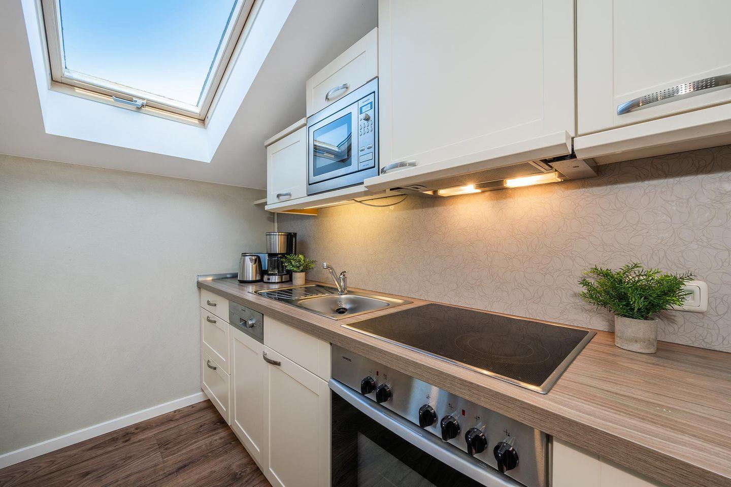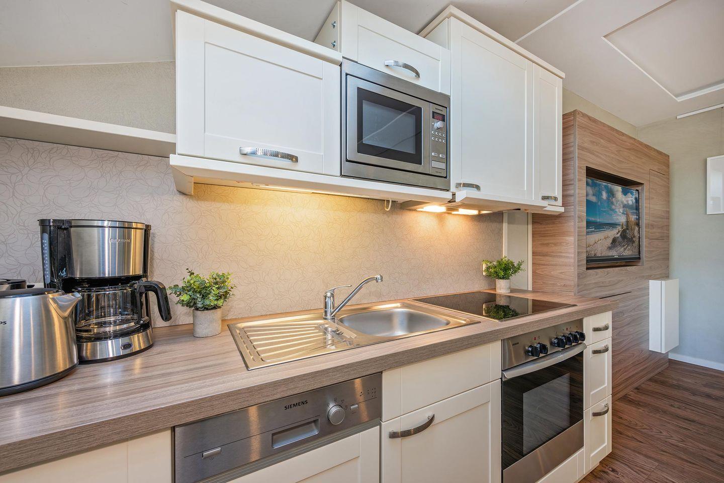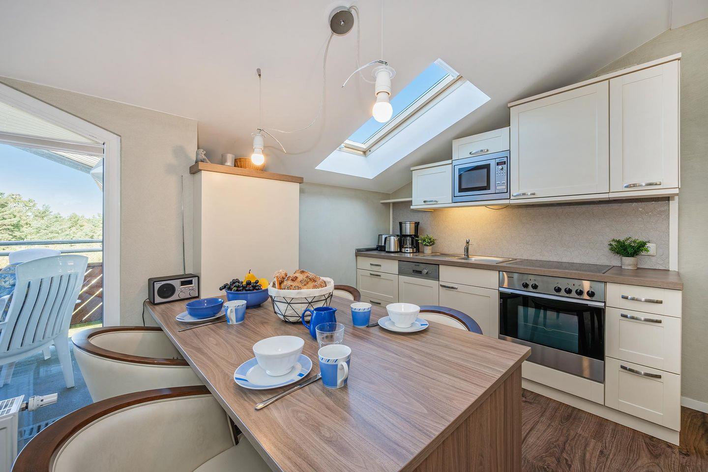 Die offene Küche ist ein weiteres Highlight der Ferienwohnung. Sie verfügt über eine umfassende Ausstattung mit Backofen, Ceranfeld, Mikrowelle und Spülmaschine, sodass Sie Ihre Lieblingsgerichte bequem zubereiten können. Durch die offene Gestaltung zum Wohnbereich können Sie sich auch beim Kochen mit Ihren Liebsten unterhalten. Vom Wohnbereich gelangen Sie direkt auf den Balkon, der mit seiner frischen Meeresluft zum Verweilen einlädt und den perfekten Ort für entspannte Stunden bietet.