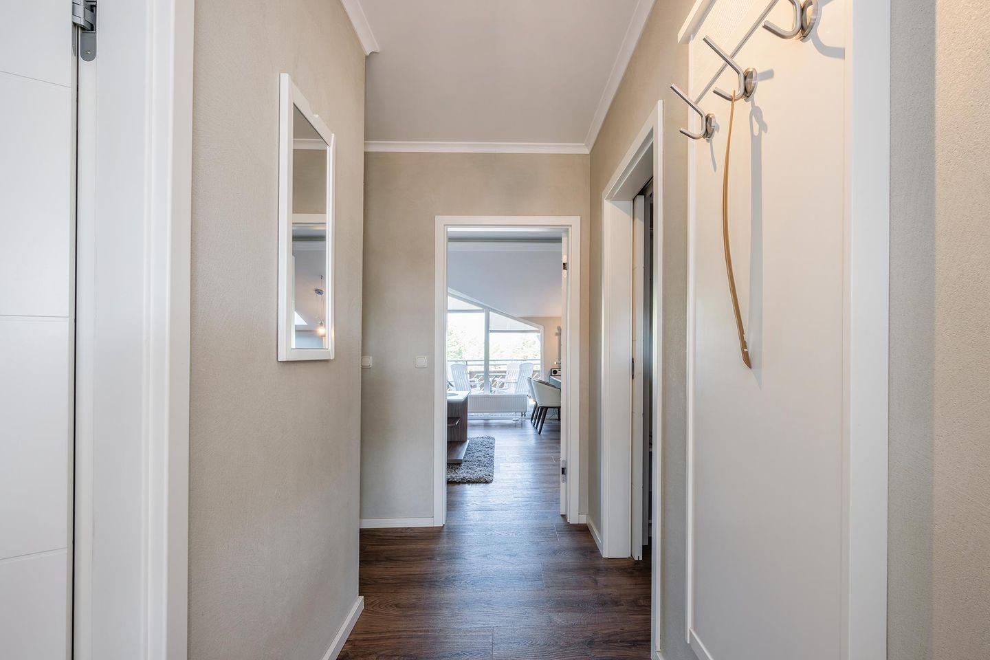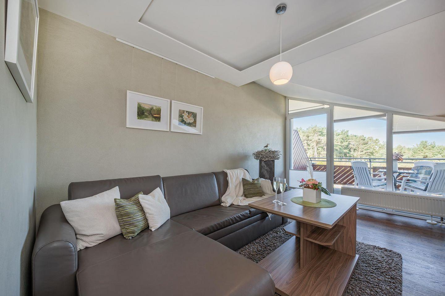 Dieses luxuriöse 2-Zimmer Appartement befindet sich im Dachgeschoss. Es erwartet Sie ein Wohn- und Essbereichs mit großen Fenstern. Die großzügigen Balkontüren im Essbereich oder der große möblierte Balkon bieten Ihnen eine beeindruckende Sicht auf die wunderschöne Ostsee. Der Wohnbereich ist kombiniert und bietet Ihnen eine ausziehbare Schlafcouch, einen Flatscreen-TV und einen Essbereich. Die Küchenzeile ist mit einem Herd, Mikrowelle, Geschirrspülmaschine und Kaffeemaschine ausgestattet.