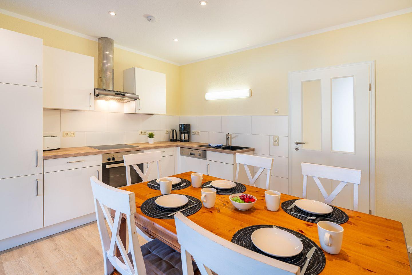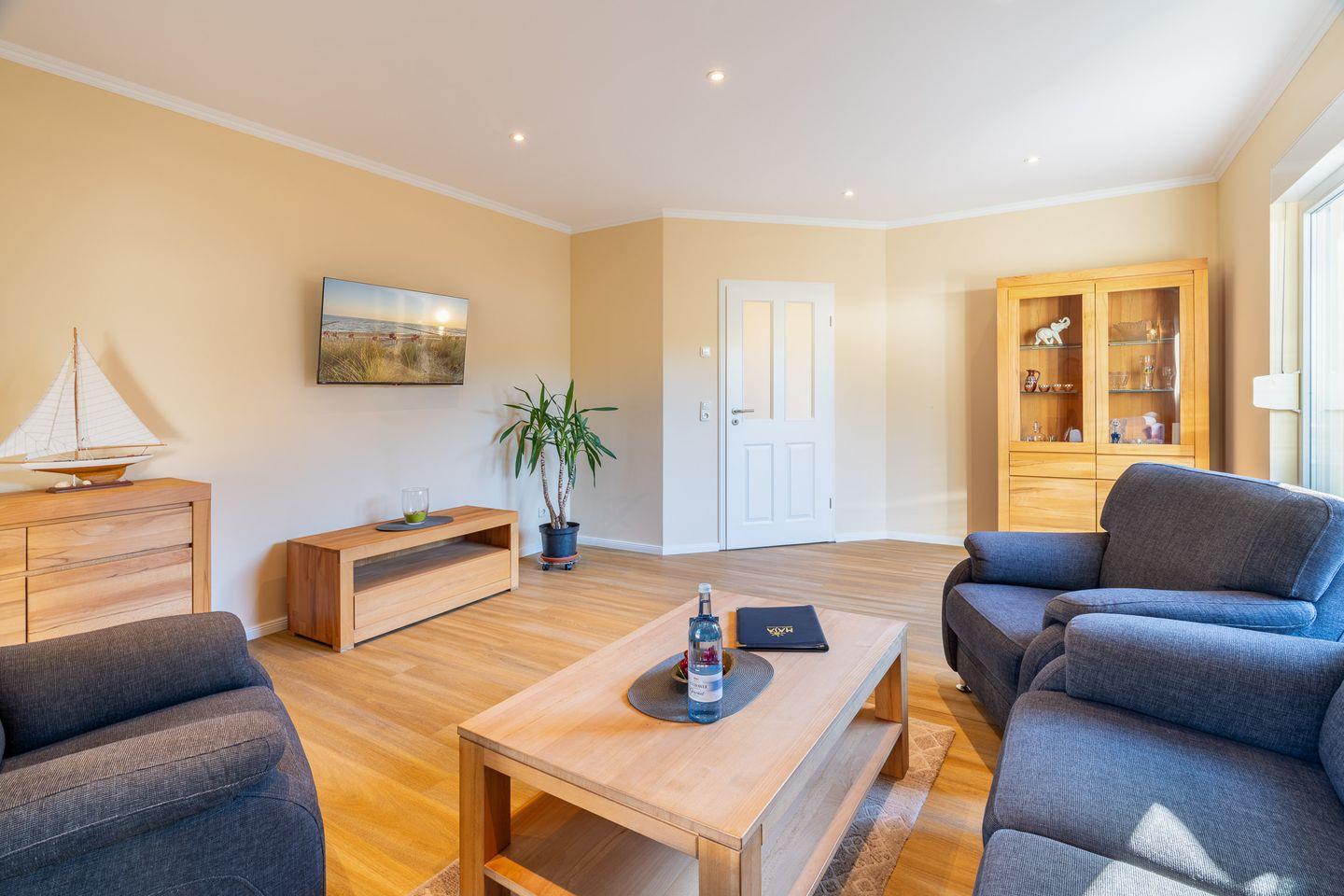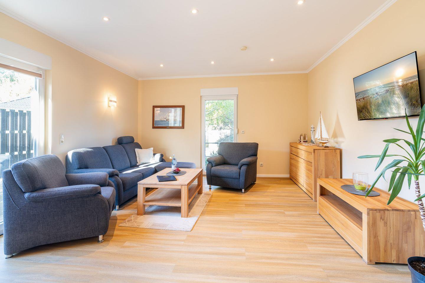 Die separate Küche mit Esstisch ist voll ausgestattet und verfügt über Backofen, Ceranfeld, Mikrowelle und Spülmaschine – perfekt für gemeinsames Kochen und gesellige Mahlzeiten. Der angrenzende Wohnbereich ist modern und gemütlich eingerichtet, mit einer bequemen Sitzgruppe und zwei TV-Geräten, sodass auch an Regentagen für Unterhaltung gesorgt ist.