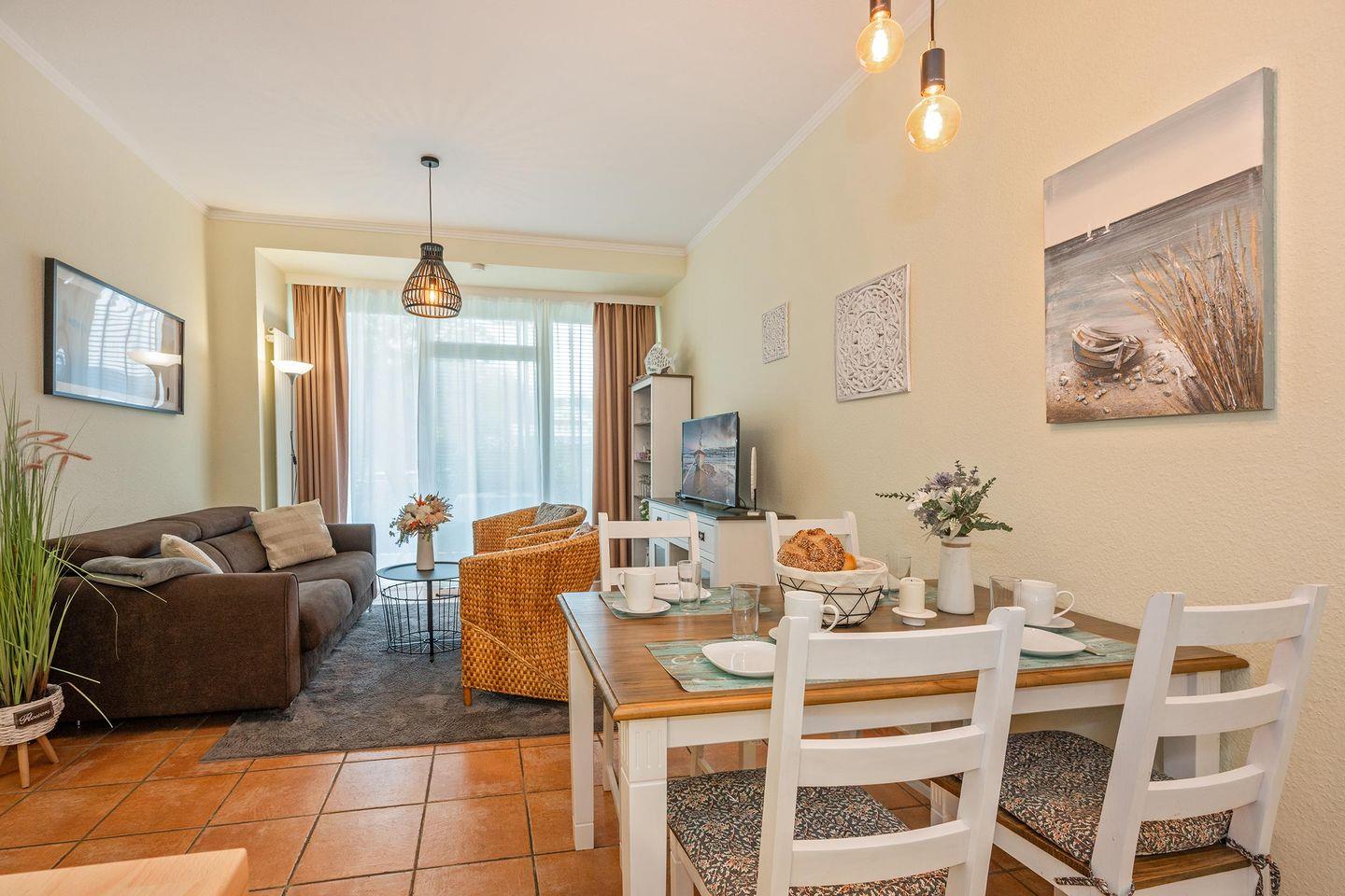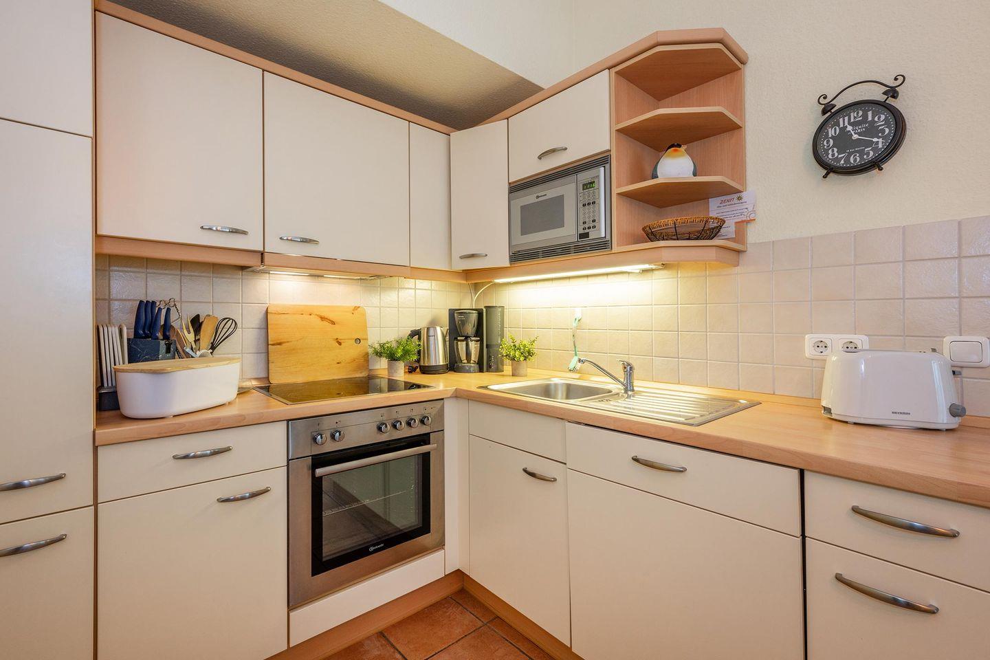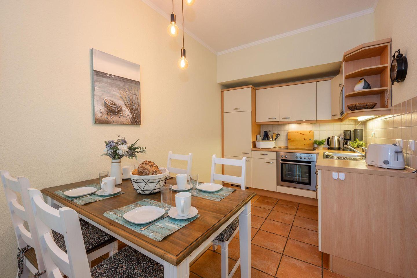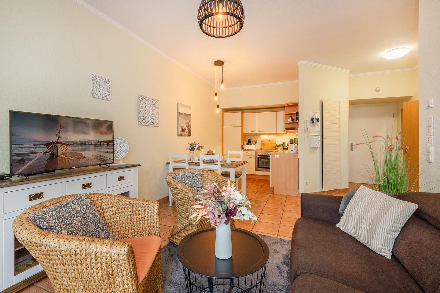 Der offene Wohnbereich geht nahtlos in die moderne Küche über, die in einem separaten Raum untergebracht ist und mit allen wichtigen Geräten ausgestattet wurde: Backofen, Spülmaschine, Ceranfeld und Mikrowelle stehen Ihnen zur Verfügung, um Ihre Lieblingsgerichte zuzubereiten. Der angrenzende Wohnbereich öffnet sich zu einem sonnigen Balkon, der einen idyllischen Blick ins Freie gewährt und Sie einlädt, die frische Ostseeluft zu genießen. Haustiere sind in der Ferienwohnung Südwind 6 herzlich willkommen, sodass auch Ihre vierbeinigen Begleiter den Urlaub an der Ostsee in vollen Zügen erleben können. Kinder sind ebenso willkommen – die familienfreundliche Ausstattung macht diese Unterkunft zum idealen Domizil für Ihren nächsten Familienurlaub.
