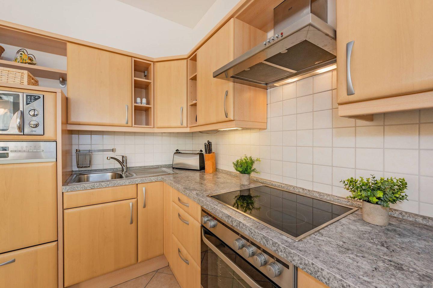 Beim Betreten der Wohnung gelangen Sie in den großzügigen, offenen Wohnbereich, der unmittelbar an die separate Küche angrenzt. Die Küche ist mit allen wichtigen Geräten ausgestattet – Backofen, Spülmaschine, Ceranfeld und Mikrowelle ermöglichen Ihnen das Zubereiten kulinarischer Köstlichkeiten in einem eigenen Raum. Vom Wohnbereich aus erreichen Sie einen Balkon mit südlicher Ausrichtung, der Ihnen einladende Ausblicke und die Möglichkeit bietet, bei einer Tasse Kaffee oder einem Glas Wein die warmen Sonnenstrahlen zu genießen.