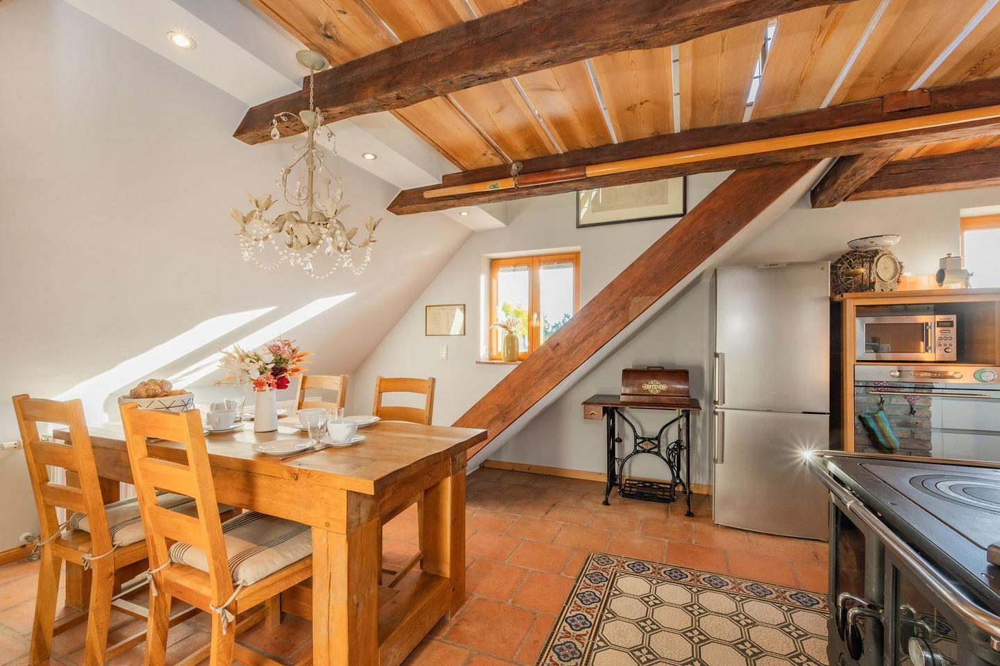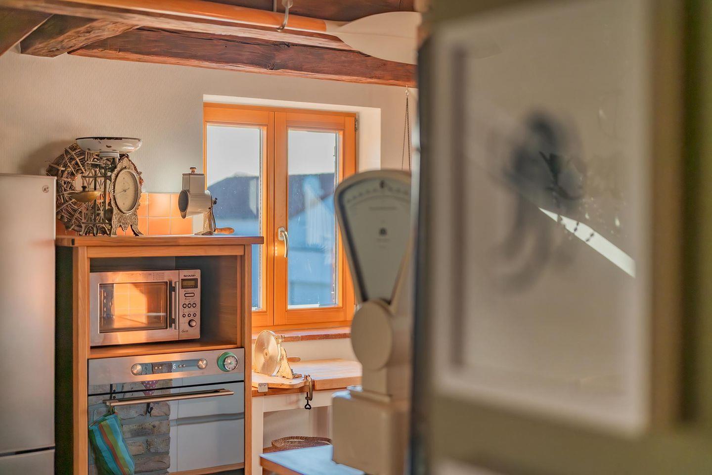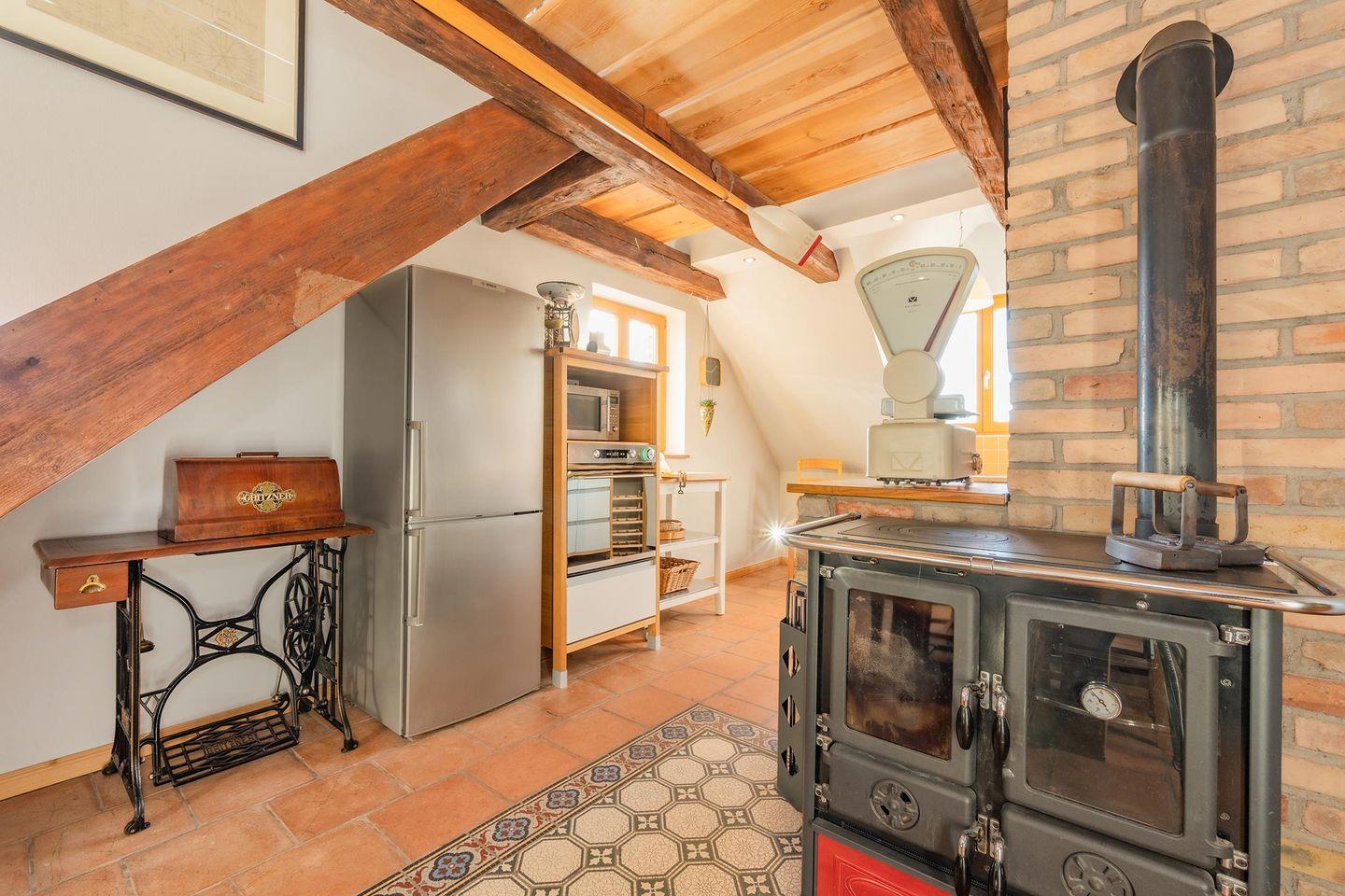 Das Herzstück der Wohnung ist die gemütliche Wohnküche, die dank eines integrierten Kaminofens in der kühleren Jahreszeit für eine besonders behagliche Stimmung sorgt – ein seltenes und geschätztes Highlight. Die kleine, aber hochmoderne Küche ist optimal ausgestattet mit Induktionskochfeld, Backofen und Spülmaschine und geht offen in den Wohnbereich über. Hier finden Sie einen komfortablen Esstisch für gemeinsame Mahlzeiten und einen gemütlichen Wohnraum mit einer einladenden Sitzecke und einem Flat-TV, der Streaming-Optionen wie Amazon Prime und Netflix (mit eigenem Account) ermöglicht. Für die kleinen Gäste steht im Erdgeschoss ein separates Kinderzimmer mit einem Einzelbett (0,90m x 2,00m) und Kleiderschrank bereit. Über eine charmante Holztreppe gelangen Sie in den Dachbereich, wo sich das geräumige Hauptschlafzimmer befindet.