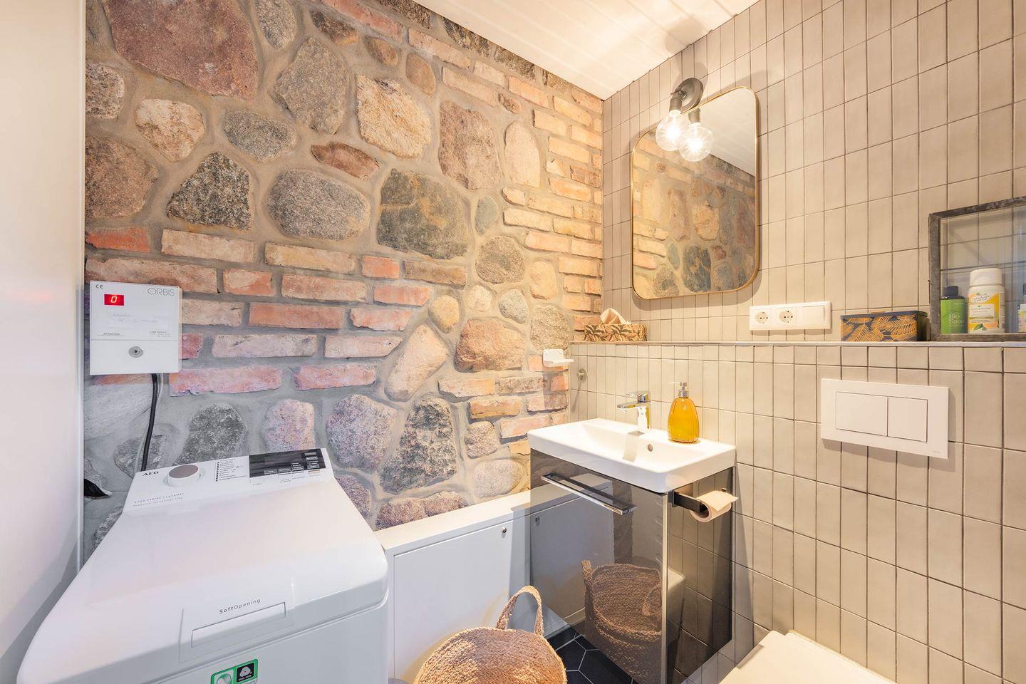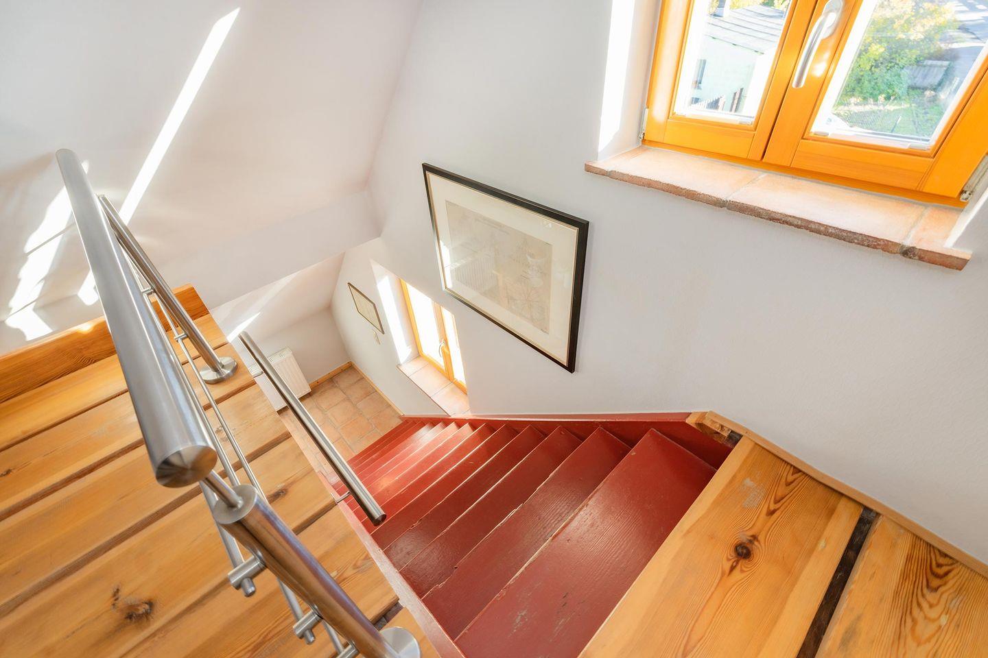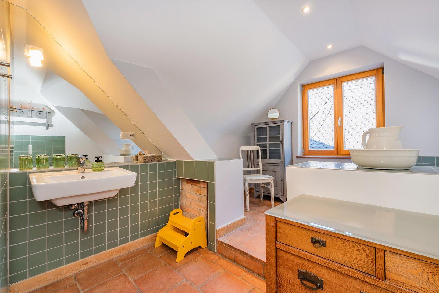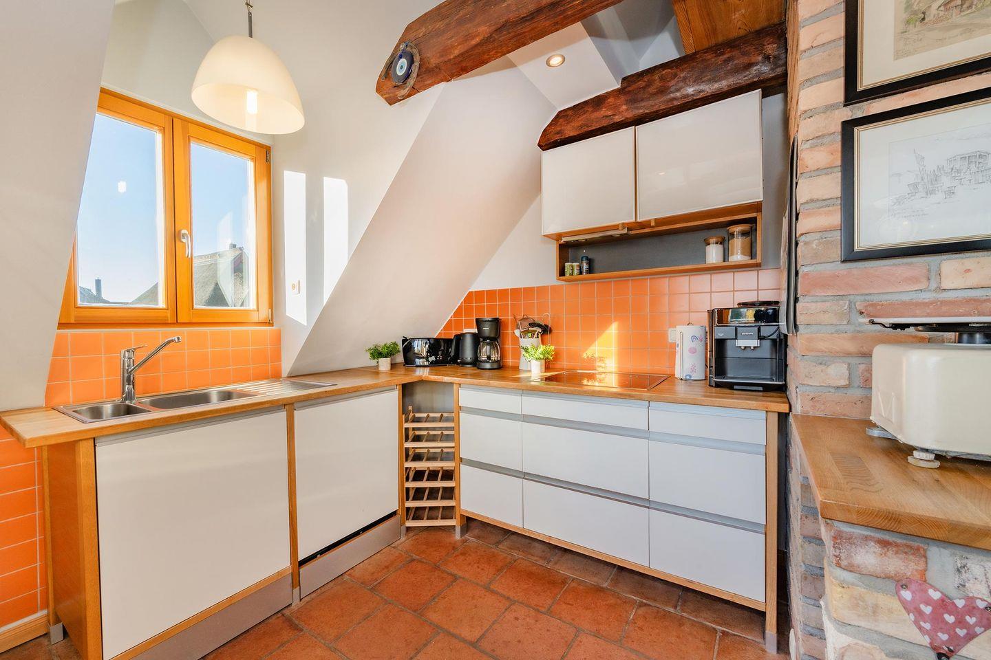 Das Herzstück der Wohnung ist die gemütliche Wohnküche, die dank eines integrierten Kaminofens in der kühleren Jahreszeit für eine besonders behagliche Stimmung sorgt – ein seltenes und geschätztes Highlight. Die kleine, aber hochmoderne Küche ist optimal ausgestattet mit Induktionskochfeld, Backofen und Spülmaschine und geht offen in den Wohnbereich über. Hier finden Sie einen komfortablen Esstisch für gemeinsame Mahlzeiten und einen gemütlichen Wohnraum mit einer einladenden Sitzecke und einem Flat-TV, der Streaming-Optionen wie Amazon Prime und Netflix (mit eigenem Account) ermöglicht. Für die kleinen Gäste steht im Erdgeschoss ein separates Kinderzimmer mit einem Einzelbett (0,90m x 2,00m) und Kleiderschrank bereit. Über eine charmante Holztreppe gelangen Sie in den Dachbereich, wo sich das geräumige Hauptschlafzimmer befindet.