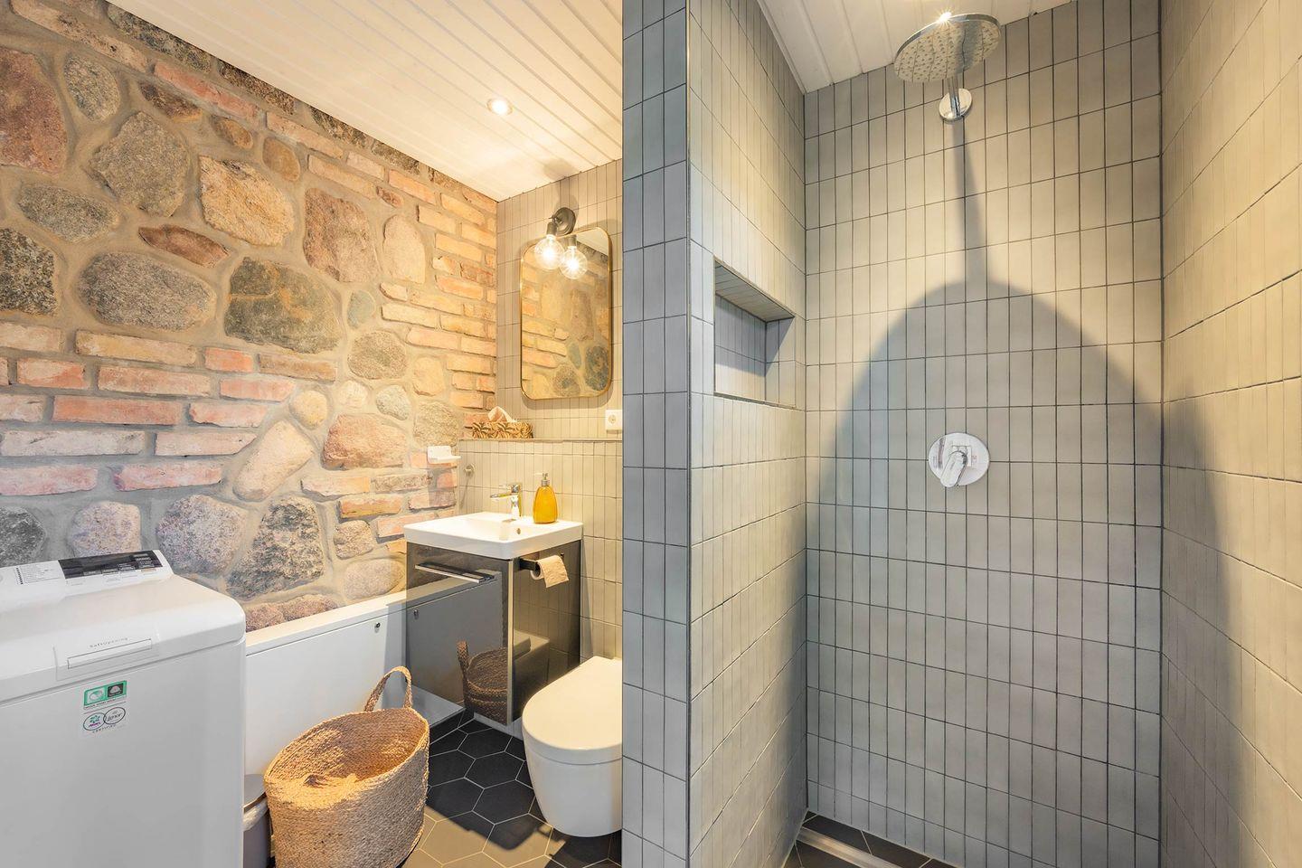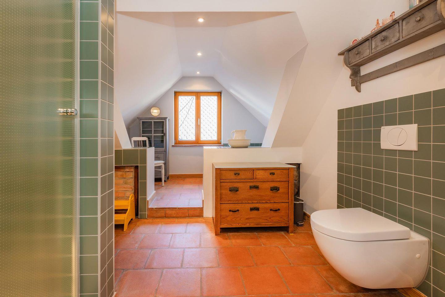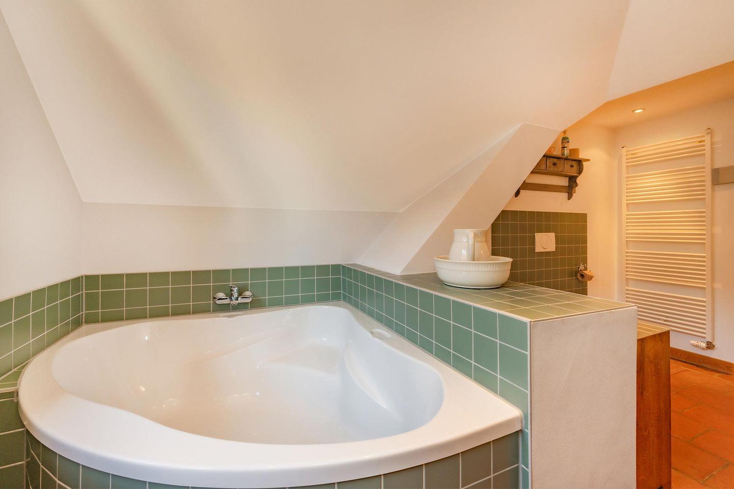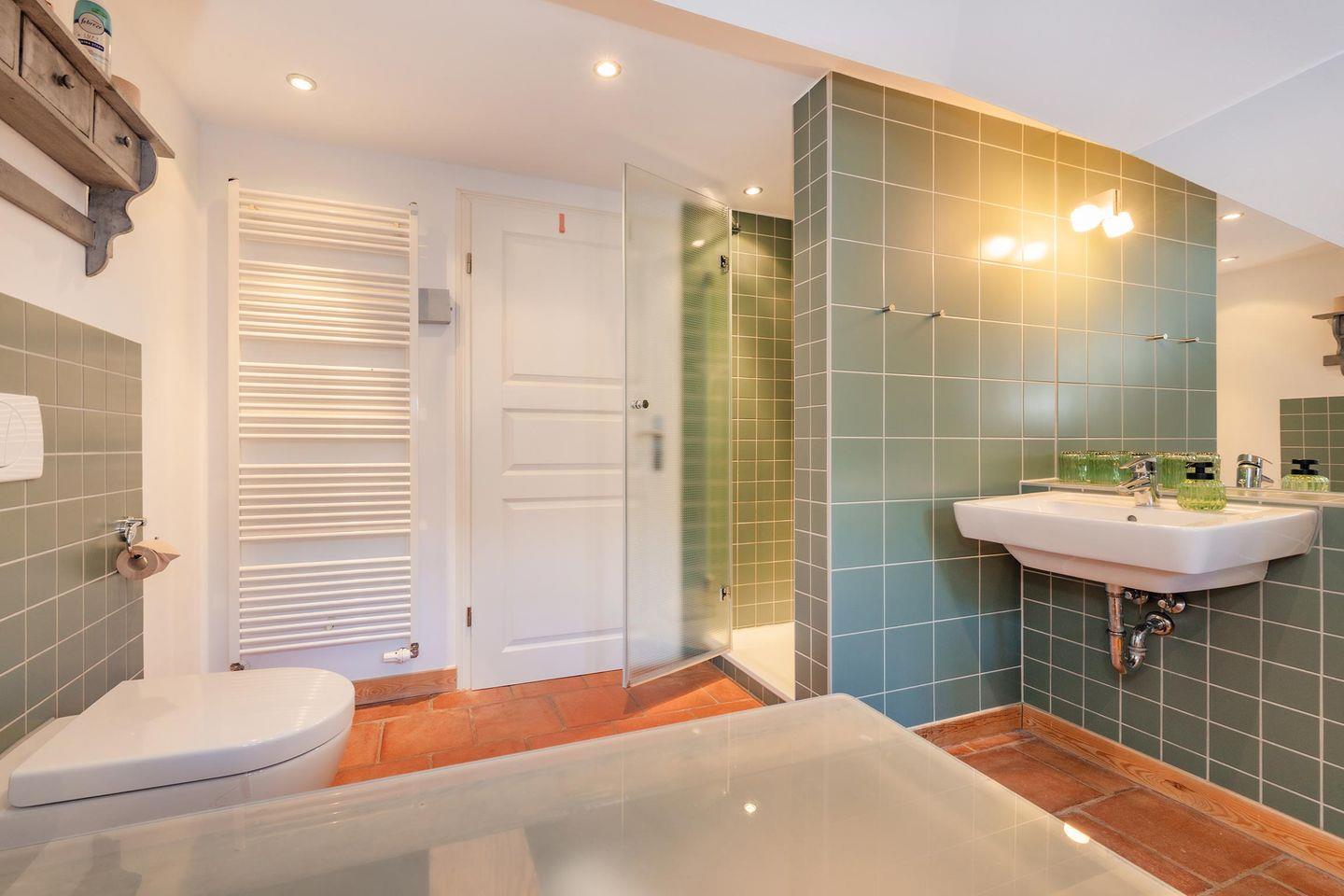Das Hauptschlafzimmer im Obergeschoss ist eine Oase der Ruhe, ausgestattet mit einem komfortablen Doppelbett (1,80m x 2,00m) und einem zusätzlichen Einzelbett für ein Kind bis 10 Jahre, sowie einem weiteren Flachbildfernseher. Ein besonderer Luxus erwartet Sie im großzügigen, modernen Bad mit Tageslichtfenster: Hier stehen Ihnen sowohl eine entspannende Eckbadewanne als auch eine Dusche mit bodengleichem Einstieg sowie ein Handtuchheizer zur Verfügung. Für einen sorgenfreien Start in Ihren Urlaub sind die Betten bereits bezogen und ausreichend Handtücher liegen bereit.