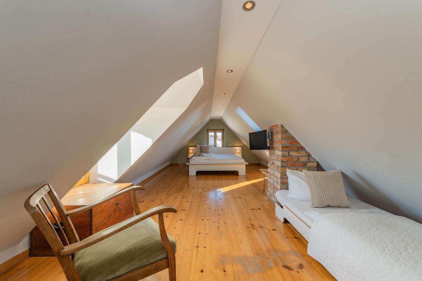 Entfliehen Sie dem Alltag und finden Sie Ihr persönliches Usedom-Glück in der charmanten Ferienwohnung Am Rieck 02. Idyllisch und ruhig gelegen im Herzen des traditionsreichen Seebades Zempin, besticht dieses Domizil durch seine einzigartige Lage: Die kurze Entfernung zum Achterwasser verspricht eine malerische Umgebung und traumhafte Sonnenuntergänge, während der Ostseestrand nach einem Spaziergang von etwas über einem Kilometer erreicht werden kann. Die großzügige Wohnung mit 95 m² Wohnfläche befindet sich im Obergeschoss eines reizvollen Fachwerkhauses und bietet dank eines separaten Hauseinganges über eine Holzaußentreppe ein hohes Maß an Privatsphäre. Die gesamte Wohnung strahlt ein sofortiges Wohlfühlambiente aus, geschaffen durch freiliegende Fachwerkbalken, eine liebevolle, klare Stilrichtung und eine warme Dekoration, die den Charakter des Hauses unterstreicht und zum Entspannen einlädt.