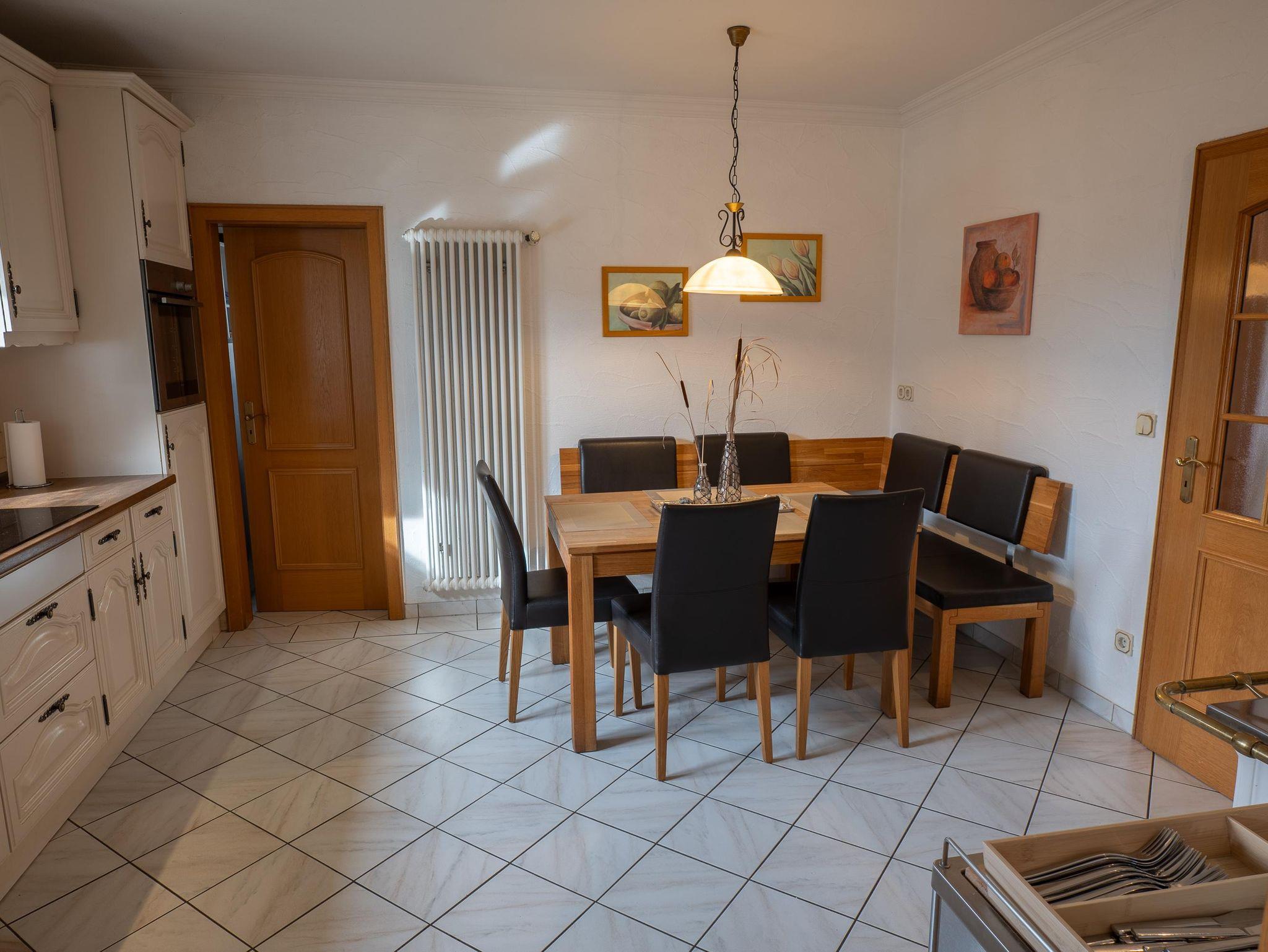 Sowohl in der Küche als auch im Esszimmer befinden sich große Esstische, an denen alle Gäste gemeinsam essen oder gemütlich zusammensitzen können.