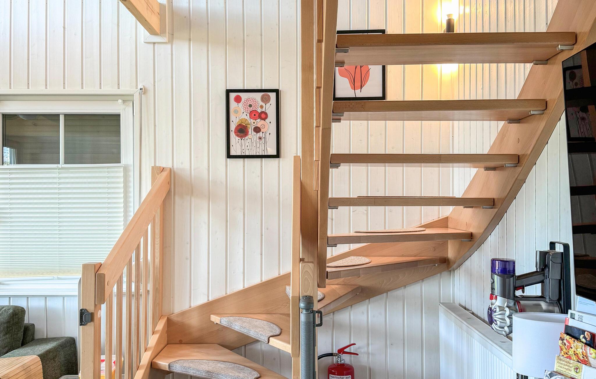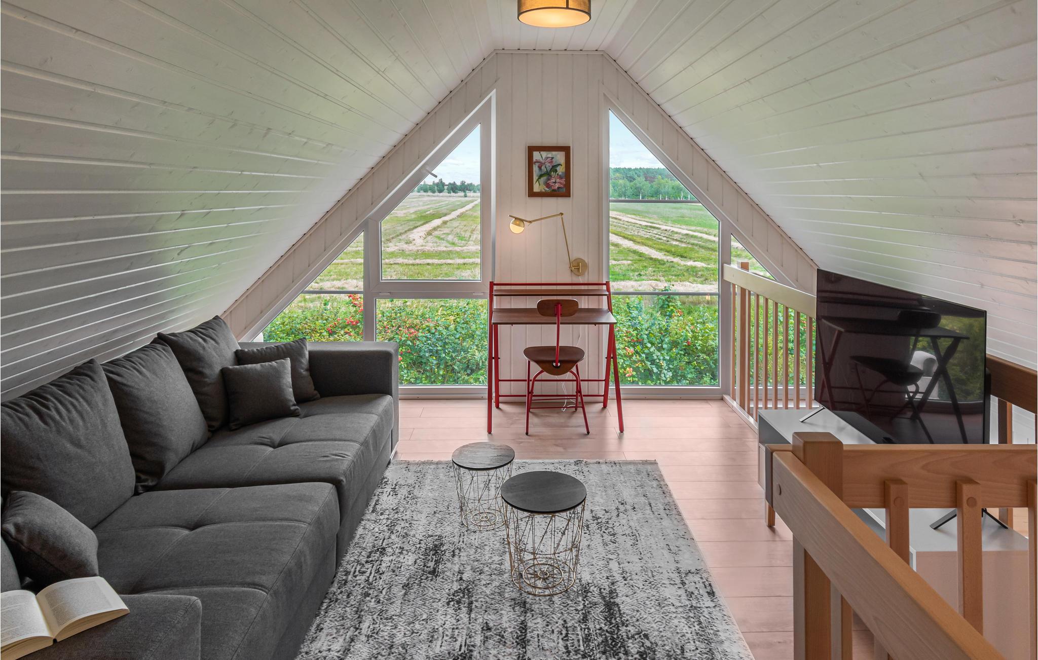 Det mysiga och smakfullt inredda semesterhuset i trä ligger nära vattnet och erbjuder en underbar utsikt över landskapet. Genom de stora panoramafönstren, som sträcker sig från golvet till taket, faller utsikten om och om igen och från överallt på det förtrollande landskapet. När som helst på året kan du göra dig bekväm i det mysiga vardagsrummet på bottenvåningen efter långa dagar i det stora utomhus. När temperaturen sjunker finns det inget mer mysigt än att läsa en bok, laga mat med familjen eller spela brädspel. Tack vare den höga takhöjden och det öppna galleriet på 1:a våningen är huset särskilt ljust och inbjudande. Här kan du varva ner och ta ett djupt andetag året runt.