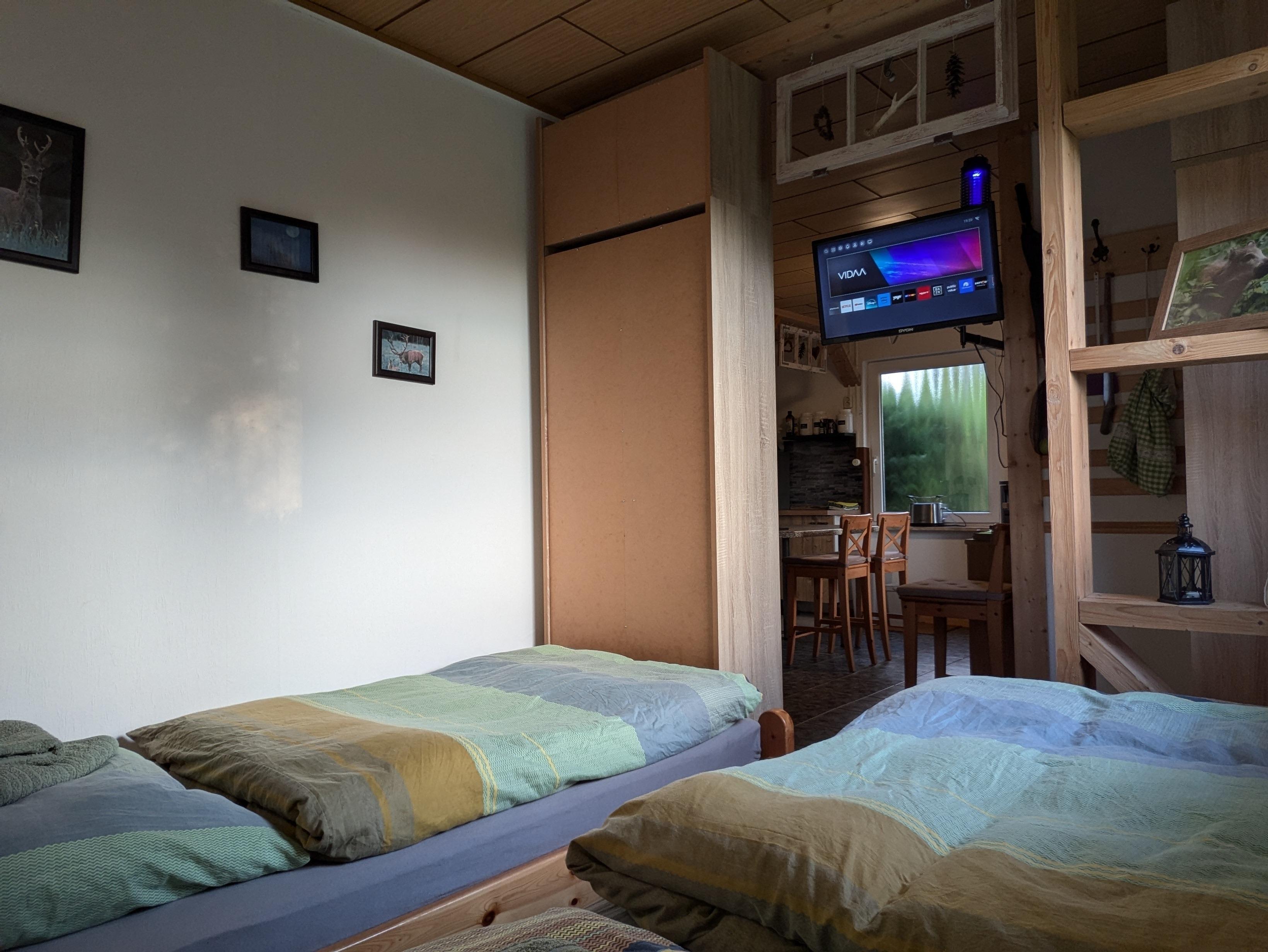 Ein Fernseher ist vom Küchentisch oder auch von den Betten aus zu sehen. So steht einem gemütlichen Betttag bei Regenwetter nichts mehr im Weg.