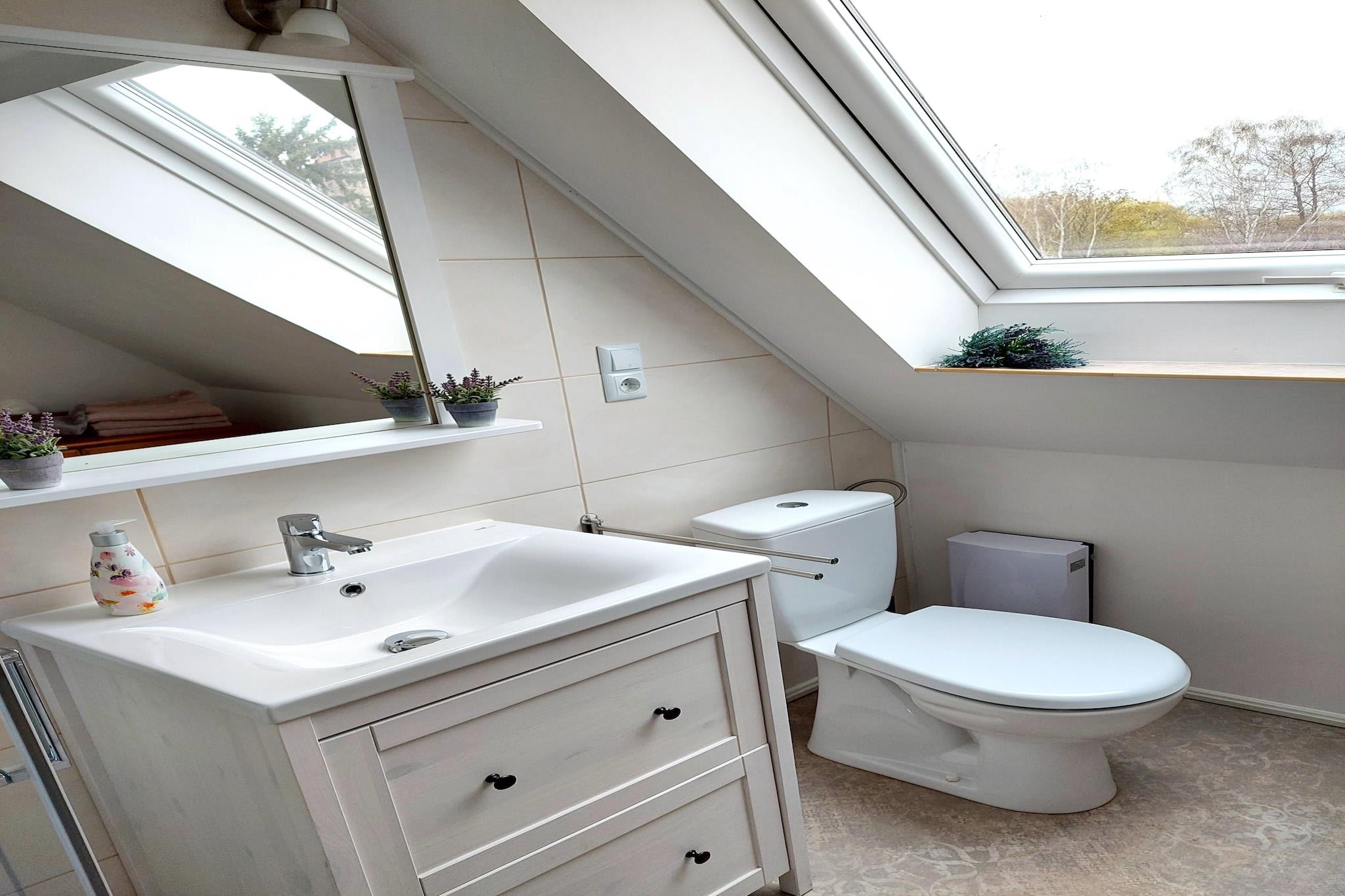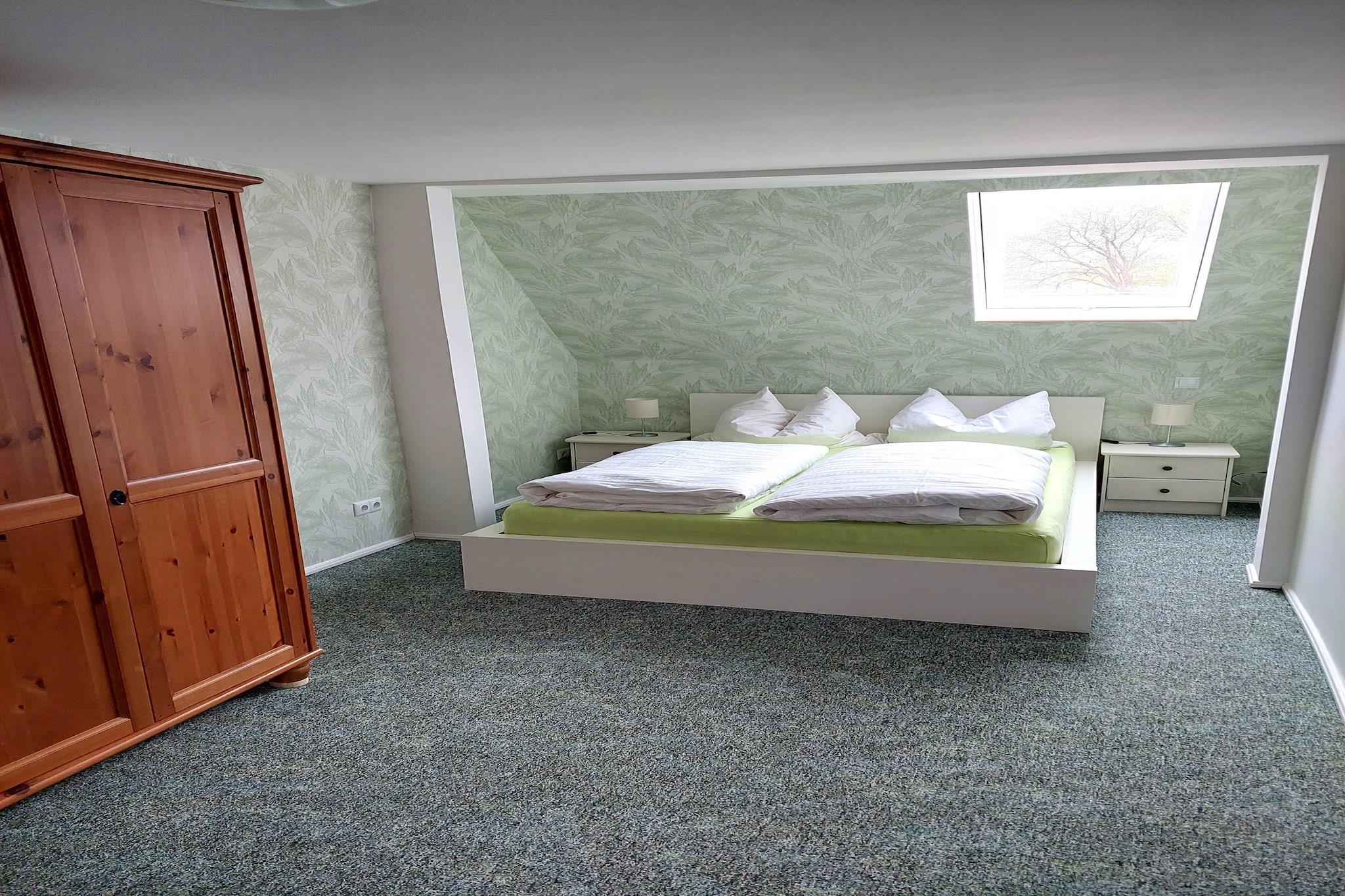 Denna charmiga vindslägenhet ligger i Ziesar, mellan Magdeburg och Potsdam, och är perfekt för små familjer eller grupper av vänner. Dess idylliska, lantliga miljö nära naturparken Fläming gör den till en perfekt bas för avkopplande utflykter. Besök den tidigare biskopsresidensen Ziesar med dess imponerande och pittoreska slott och promenera genom de charmiga gränderna i den gamla staden, där tiden tycks stå stilla. Det vackra slottet Wiesenburg ligger bara 25 minuters bilresa bort, och sjödistriktet runt Brandenburg an der Havel, som erbjuder båtturer, bad och vattensporter, ligger 30 minuters bilresa bort. En sightseeingtur till Potsdam och Magdeburg är också lätt att hantera på bara 40 minuter. Den kompakta lägenheten har ett fullt utrustat kök, TV och en bäddsoffa i vardagsrummet för en extra gäst. Gästerna är välkomna att använda trädgården med terrass och grill. Parkering finns på plats. Ingår: Alla elförsörjning (baserat på förbrukning) Handdukar Wi-Fi
