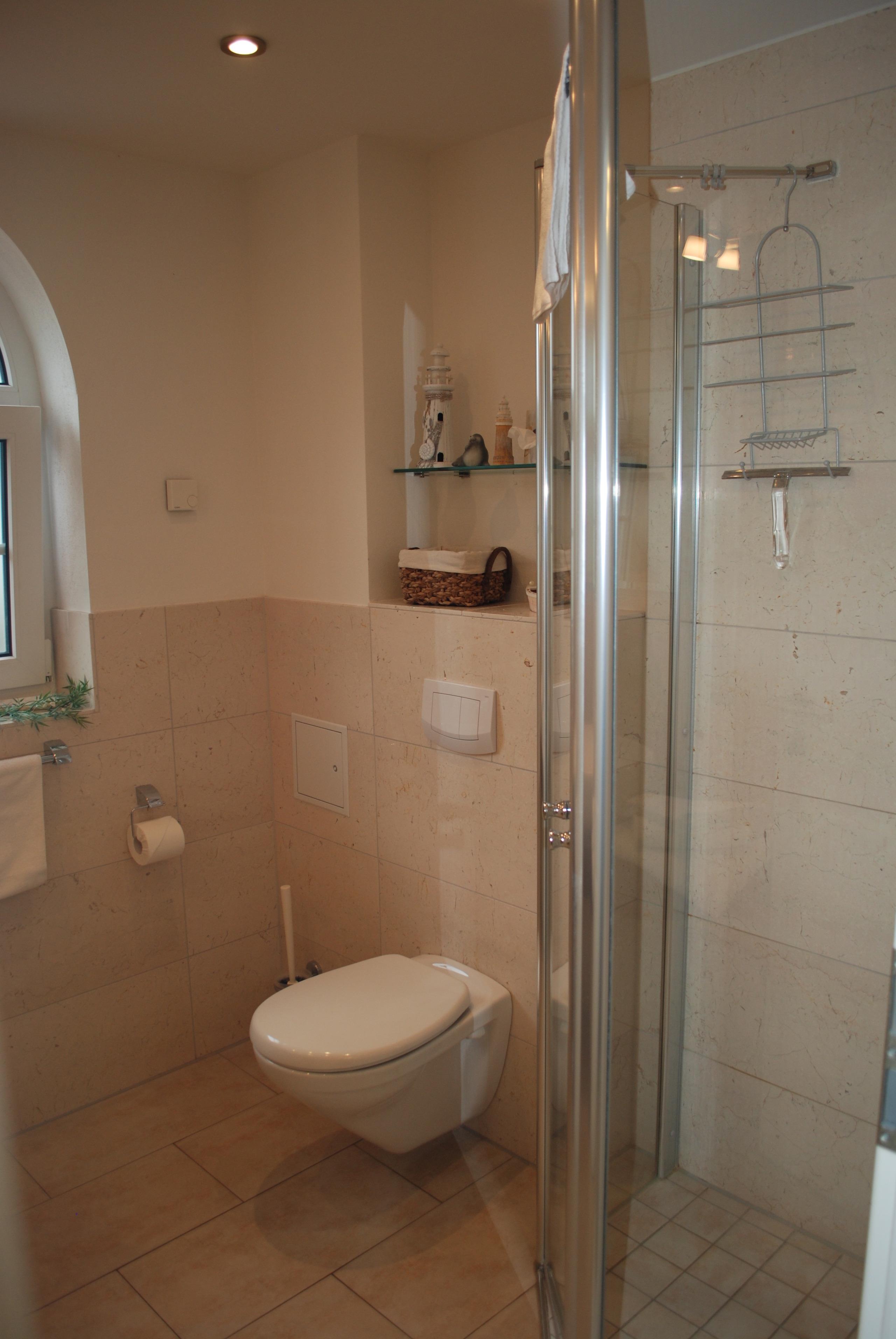 Wohnung gehören 2 Schlafzimmer (Boxspringbetten jeweils 90 x 200) mit Flachbild-Fernseher und Parkettboden, ein Bad mit ebenerdiger Dusche, Handtuchheizung und WC, sowie ein separates WC (beides Marmor).