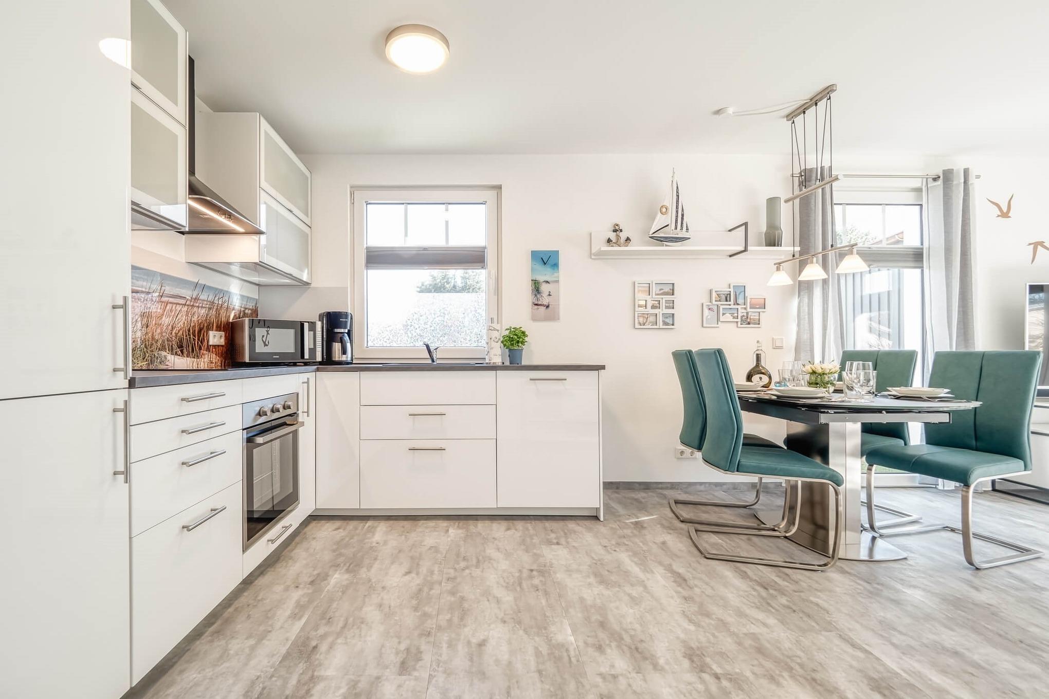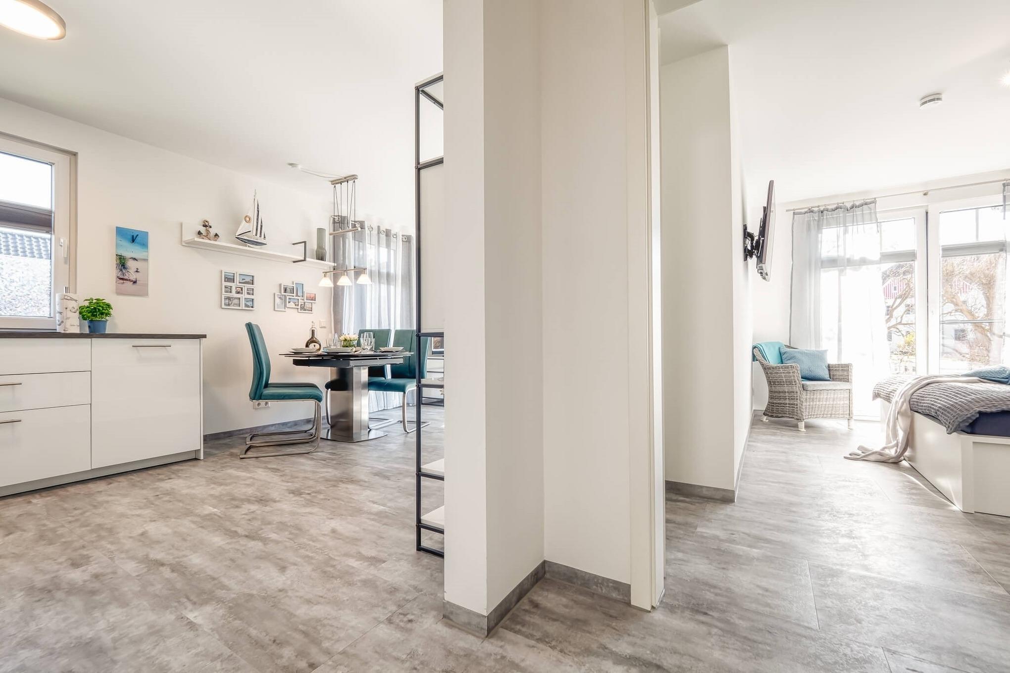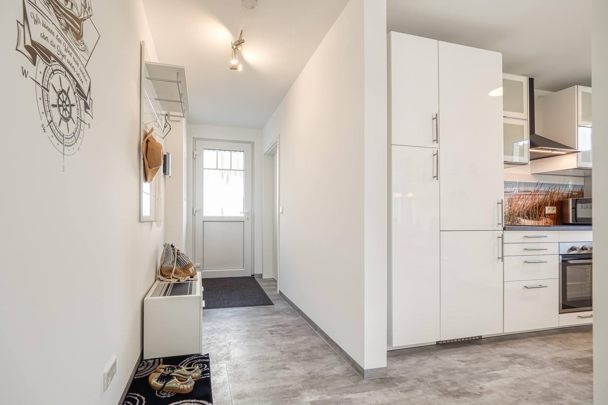 Alle Räume gehen von dem mit einer Garderobe und Schuhschrank ausgestatteten Flur ab. Das geräumige Wohnzimmer mit ausklappbarem Sofa-Bett (160 cm breit) erreichen Sie durch einen offenen Durchgang. In der integrierten Küchenzeile findet man alles, was für eine Selbstverpflegung benötigt wird, so z. B. auch einen Gefrierschrank.