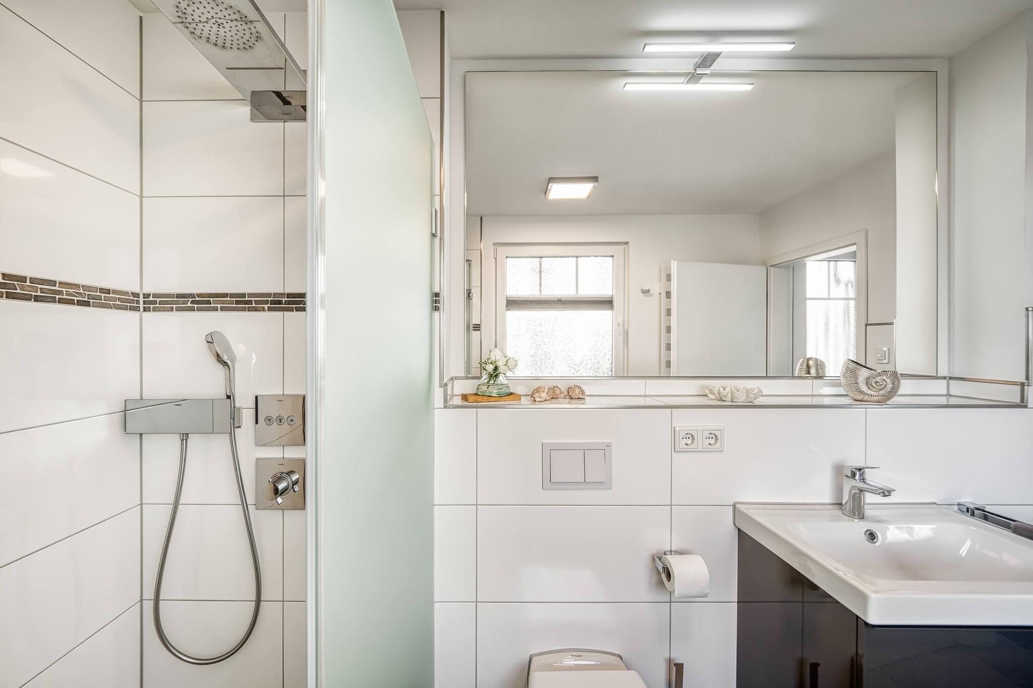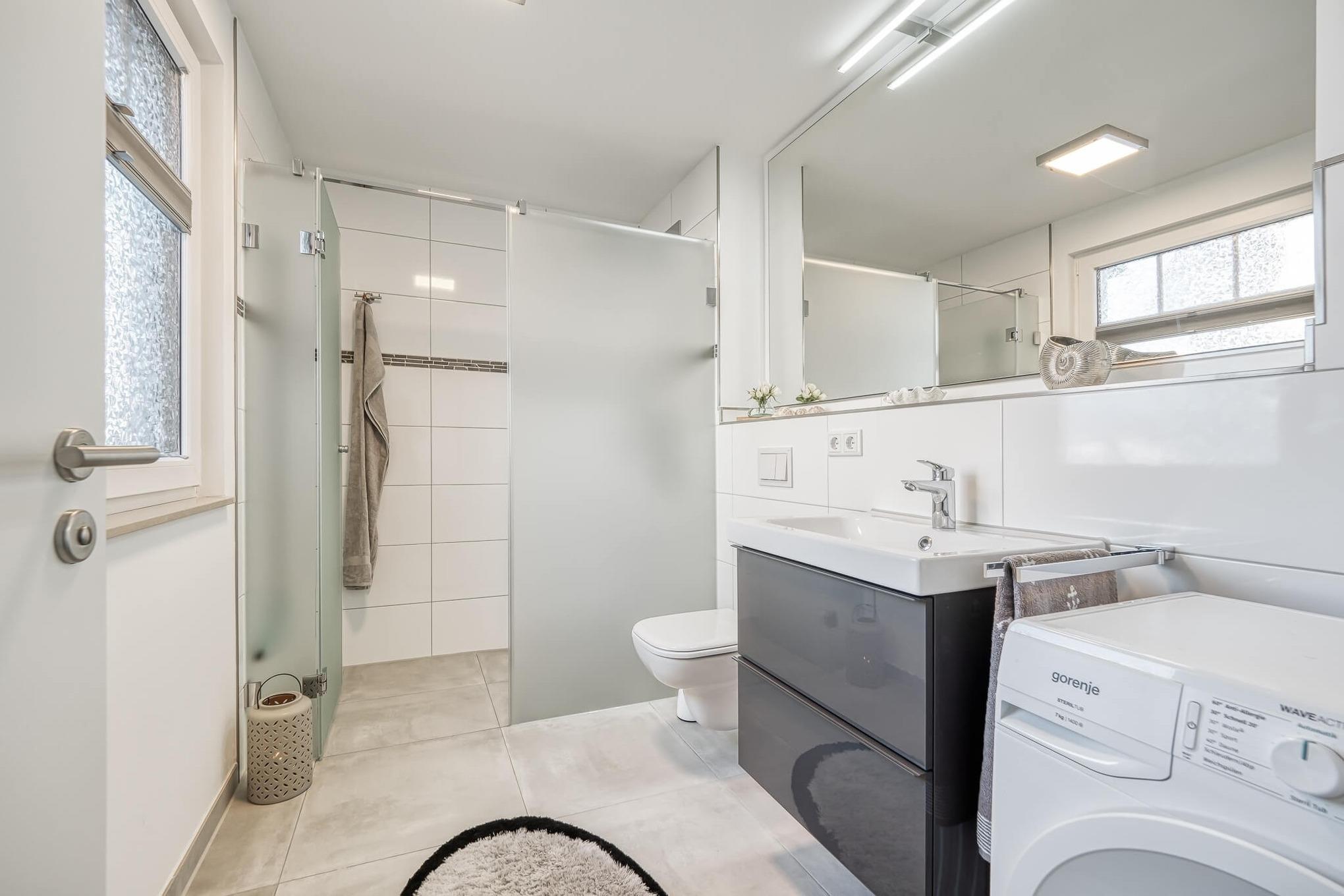 Das Badezimmer mit Fenster verfügt über eine große, ebenerdige mit einer Glaswand abgetrennte hochwertige Regen-/Schwalldusche. Hier gibt es darüber hinaus eine Waschmasche sowie einen Föhn. Wäscheständer, -klammern und -korb finden Sie im Fahrradschuppen.
