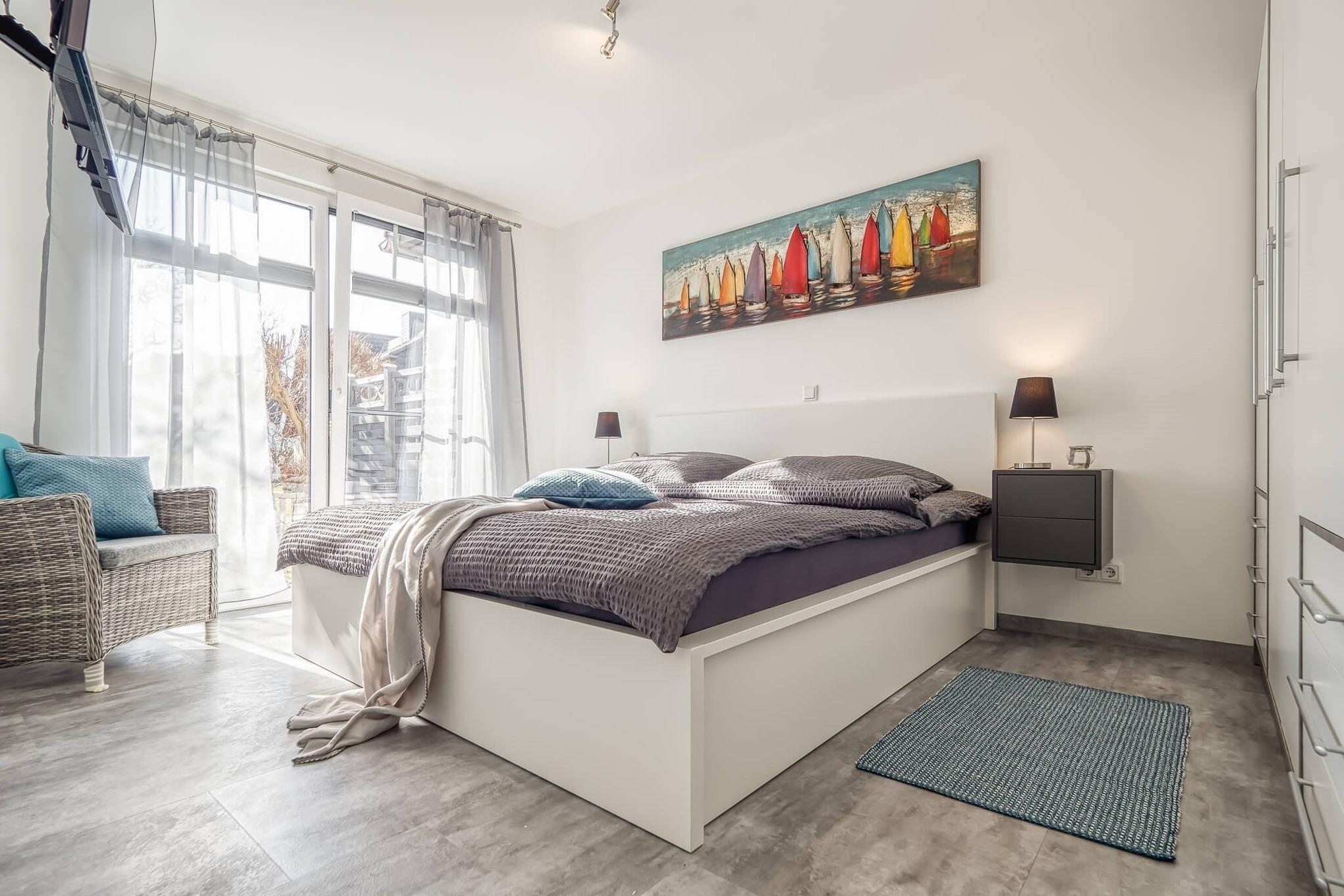 Das Schlafzimmer mit Doppelbett ist ebenfalls zum Garten ausgerichtet.