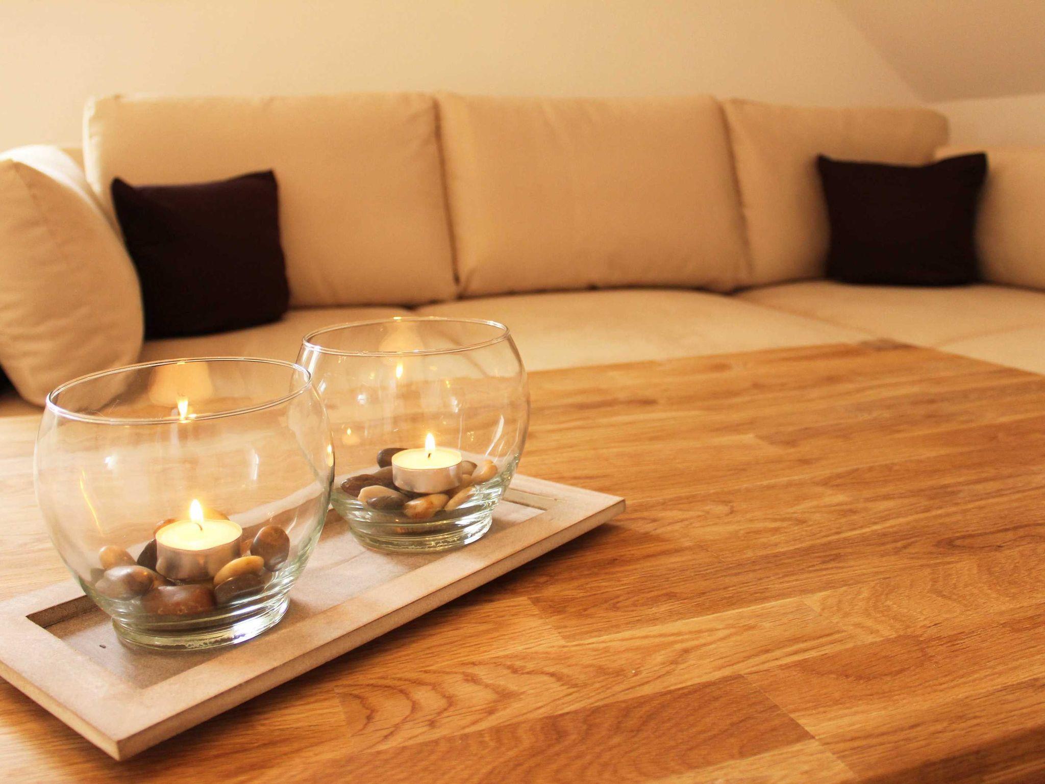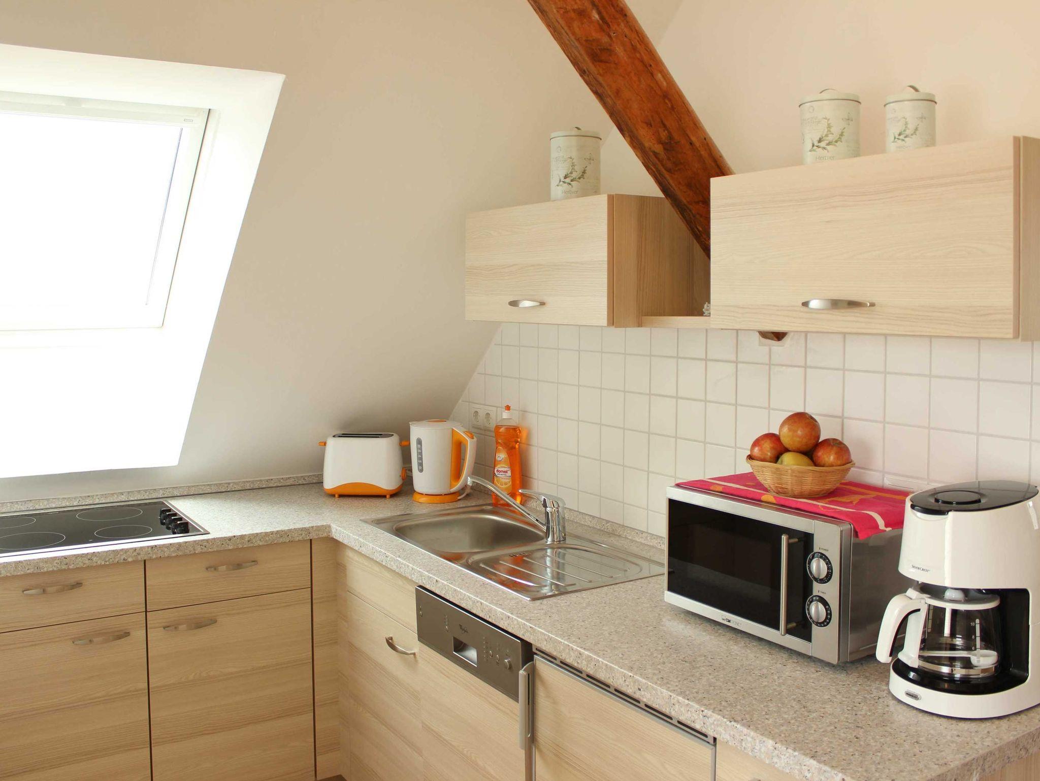 Die Wohnung ist weiterhin mit einer offenen Küche mit 4-Platten-Ceranherd, Spülmaschine, Kühlschrank mit Gefriermöglichkeit, Mikrowelle, Kaffeemaschine, Wasserkocher und Toaster sowie einem Esstisch ausgestattet. Die Erstausstattung Bettwäsche und Handtücher ist bereits im Gesamtpreis enthalten.