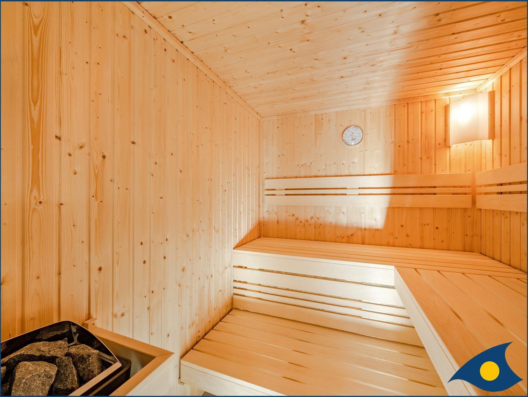 Das großzügige Badezimmer im Erdgeschoss verfügt über eine Sauna und eine Dusche.