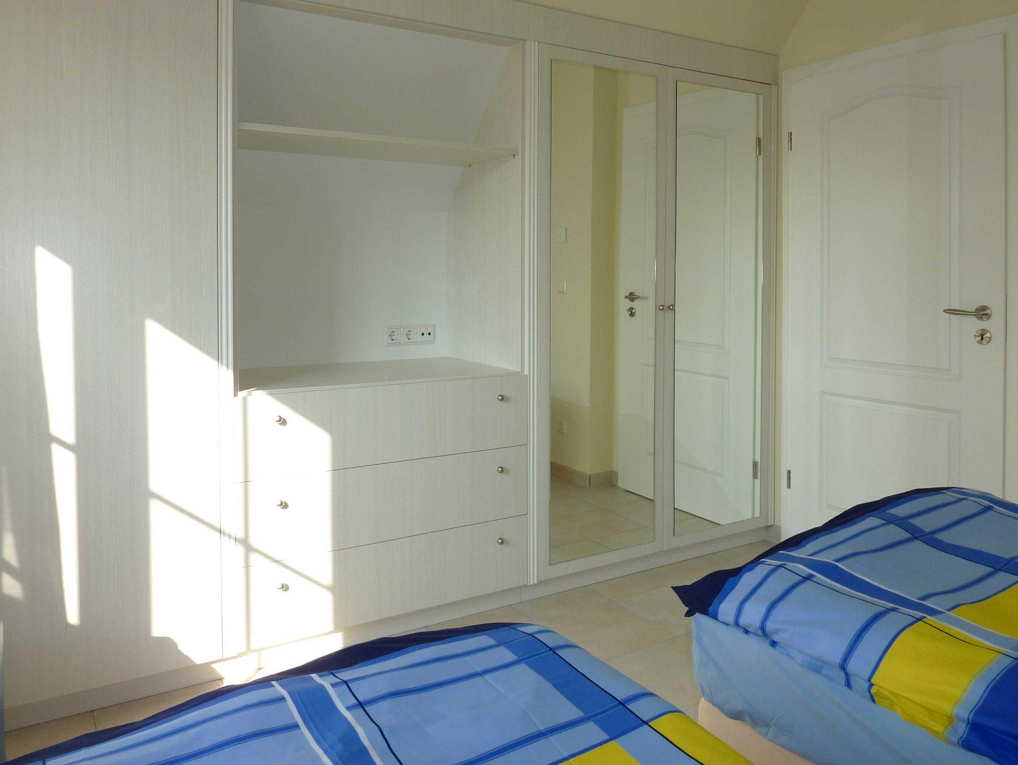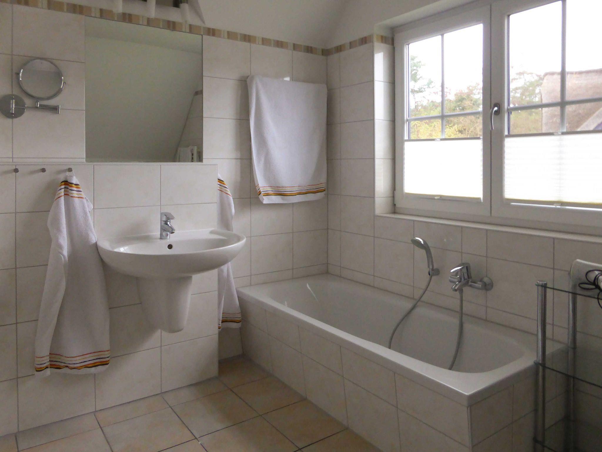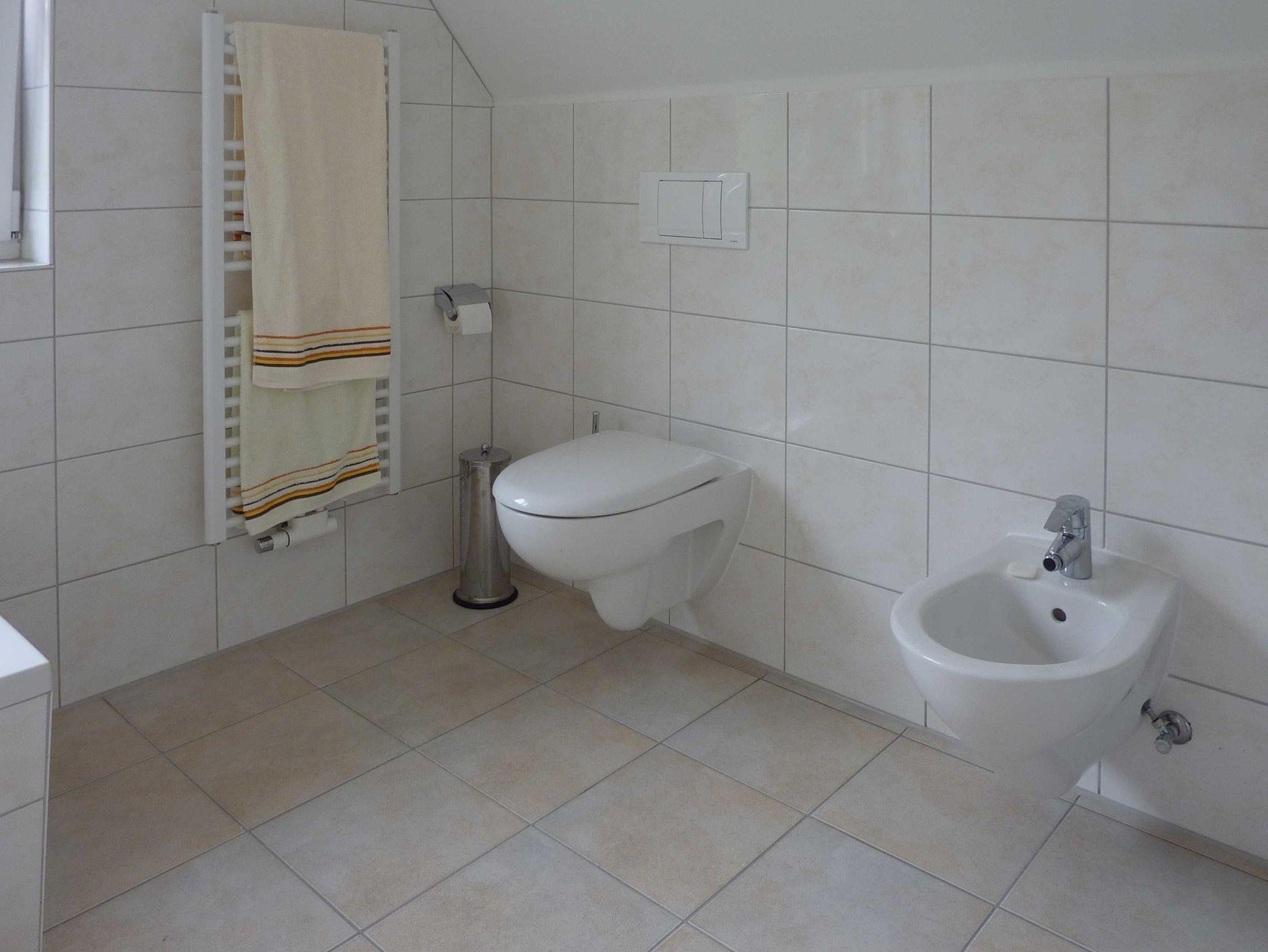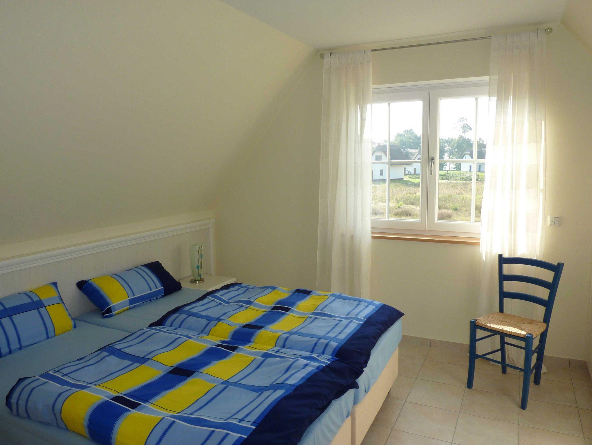 Im Obergeschoss liegen zwei Schlafräume mit Doppelbetten bzw. individuell einstellbar 2 getrennten Betten. Die zusätzliche Aufbettung auf der Schlafcouch im Wohnraum ermöglicht 2 weitere Schlafplätze. Für Kleinkinder ist ein Kinderreisebett und Kinderstuhl vorhanden. Als weiteres befindet sich im OG das Bad mit Waschbecken, Badewanne, Toilette, Bidet und separater Dusche.