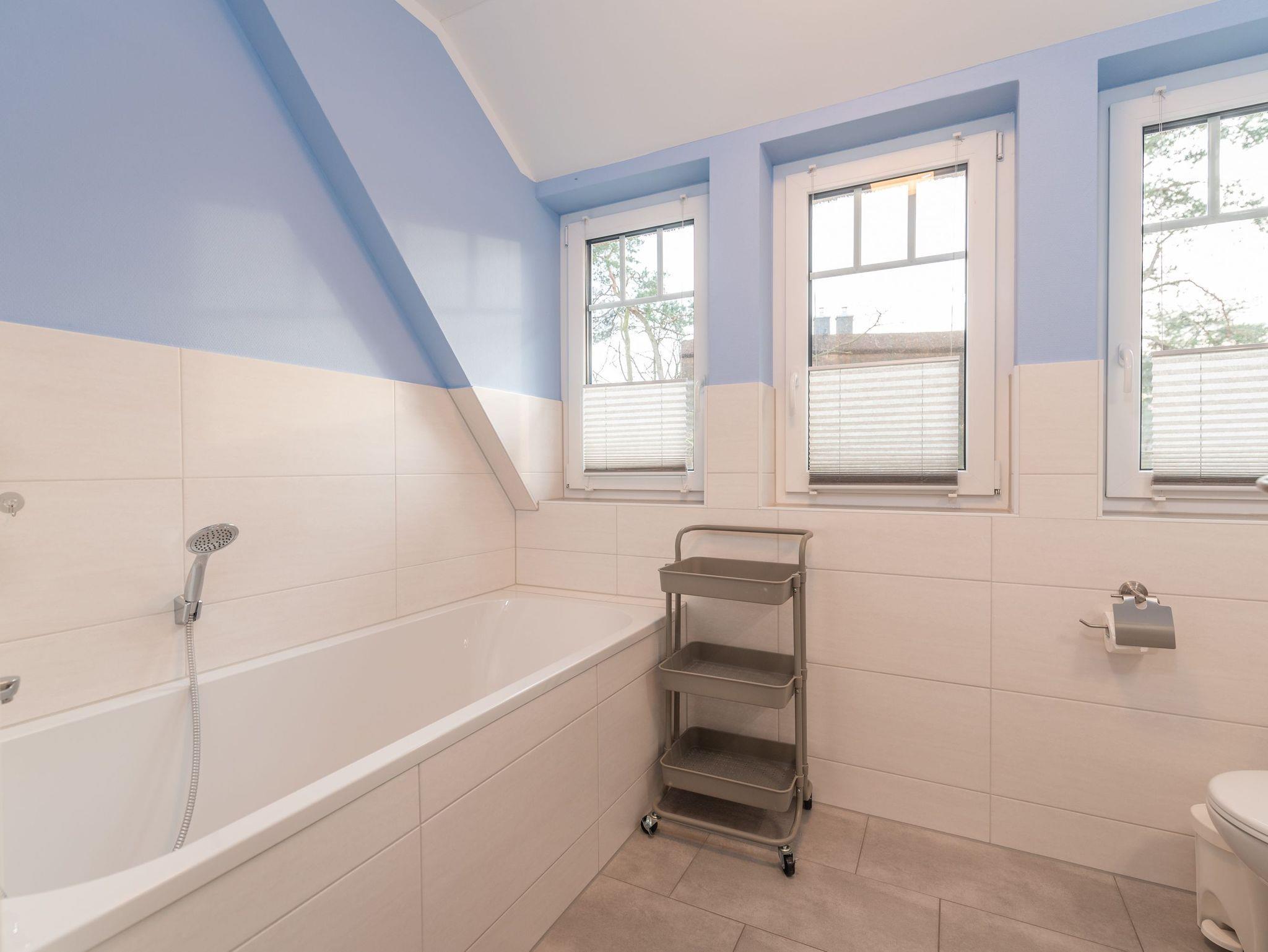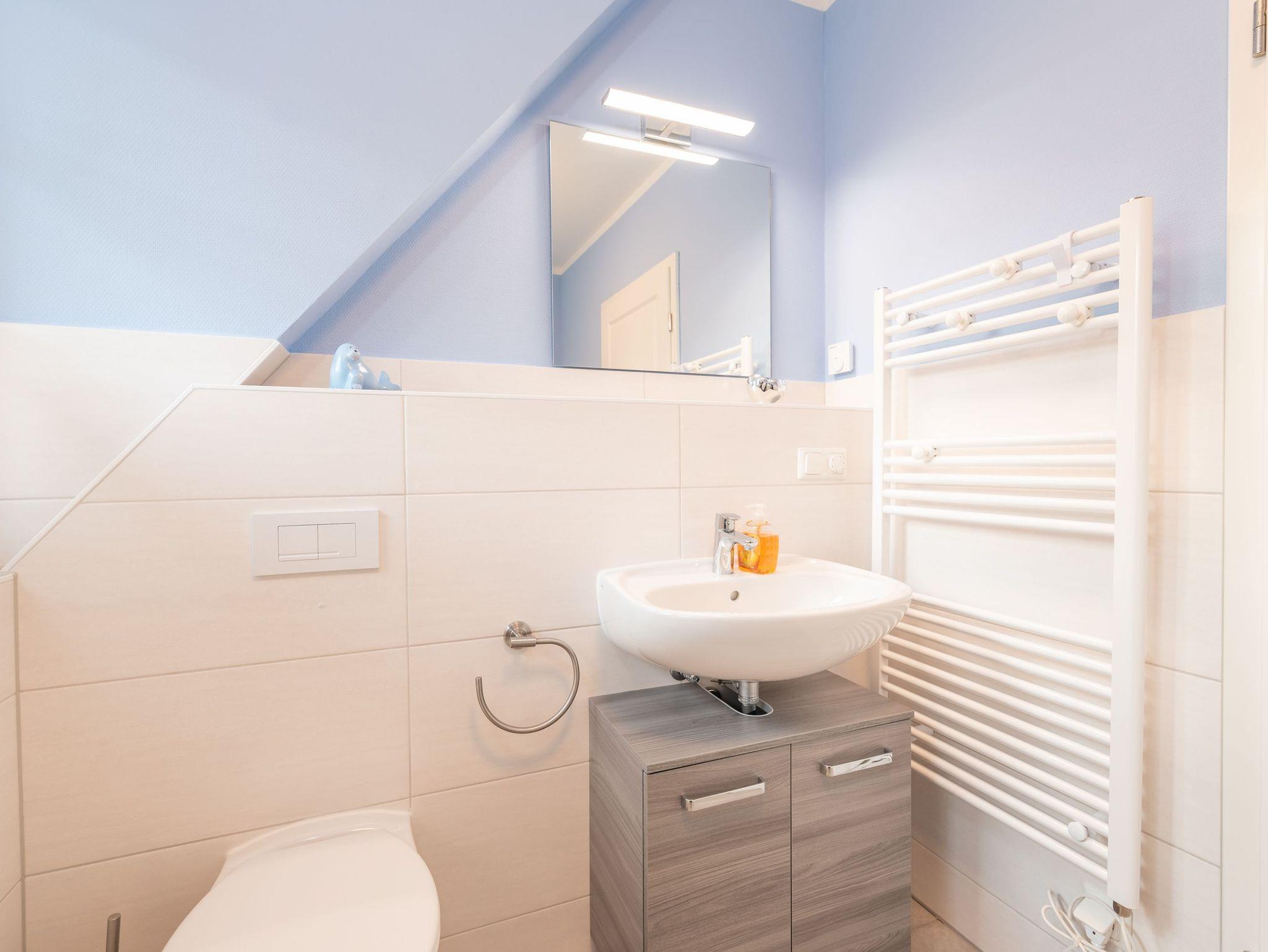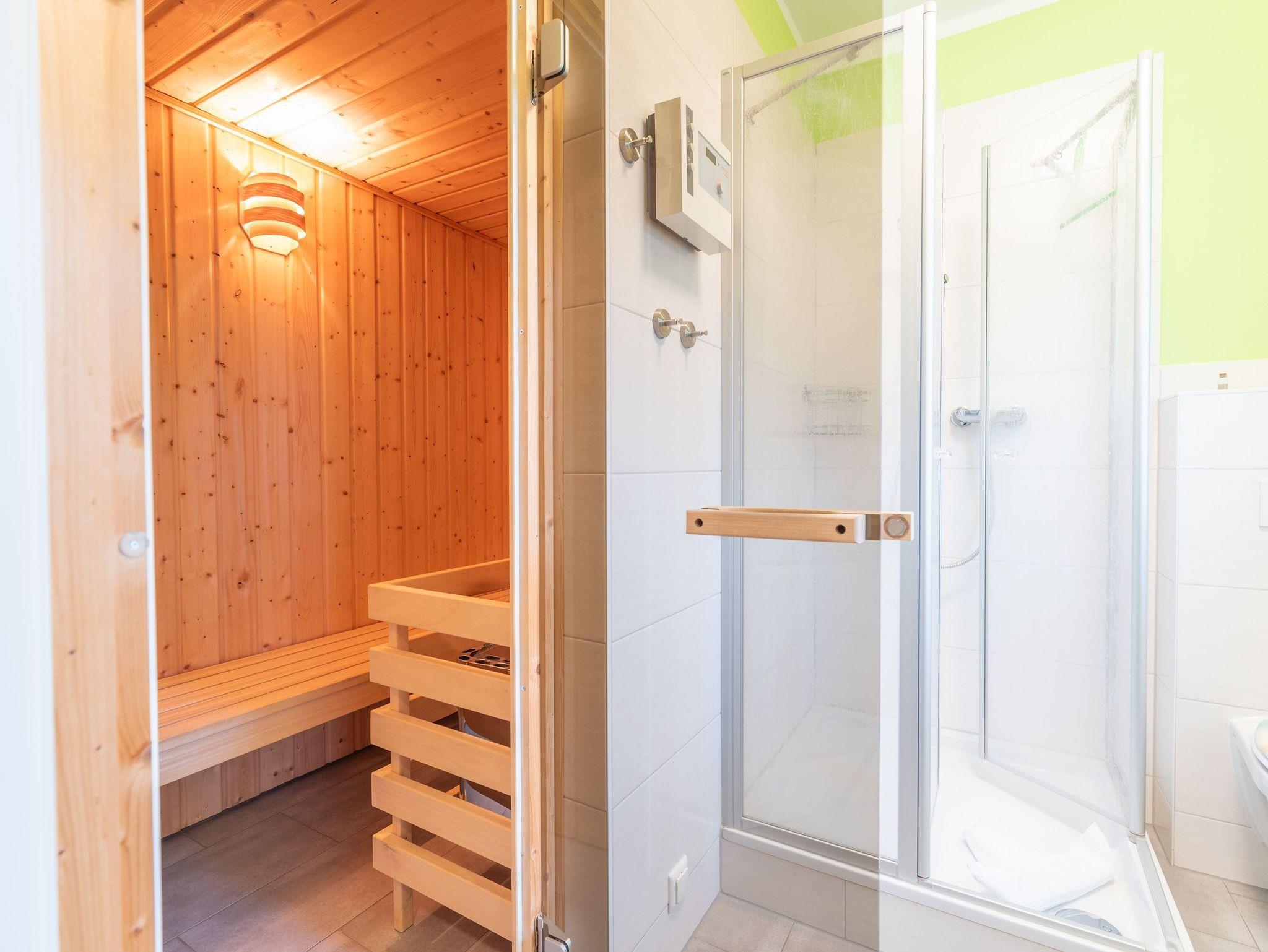 Für Komfort auf zwei Ebenen sorgen zwei Badezimmer: Im unteren Bereich erwartet Sie eine Dusche, ein WC und eine Sauna, die Entspannung pur verspricht. Das obere Badezimmer ist mit einer Badewanne und einem WC ausgestattet und rundet das Wohlfühlangebot ab.