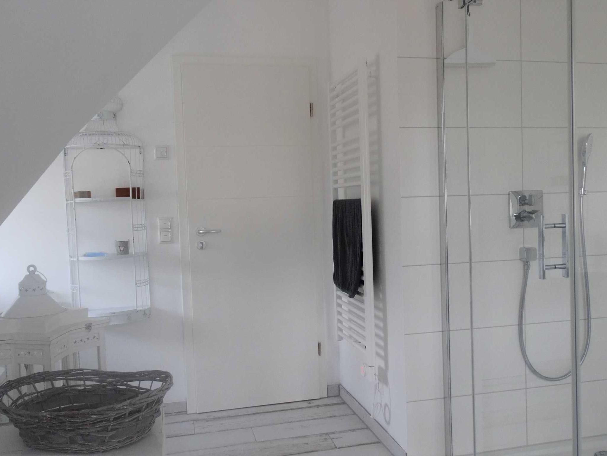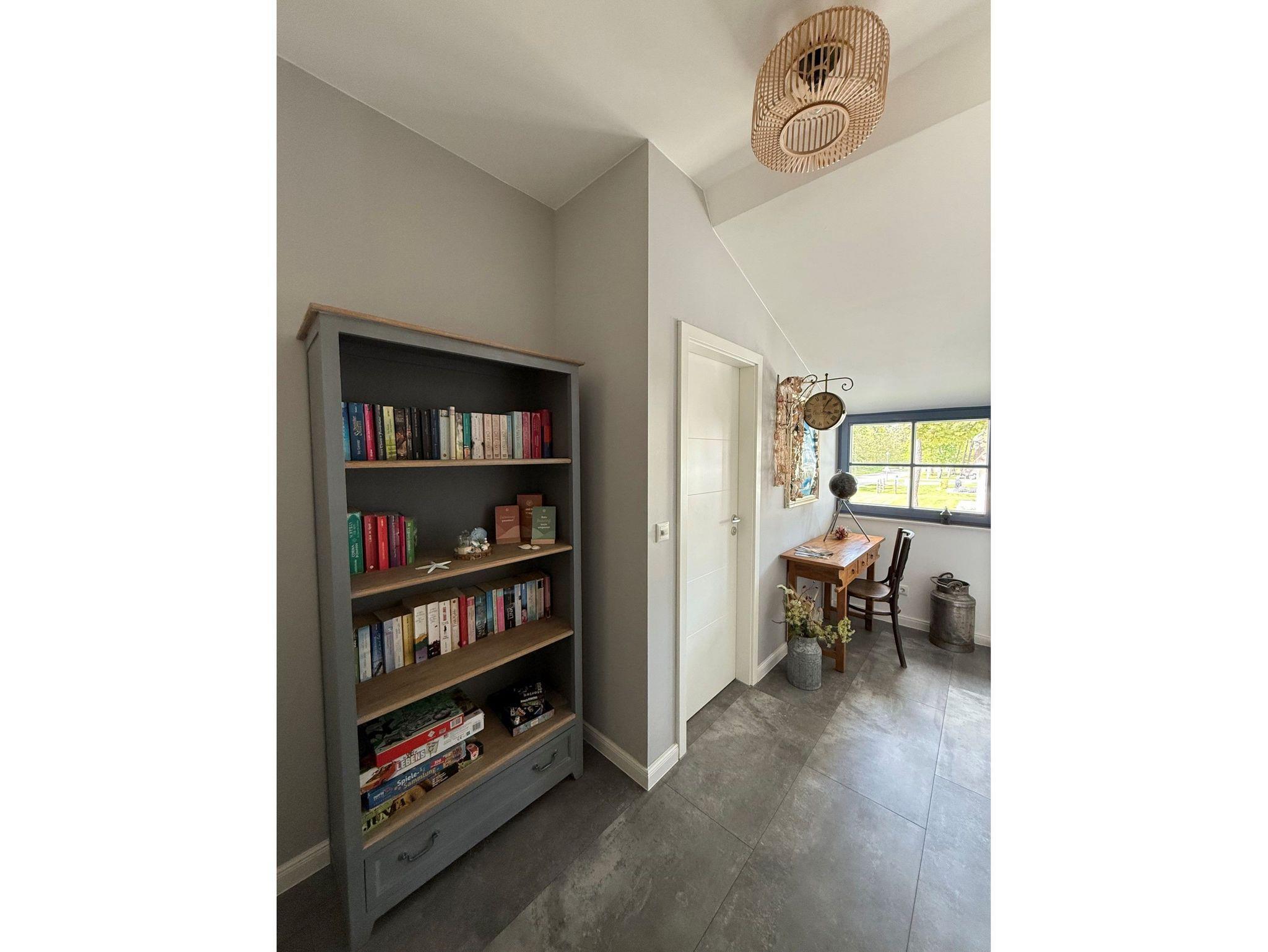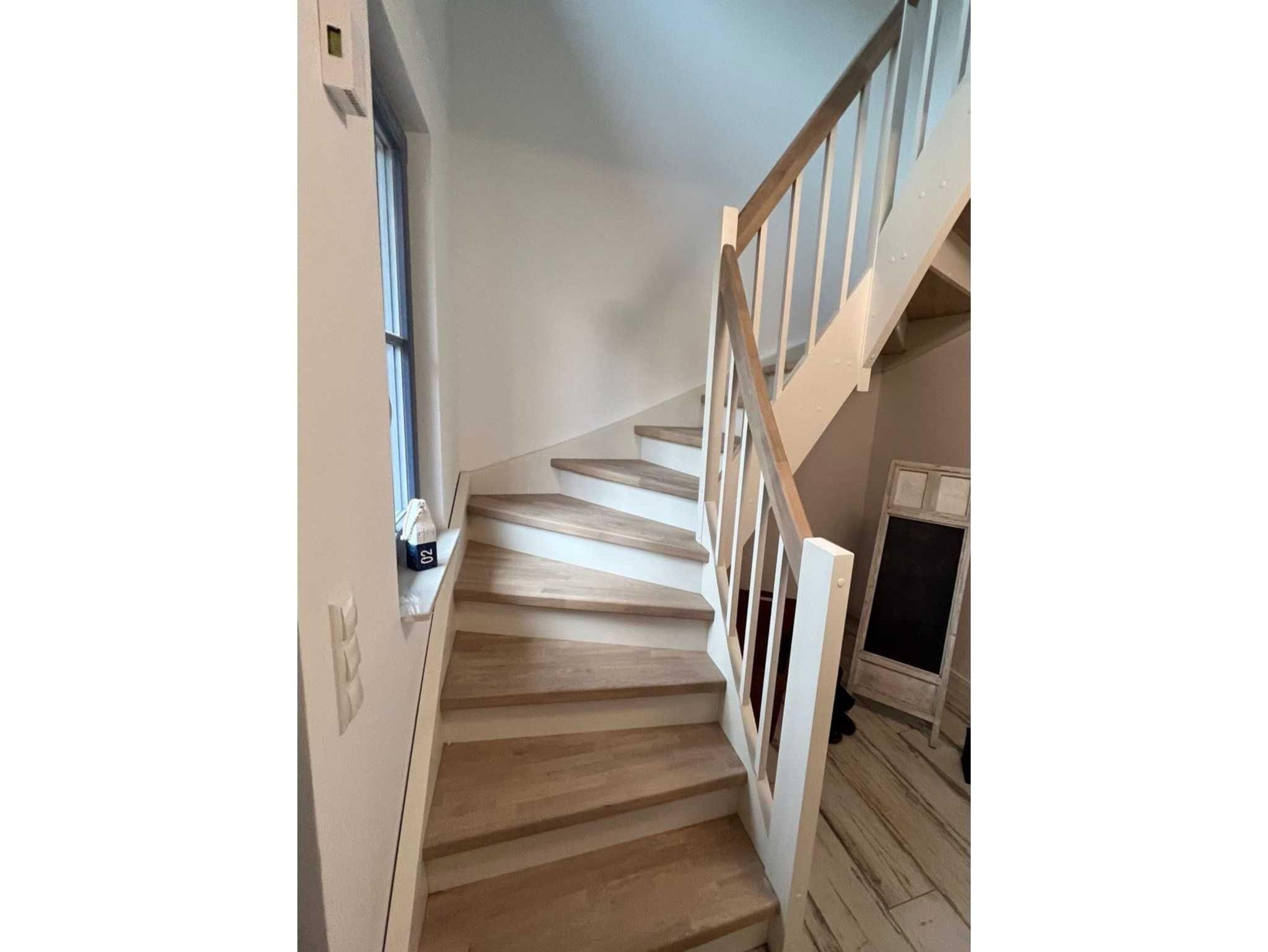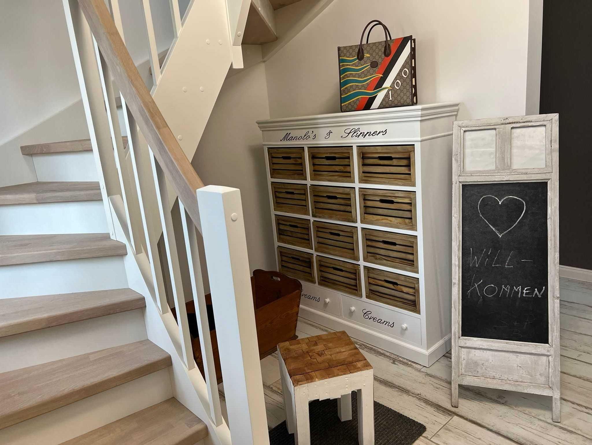 Beim Betreten des Hauses erwartet Sie ein heller, offener Flur mit großem Spiegel, viel Platz für Ihre Schuhe & Taschen sowie Ihre Garderobe. Über eine geschlossene Holztreppe gelangt man ins Obergeschoss.