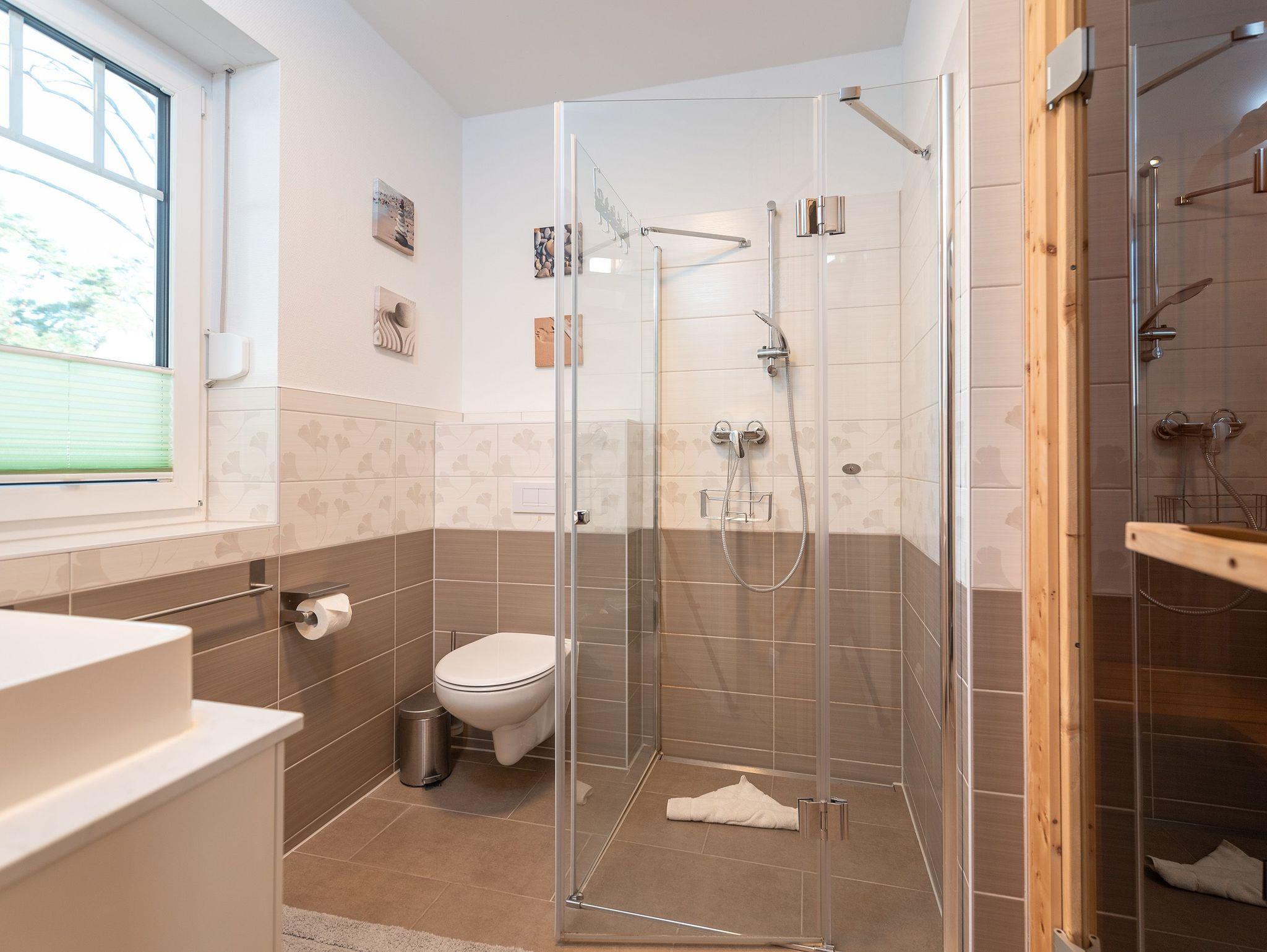 Für Ihr Wellness-Erlebnis sorgen zwei exklusive Bäder. Im Erdgeschoss lädt eine moderne Dusche zum Frischmachen ein, gefolgt von entspannenden Momenten in der hauseigenen Sauna. Das Badezimmer im Obergeschoss verführt mit einer geräumigen Badewanne perfekt für ein duftendes Schaumbad.