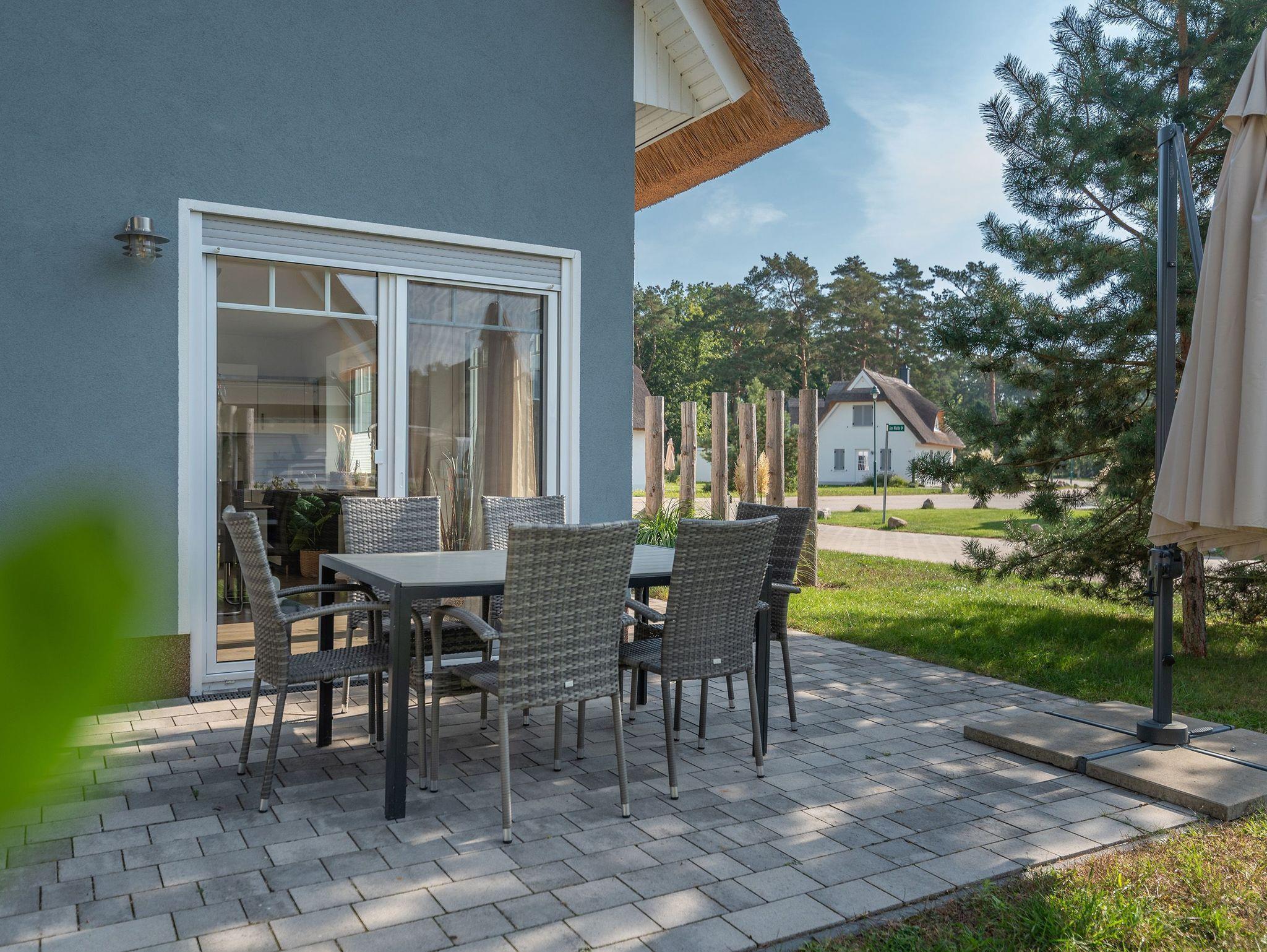 Die weitläufige Terrasse lädt zum Verweilen ein: Starten Sie mit einem Frühstück im Freien, sonnen Sie sich auf den bequemen Liegen oder genießen Sie einfach die Ruhe bei einem guten Buch.