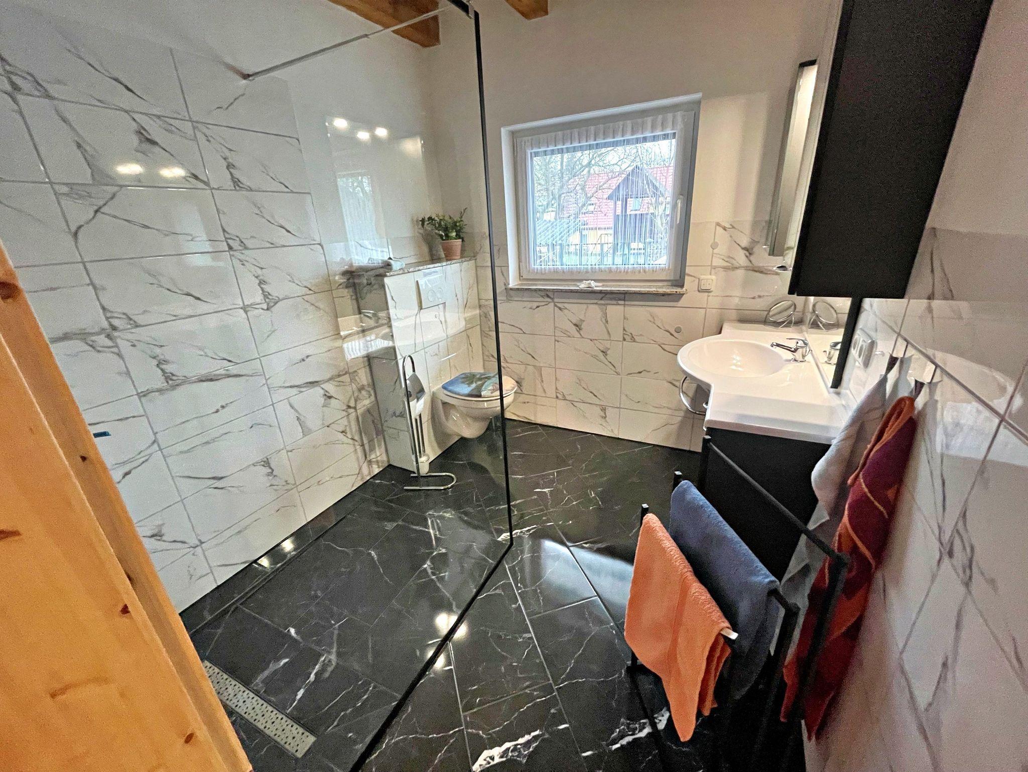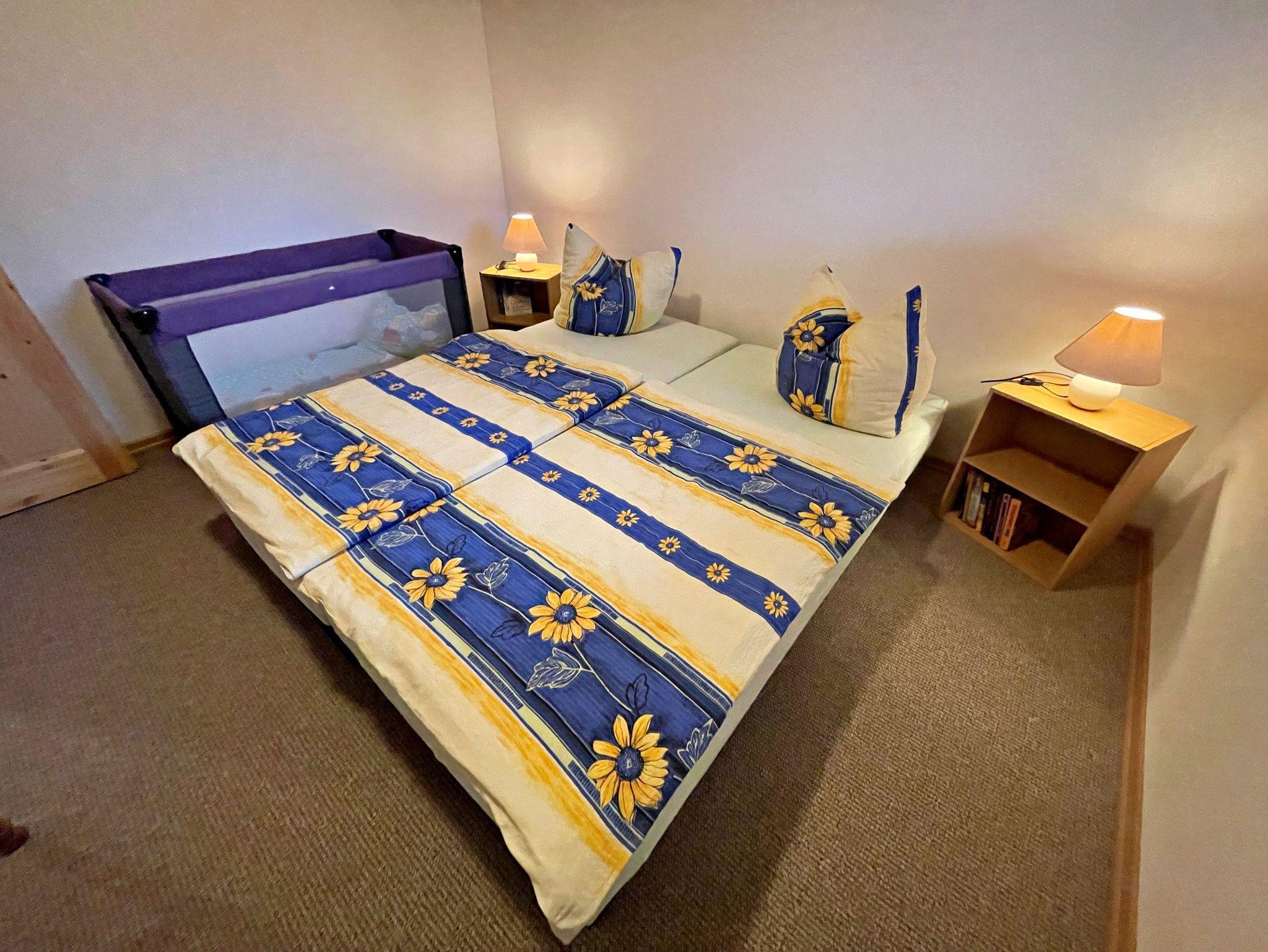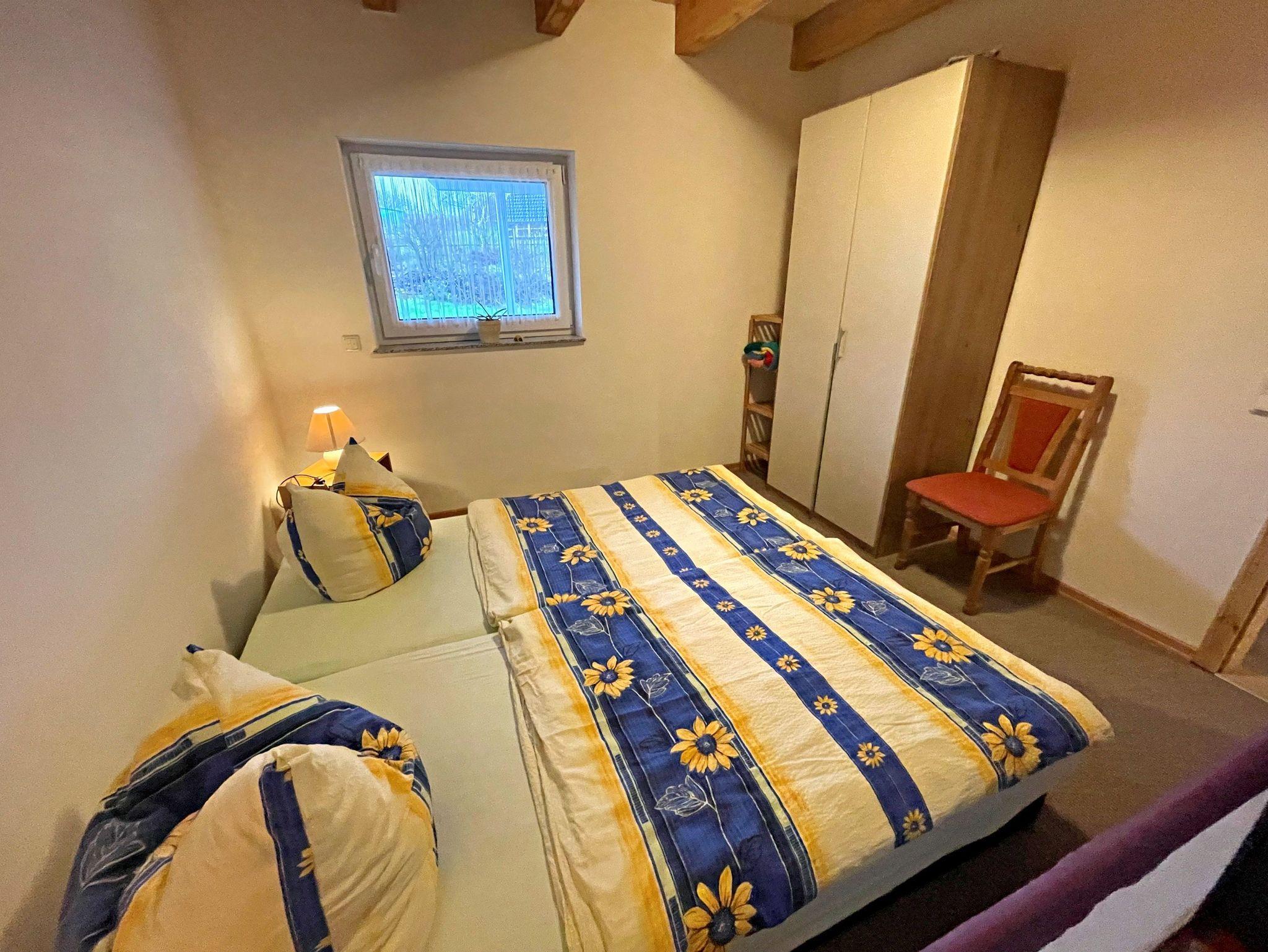 Die im Erdgeschoss gelegene 2 Raum Ferienwohnung ist ca. 56m² groß. Durch den stufenlosen Eingang und der ebenerdigen Dusche ist die Ferienwohnung für behinderte Personen sehr gut geeignet. Die Ferienwohnung verfügt über ein separates Schlafzimmer mit Doppelbett und Kinderreisebett. Selbstversorger finden eine rundum gut ausgestattete separate Küche vor, die alle Wünsche erfüllt. Eine Spülmaschine ist leider nicht vohanden. Einen separaten Essplatz gibt es im Wohnbereich. Der Wohnbereich ist weiterhin mit der großen bequemen Sitzgarnitur und Flach Bild Fernseher eingerichtet. Eine Terrasse mit Sitzmöbeln und Blick ins Grüne ist vorhanden. Hier können Sie morgens Ihren Kaffee genießen oder den Abend bei einem Glas Wein ausklingen lassen. Der Pkw-Stellplatz befindet sich auf dem Grundstück. Die Erstausstattung Bettwäsche und Handtücher sind im Preis enthalten.