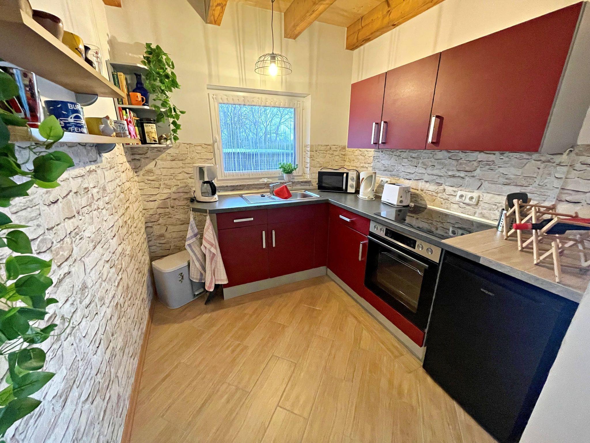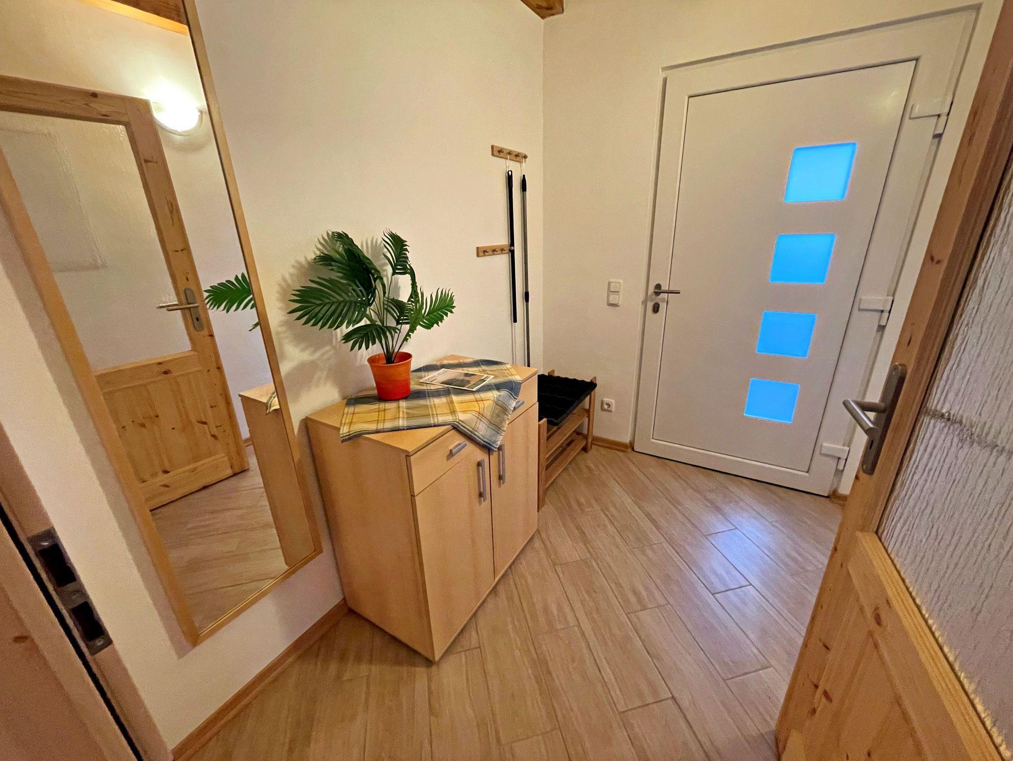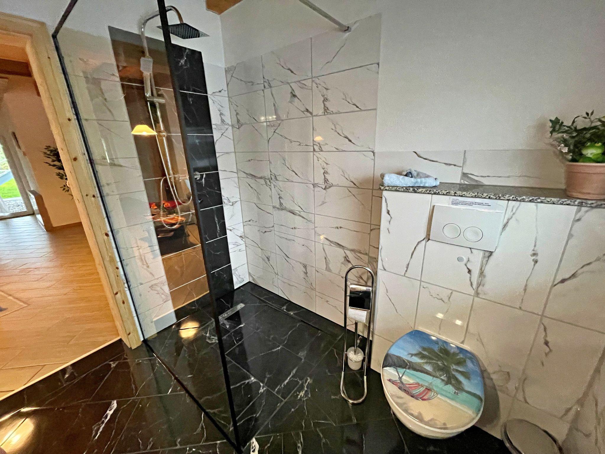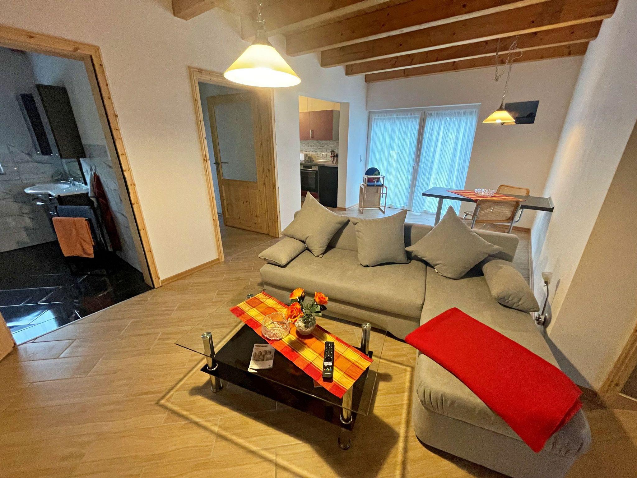 Die im Erdgeschoss gelegene 2 Raum Ferienwohnung ist ca. 56m² groß. Durch den stufenlosen Eingang und der ebenerdigen Dusche ist die Ferienwohnung für behinderte Personen sehr gut geeignet. Die Ferienwohnung verfügt über ein separates Schlafzimmer mit Doppelbett und Kinderreisebett. Selbstversorger finden eine rundum gut ausgestattete separate Küche vor, die alle Wünsche erfüllt. Eine Spülmaschine ist leider nicht vohanden. Einen separaten Essplatz gibt es im Wohnbereich. Der Wohnbereich ist weiterhin mit der großen bequemen Sitzgarnitur und Flach Bild Fernseher eingerichtet. Eine Terrasse mit Sitzmöbeln und Blick ins Grüne ist vorhanden. Hier können Sie morgens Ihren Kaffee genießen oder den Abend bei einem Glas Wein ausklingen lassen. Der Pkw-Stellplatz befindet sich auf dem Grundstück. Die Erstausstattung Bettwäsche und Handtücher sind im Preis enthalten.