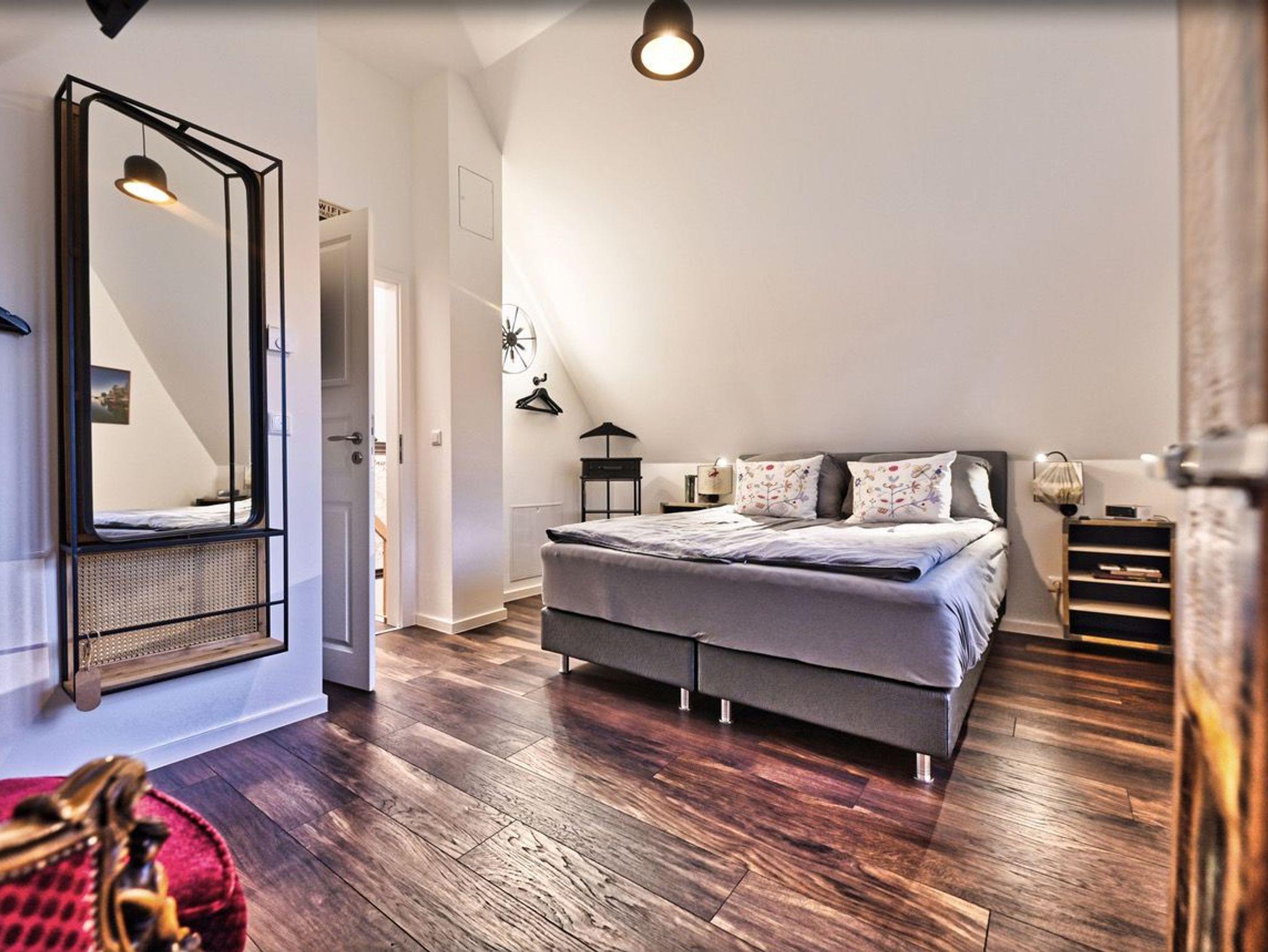 Im Obergeschoss empfängt Sie ein einladendes Schlafzimmer mit einem Doppelbett und einem urigen Kleiderschrank ausreichend Platz für Ihre Urlaubsgarderobe. Ein weiteres Schlafzimmer bietet zwei Einzelbetten mit unterschiedlichen Matratzenhärten, um Ihnen optimalen Schlafkomfort zu gewährleisten. Hier können Sie sich zurücklehnen, fernsehen oder in einem der zahlreichen Bücher schmökern. Dank Außenrollläden lassen sich alle Schlafzimmer komplett verdunkeln, sodass Sie in traumhafte Nächte eintauchen können. Ein modernes Badezimmer mit Badewanne rundet das obere Stockwerk ab.