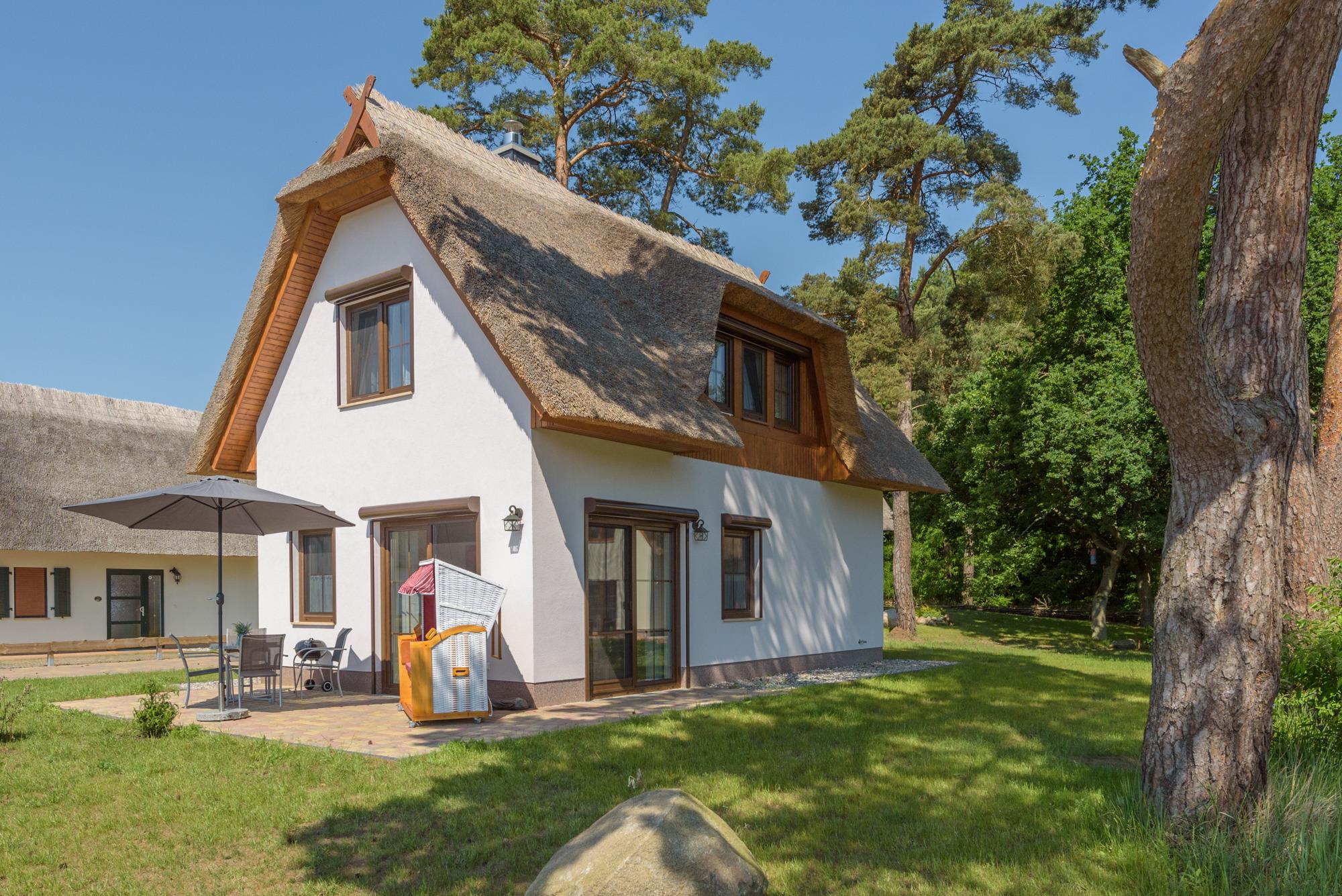 Unser reetgedecktes, 2016 erbautes Ferienhaus mit ca.650 qm, liegt in Zirchow, am Stettiner Haff in einer gepflegten Ferienhausanlage, ein abschließbarer kleiner Anbau für Fahrräder und Gartenutensilien, Wärmepumpe und einer schönen Markise