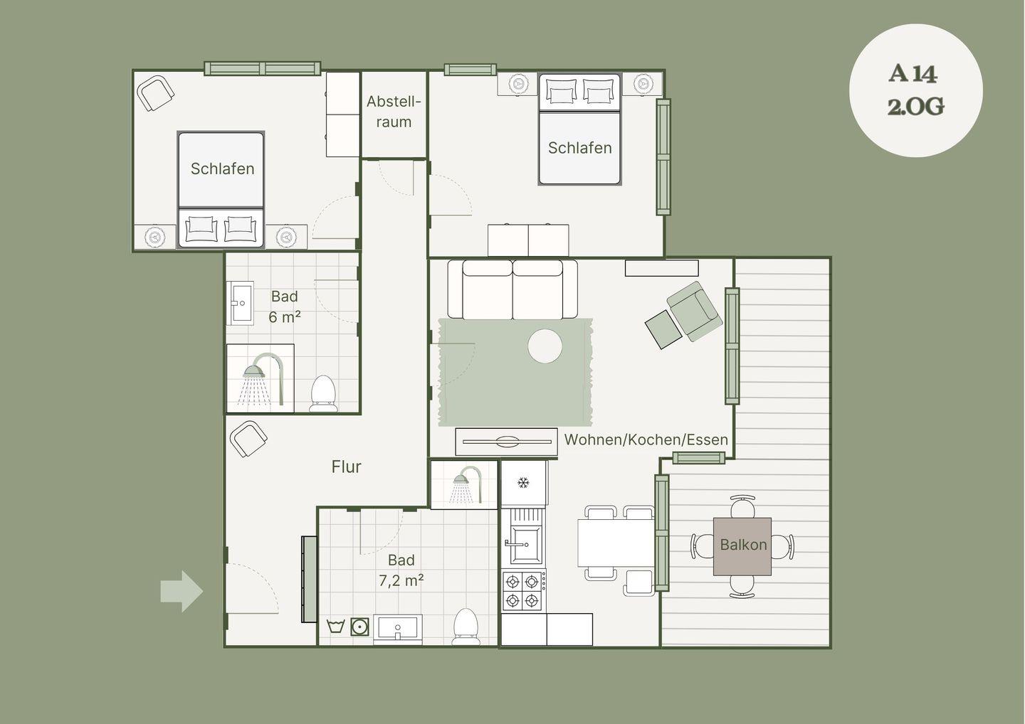 Die Ferienwohnung A14 erstreckt sich über großzügige 90 Quadratmeter und bietet Platz für bis zu sechs Gäste. Beim Betreten der Wohnung werden Sie von einer behaglichen Atmosphäre begrüßt, die von natürlichen Holzelementen und warmen Farbtönen geprägt ist. Das Wohnzimmer ist ein einladender Rückzugsort mit bequemen Sitzgelegenheiten und großen Fenstern, die die schöne Aussicht in den Raum holen.