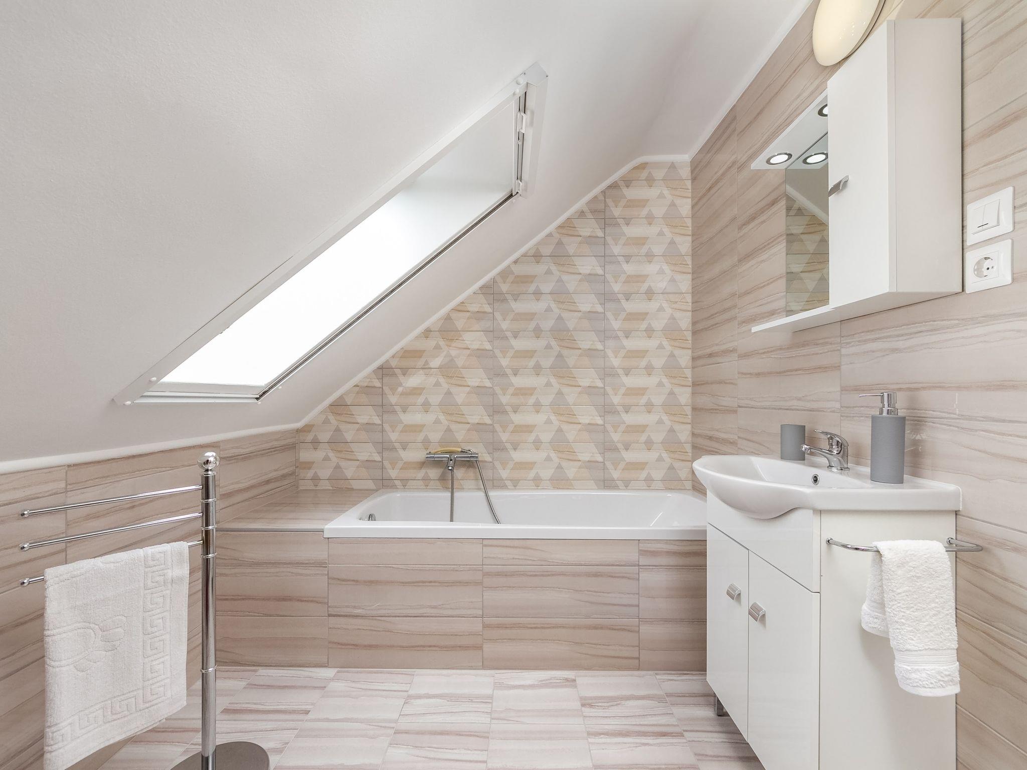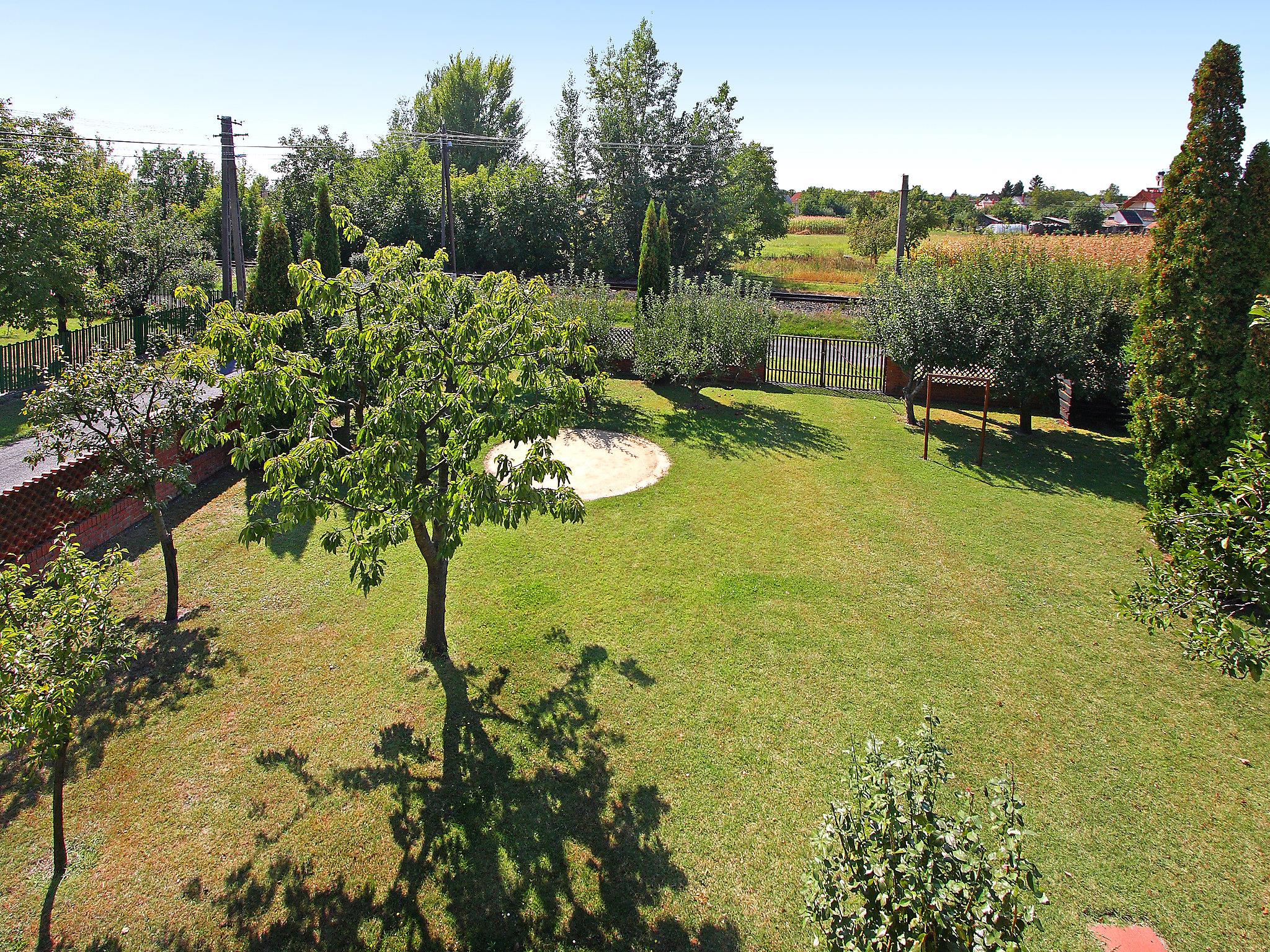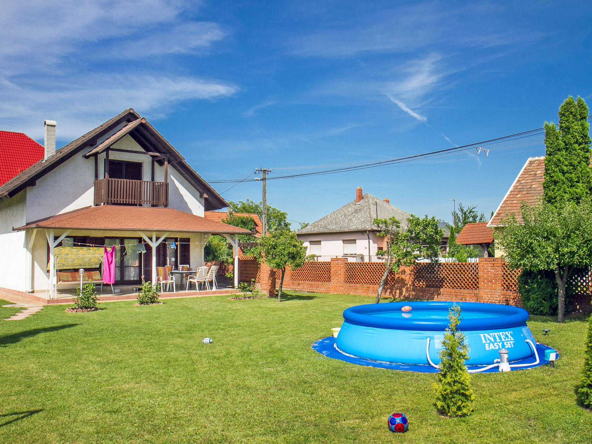 Balatonkeresztúr: Large house "Grand Jardin", 2 storeys. In a sunny position, 500 m from the lake. Private: large, beautiful garden 700 m2 (fenced) with lawn and trees, swimming pool (above ground) round (3,5 m diameter, depth 90 cm, seasonal availability: 15.May. - 15.Sep.). (swing). In the house: air conditioning. Grocery, restaurant 300 m, outdoor swimming pool 500 m.