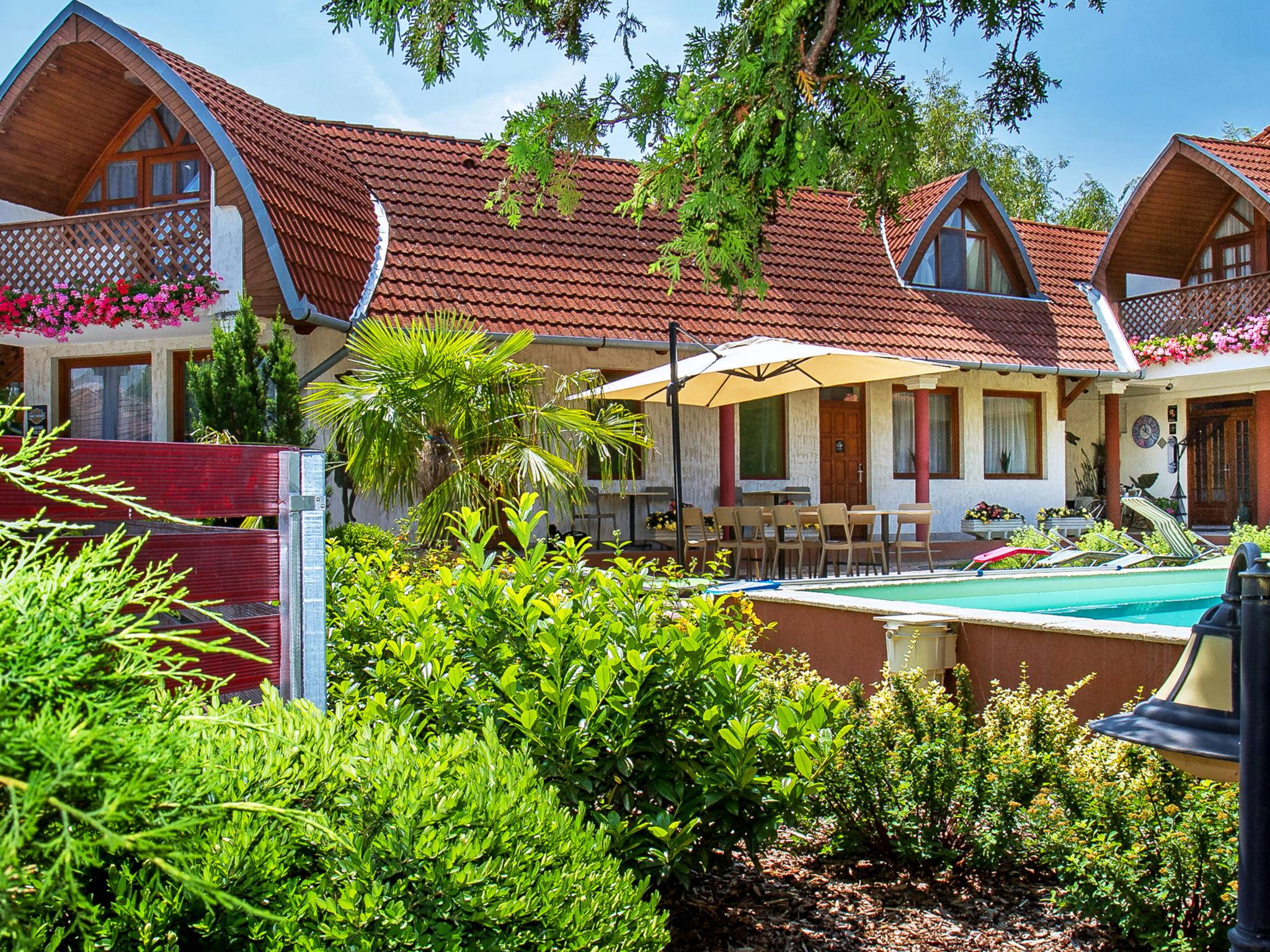 Balatonkeresztúr 20 km from Keszthely: Modern, beautiful apartment block. In the resort, 300 m from the centre, 500 m from the lake. For shared use: beautiful, well-kept garden 400 m2 (fenced), swimming pool (6 x 3 m, depth 120 cm, seasonal availability: 15.May. - 15.Sep.). In the house: WiFi, air conditioning (extra). Parking at the house. Grocery 100 m, restaurant 150 m, grass beach 500 m.