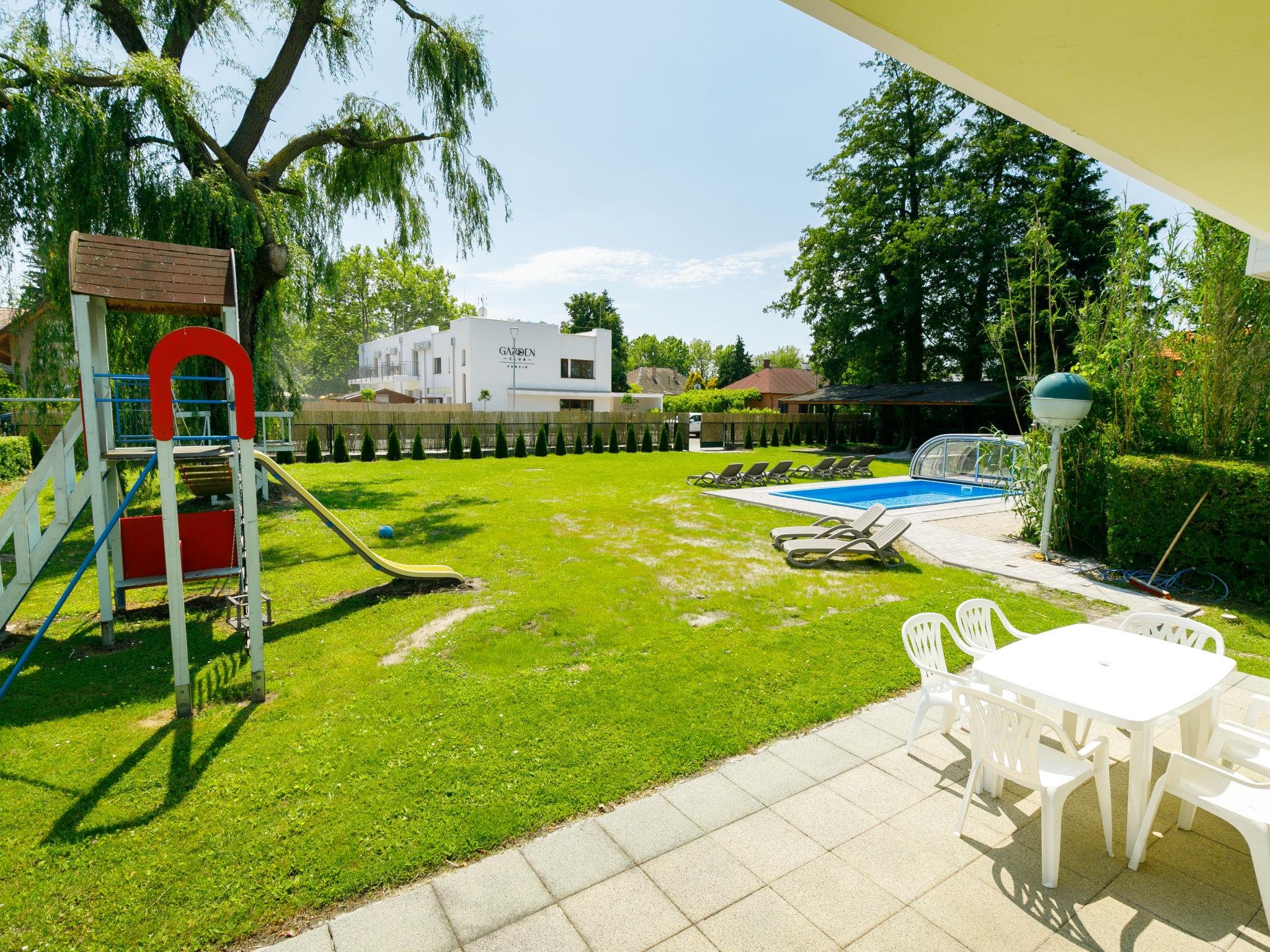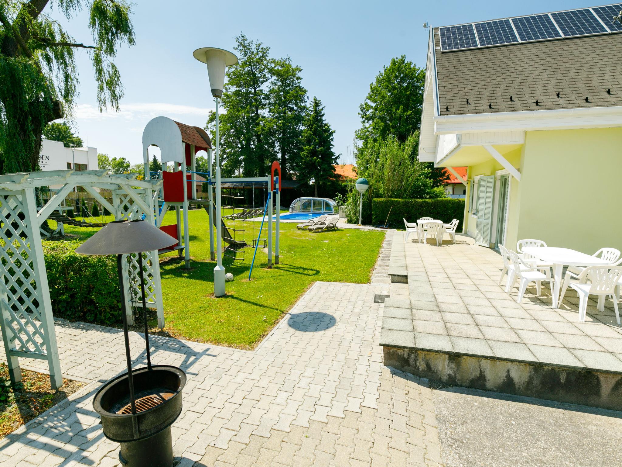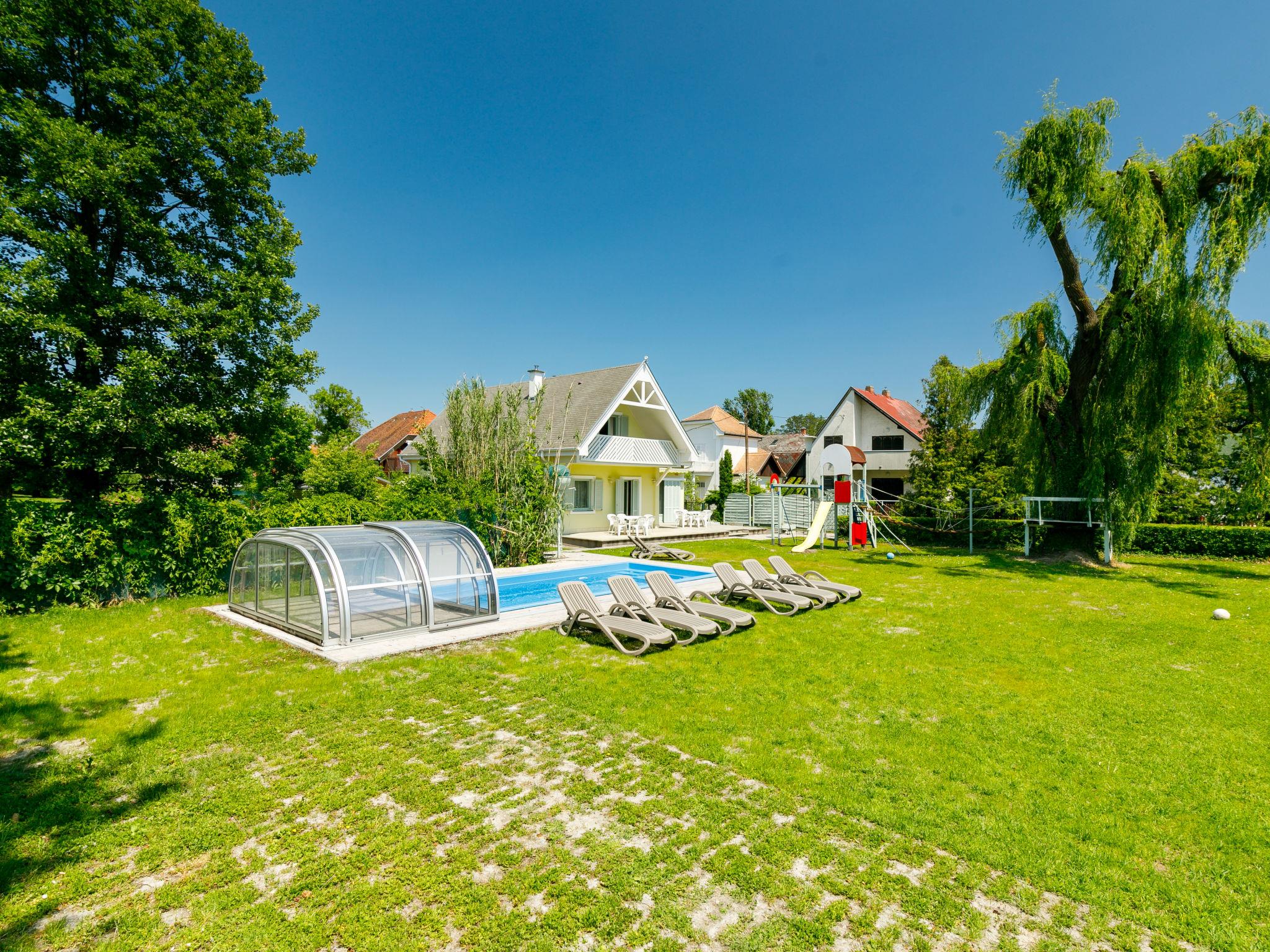 Balatonmáriafürdo 18 km from Keszthely: Child friendly, beautiful 2-family house "Sapphire", 2 storeys. In the resort, 100 m from the centre, 250 m from the lake, 200 m from the beach. Private: property 1'200 m2 (fenced), garden with lawn and flowers, swimming pool angular (6 x 4 m, depth 140 cm, seasonal availability: 15.May. - 15.Sep.). Children's playground. In the house: WiFi (all included), air conditioning (extra). Grocery 200 m, supermarket 9 km, restaurant 80 m, bakery, café, railway station 300 m, grass beach 150 m, thermal baths "Csiszta" 15 km. Surf school 7 km, sailing school 1 km, tennis 400 m, riding stable 4 km, cycle lane 50 m, children's playground 350 m, fishing possibilities 150 m. Nearby attractions: Héviz Thermal Bath 20 km, Festetics Palace 19 km, Rubin Winery 1.5 km, Airport 1.8 km, Hamvas Béla viewpoint 3 km. Please note: baby equipment on request.