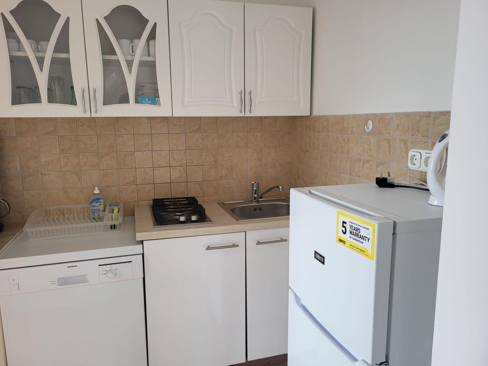Kitchen with dishwasher, toaster, kettle, microwave with grill and baking function, fridge, coffee machine.