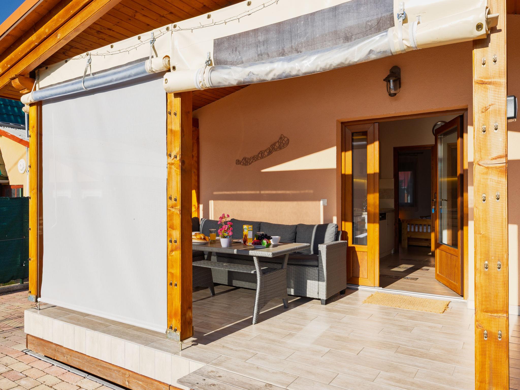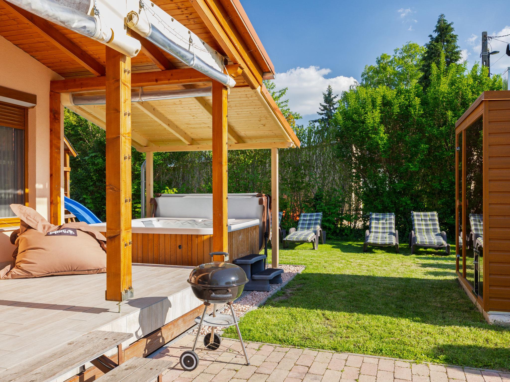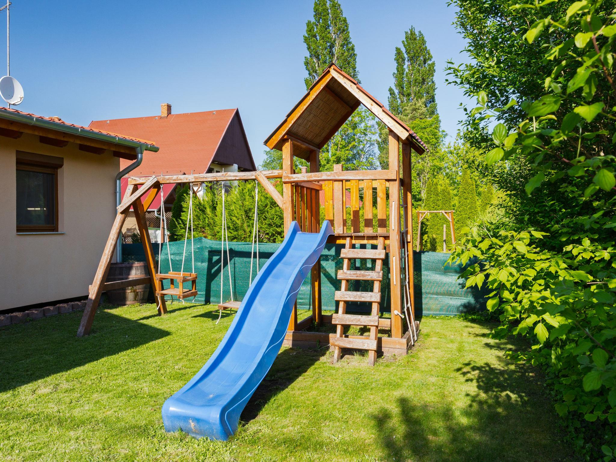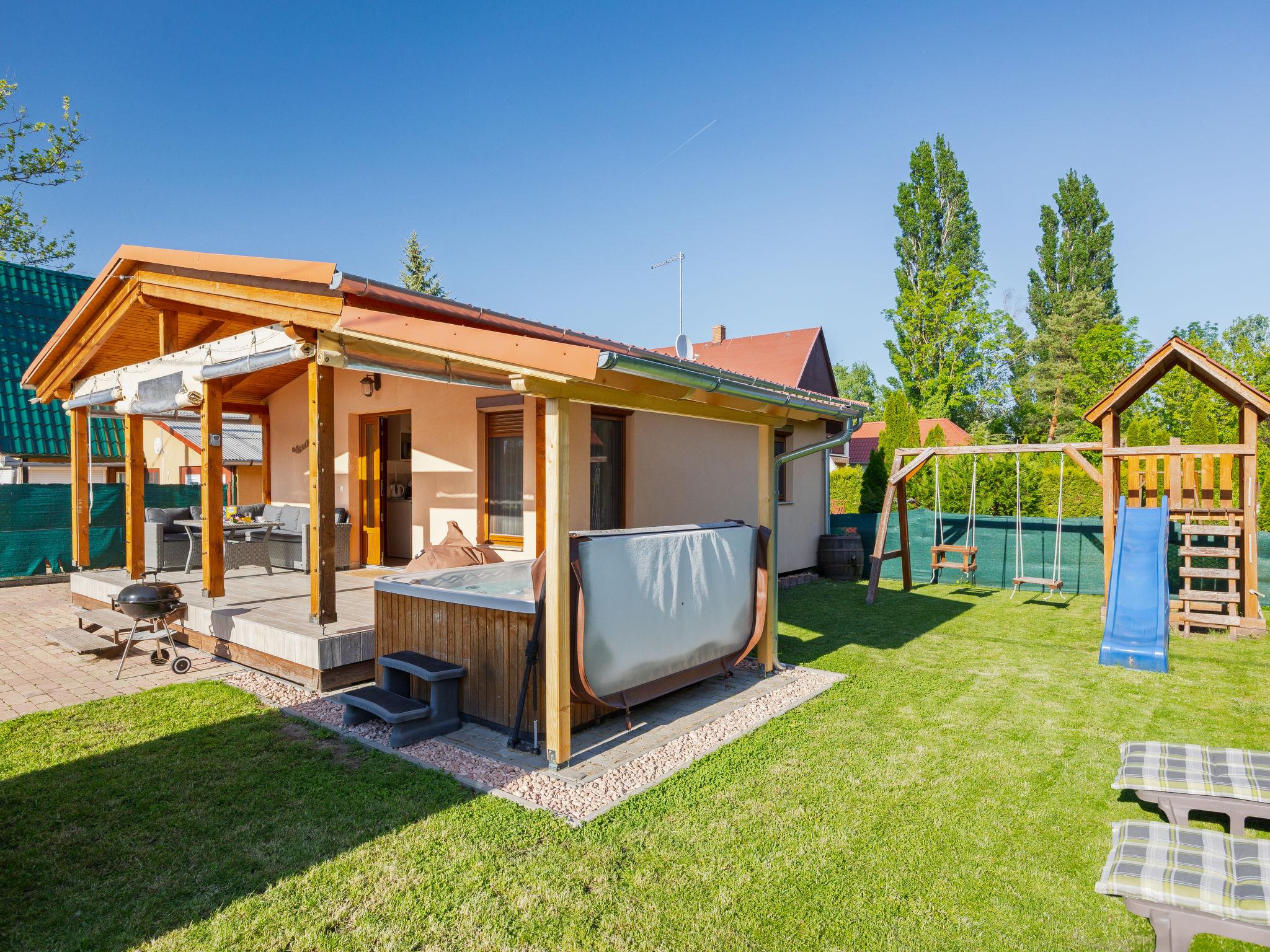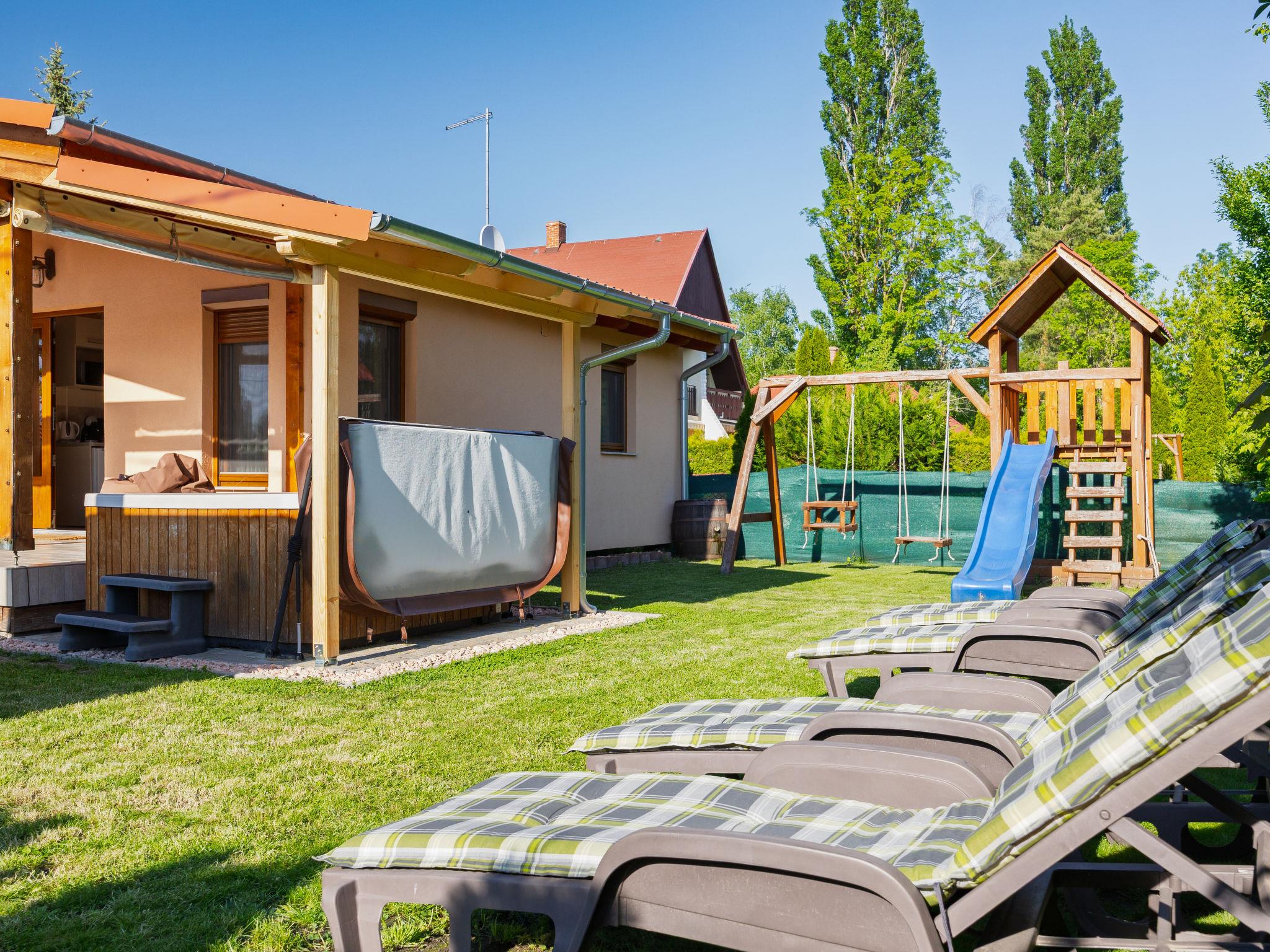 Balatonmáriafürdo 20 km from Balatonboglár: Small, cosy house "Hullám". In a quiet, sunny position, 350 m from the lake, 700 m from the beach, south-west facing position. Private: property (fenced), lawn for sunbathing. Hot tub, children's playground (slide, swing). In the house: WiFi, central heating system, air conditioning. Parking (for 2 cars) on the premises. Grocery 1.5 km, supermarket 4 km, restaurant 550 m, bicycle rental 4 km, railway station 500 m, grass beach 700 m, thermal baths "Hévíz" 29 km. Tennis 4 km, cycle lane 50 m, children's playground 700 m. Nearby attractions: Balatonlelle Giant Wheel 28 km, Kis-Balaton Visitor Center 18 km, Kereki Dino Park 49 km, Festetics Castle 24 km, Kristinus Wine Estate 12 km, Bobo Fun Park 29 km. Please note: railway line closeby 80 m from the property.